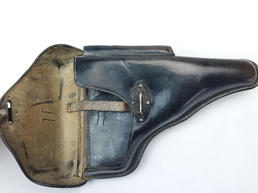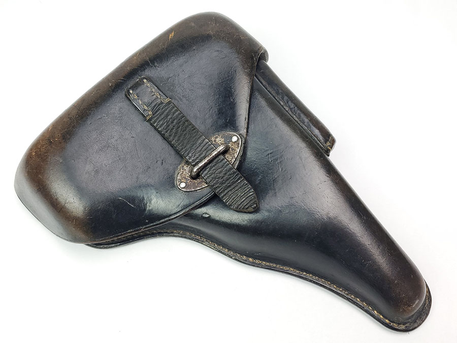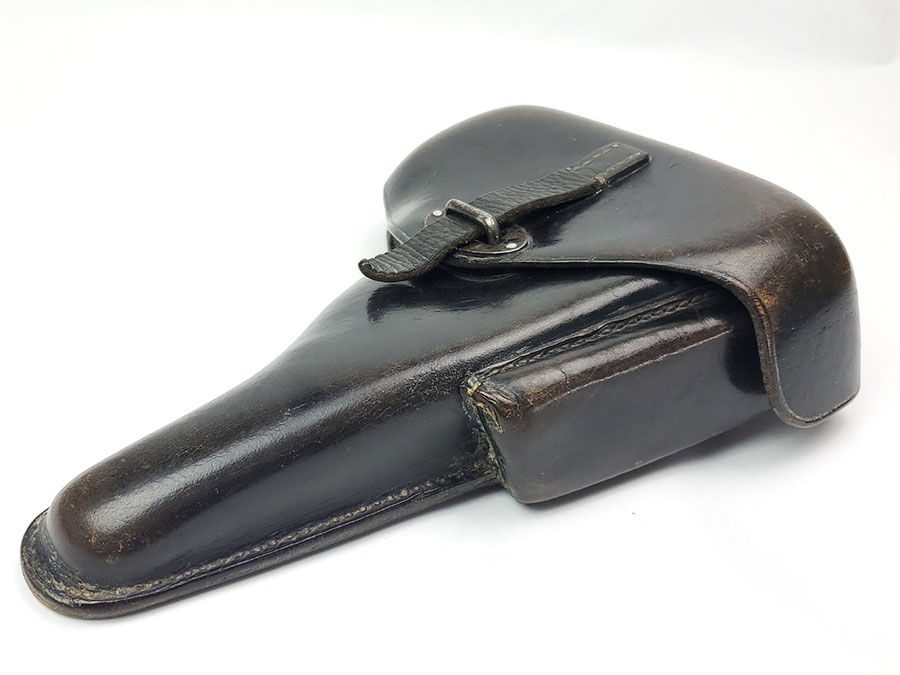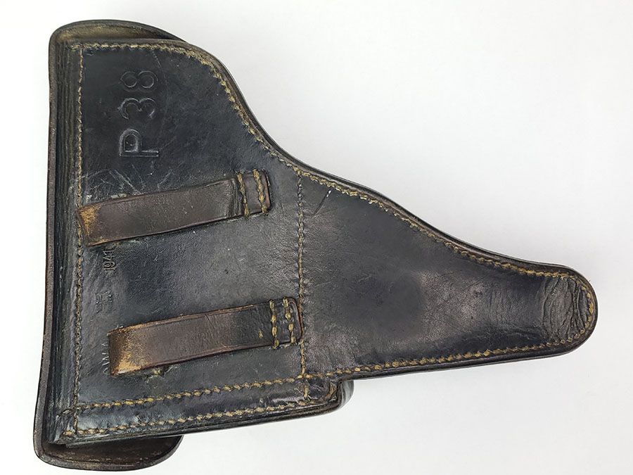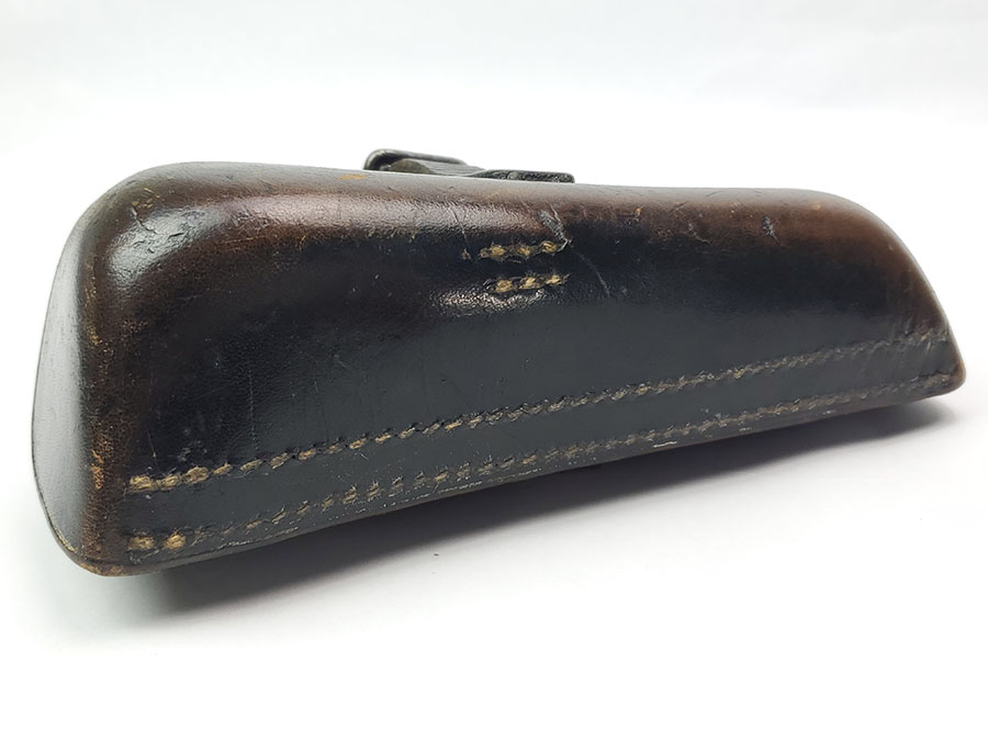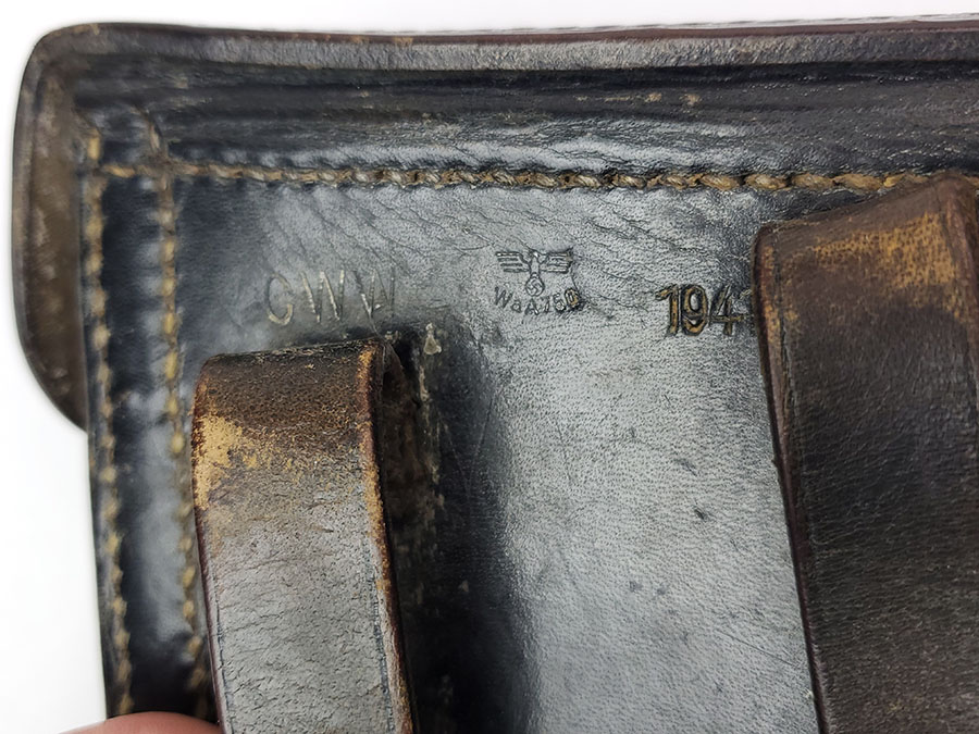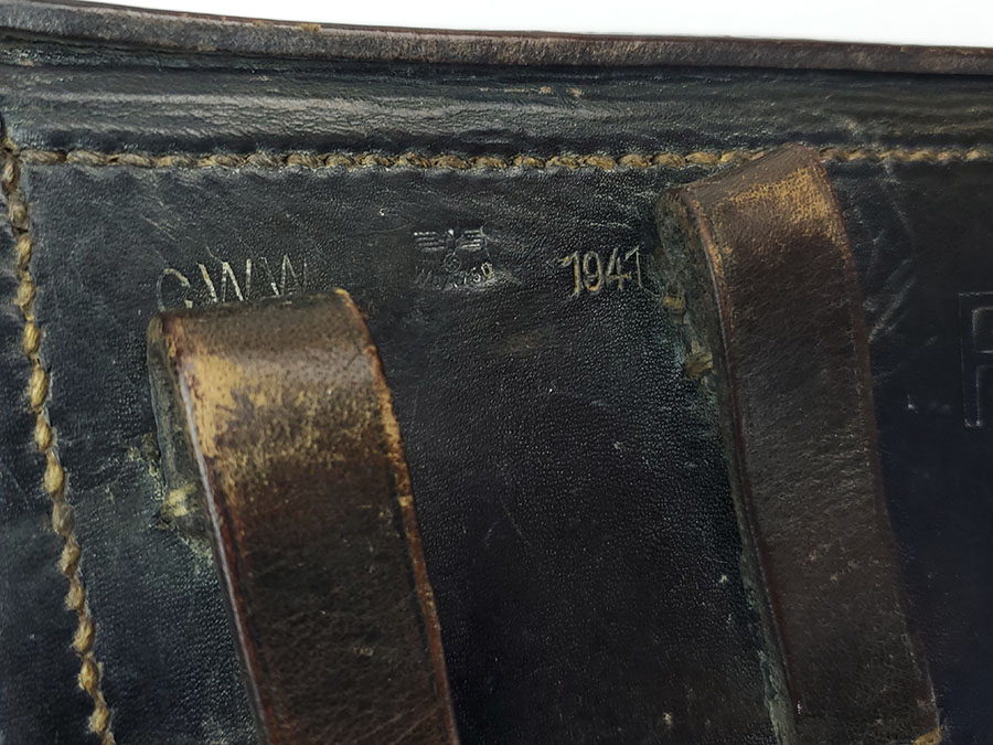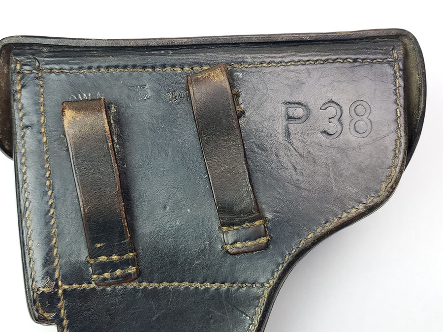 8/7/20 – This is an original 1941 dated P.38 holster from WW2. These early P.38 holsters are very scarce, especially in this condition. The holster has strong leather with light pliability and no major flaws. Some typical ink fading in areas. The stitching is all tight and original. Well stamped with a maker stamp, waffen, date, and P.38 stamp on the back leather.