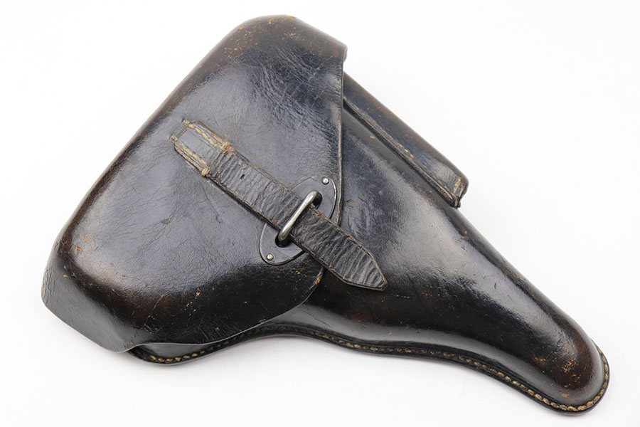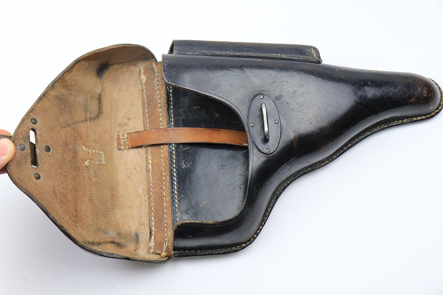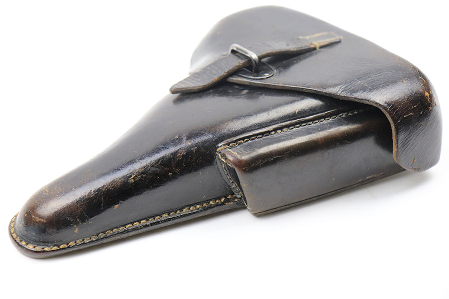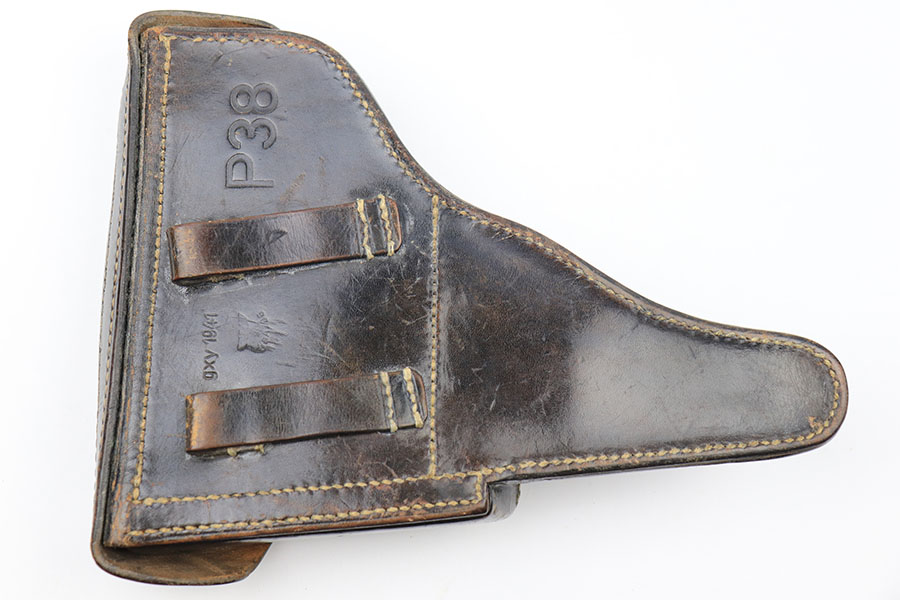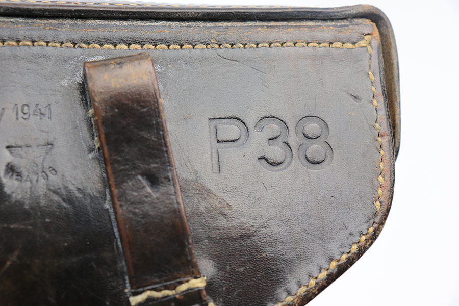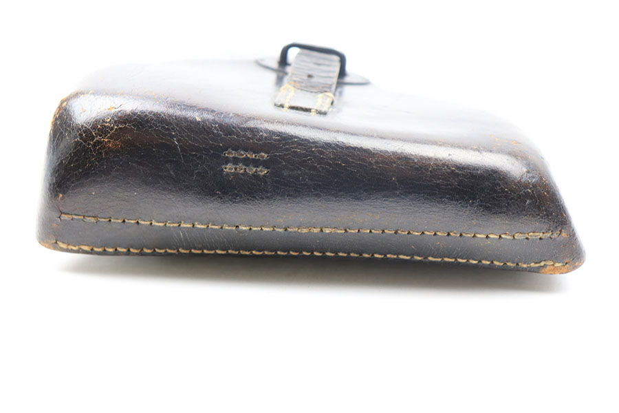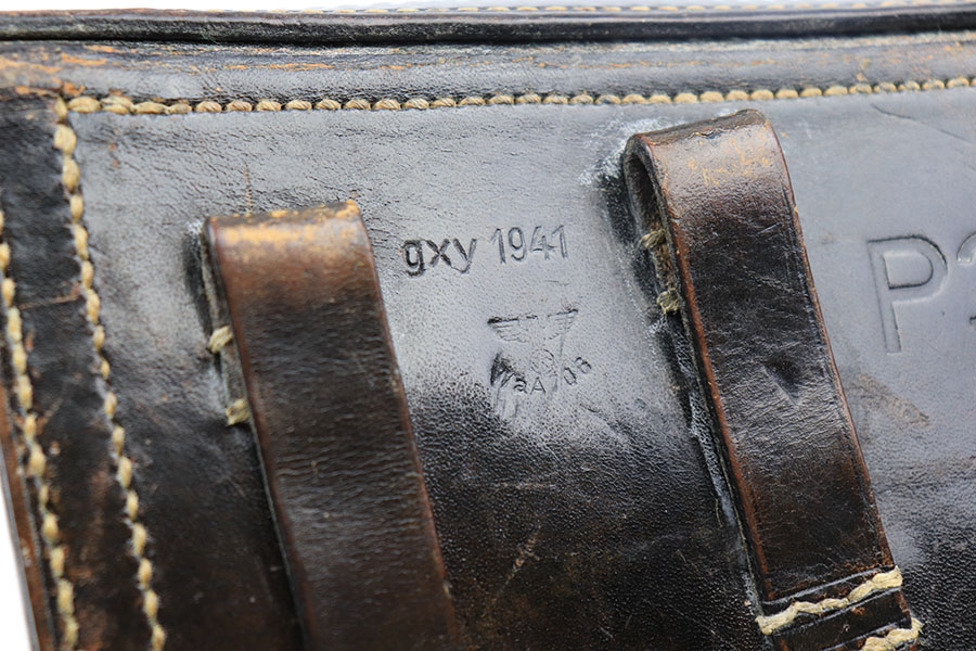 5/6/21 – This is an original, early production 1941 dated P.38 holster. The ’41 dated holsters are harder to find than most, and this example is in great overall condition. The leather is firm with some mild surface wear and wrinkling on the closure strap. Clean interior leather. Excellent all original stitching intact. The back leather is dated, waffen proofed, and maker stamped.