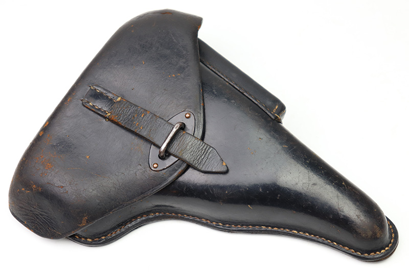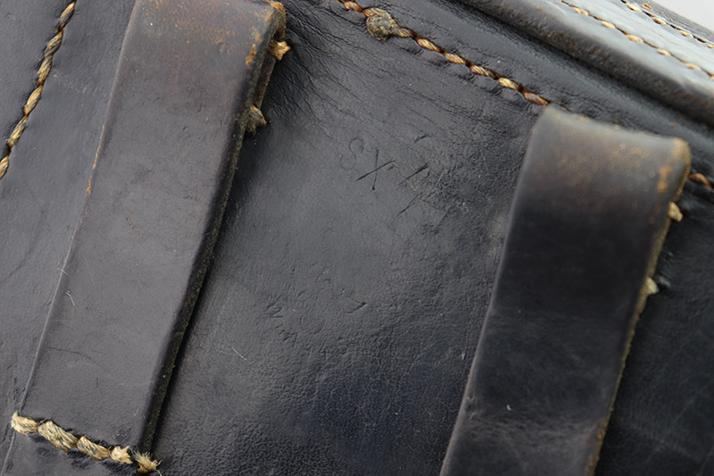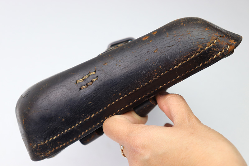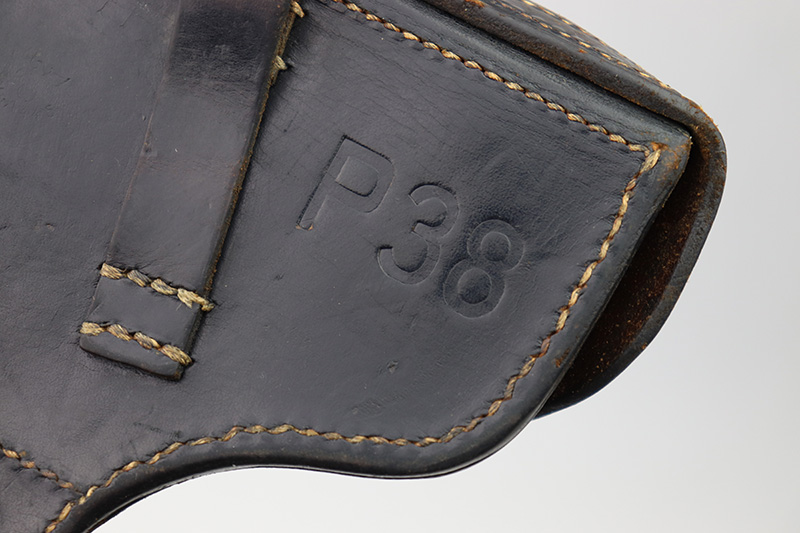 8/22/22 – This is an original 1941 dated P.38 holster from WW2. The holster is maker stamped “fsx 41” on the back leather. These stamps are faint but still visible, and are a fairly uncommon combination of date and maker. There’s a waffen military proof stamp under these markings as well as a P.38 stamp on the back leather. The leather is in great overall condition. Minimal pliability and most of the wear is found on the lid piece of leather and closure strap. There’s some surface wrinkling and mild scuffing / surface wear. Nice interior leather. No notable stitching issues.