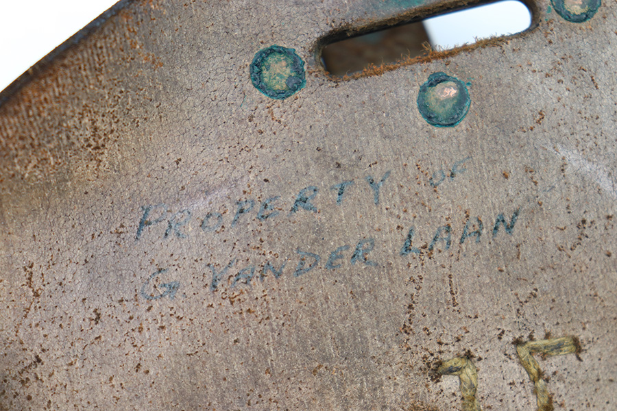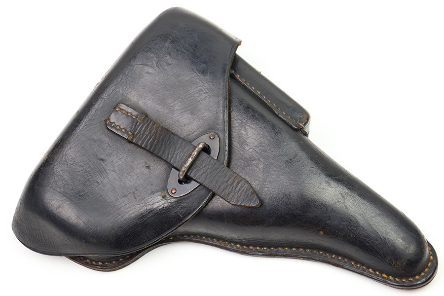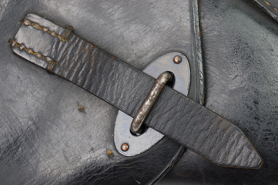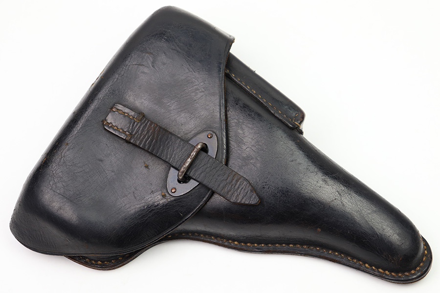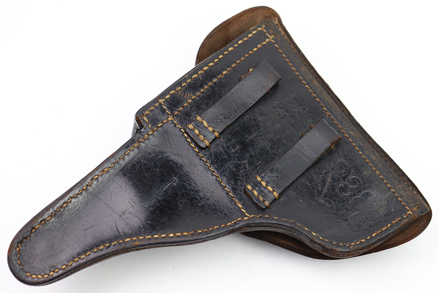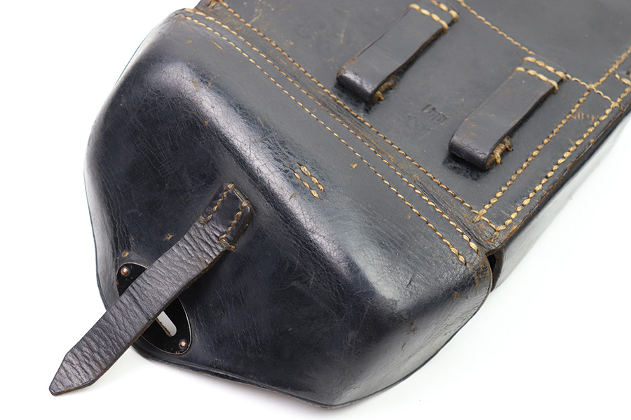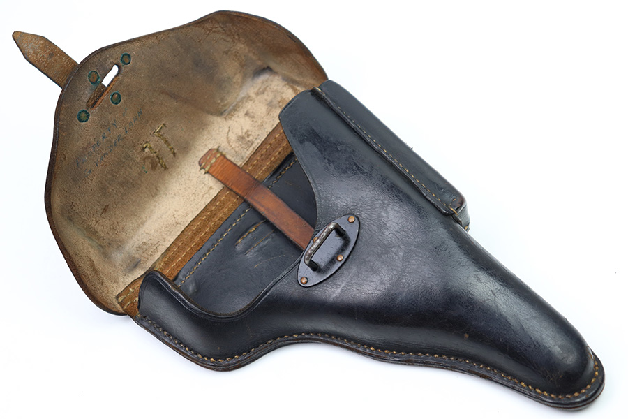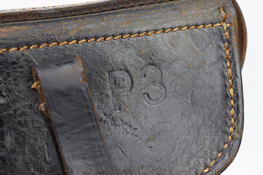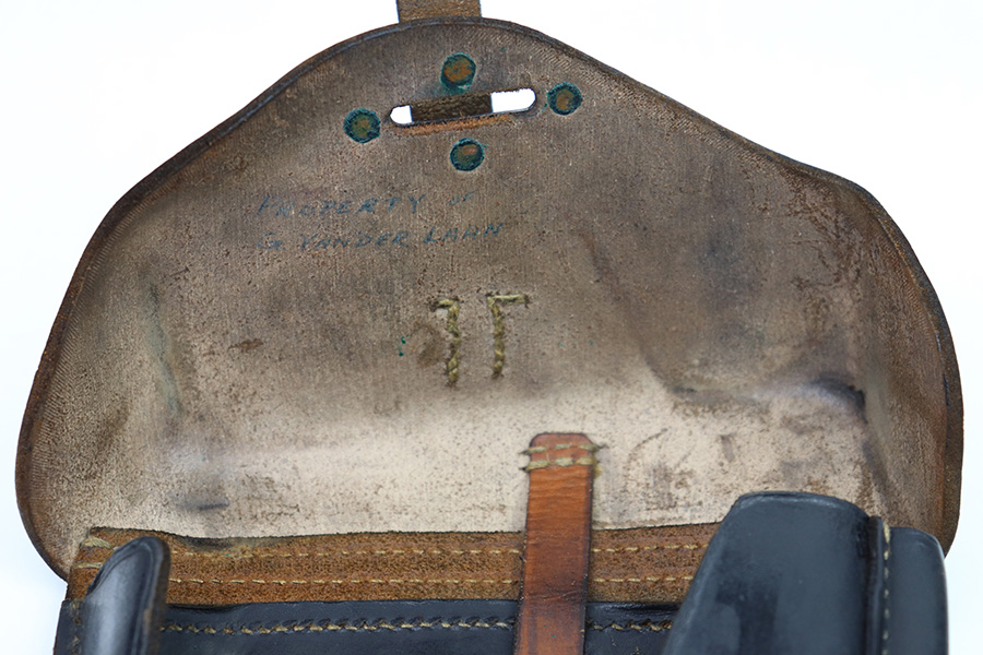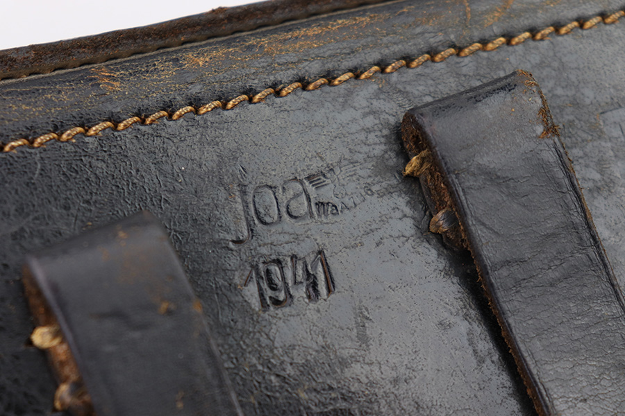 10/24/22 – This is an original P.38 holster manufactured in 1941. The leather is in great overall condition with minor signs of wear throughout. The stitching is all original and intact. There is some slight wrinkling on the top of the closure flap and some marks here and there throughout the leather. The back of the holster is maker marked “joa”, waffen-stamped, “1941” dated, and marked “P38”. The interior leather is in good condition with some use/wear markings here and there and an ink mark reading “property of G. Vanderlaan”. Overall, an early variation P.38 holster in great condition.
