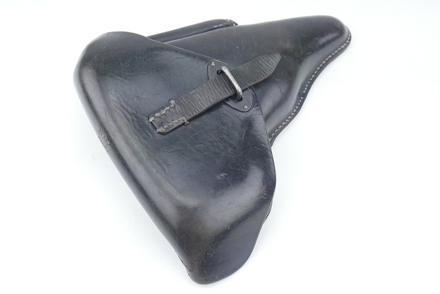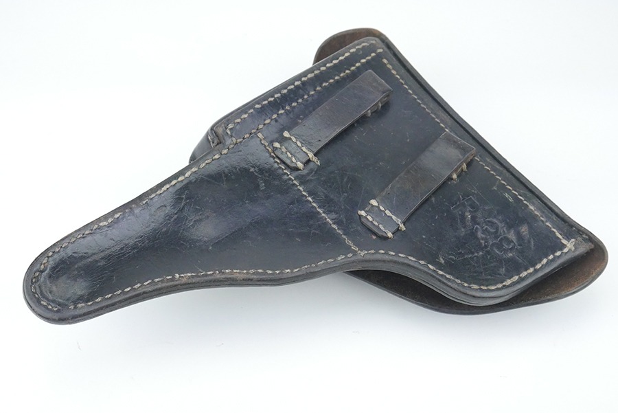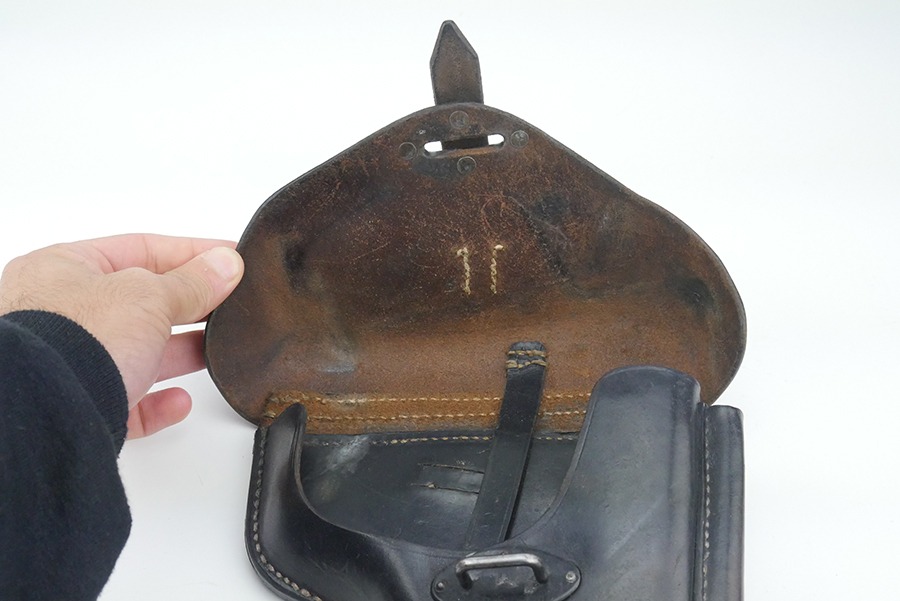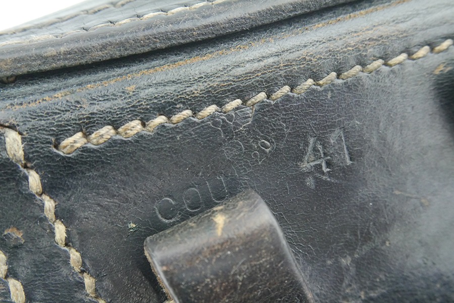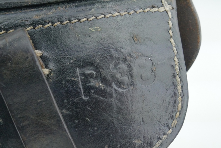 10/3/24 – This is a great example of a scarce variation 1941 hard-shell P.38 holster. The back of the holster is “cgu” maker stamped and “41” date stamped. Both of these stamps are still strong and easily legible. CGU only made holsters in 1941 and 1942, making this a scarce variation. There is also a waffen “WaA920” military proof, this stamp however is faint, but still noticeable. The leather on this holster remains soft and pliable. The closure strap is intact and fully functional. The lid on this holster has only the slightest wrinkling from standard use. There are no major cracks or gauges in the leather. There are a few nicks and small abrasions from use and age, but overall the leather is in great condition. The stitching is all in tact and original, and the interior leather is fairly clean.