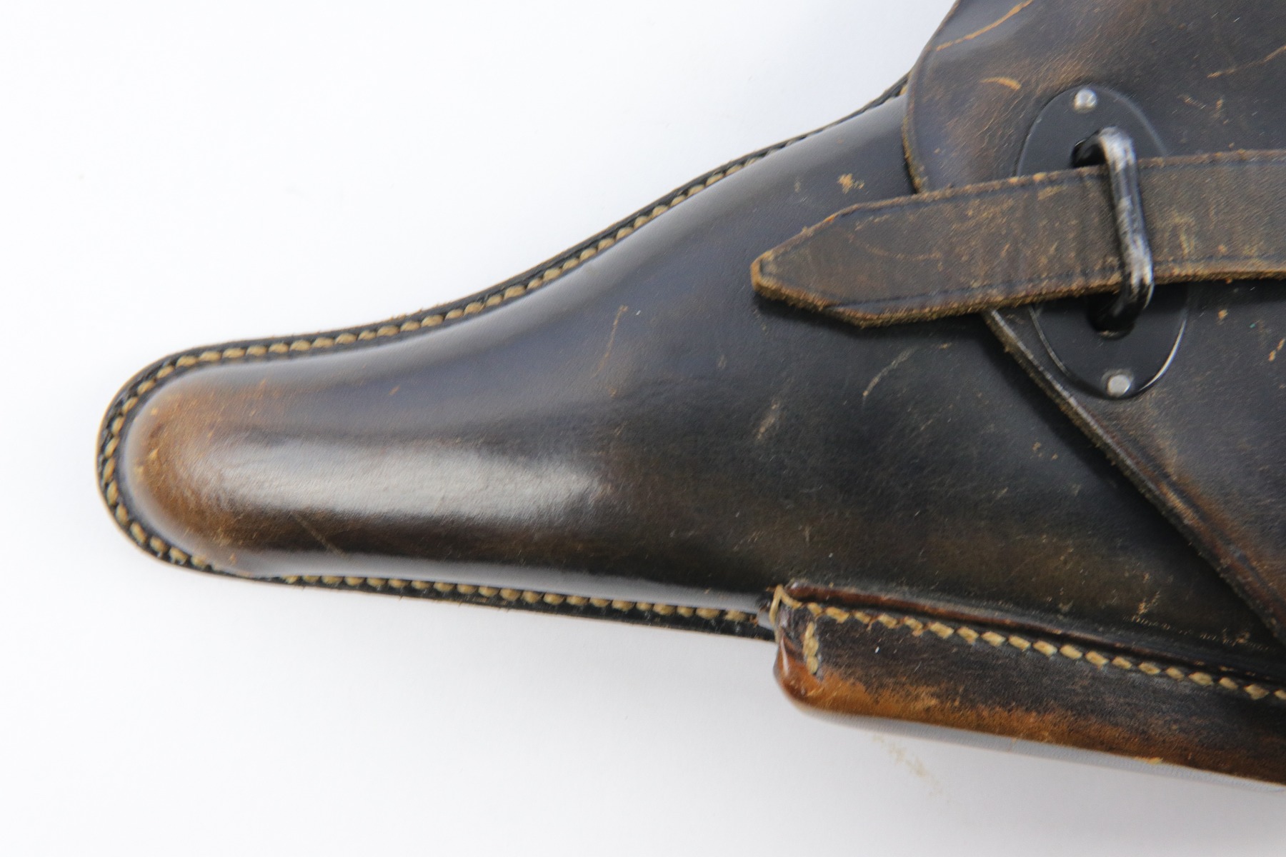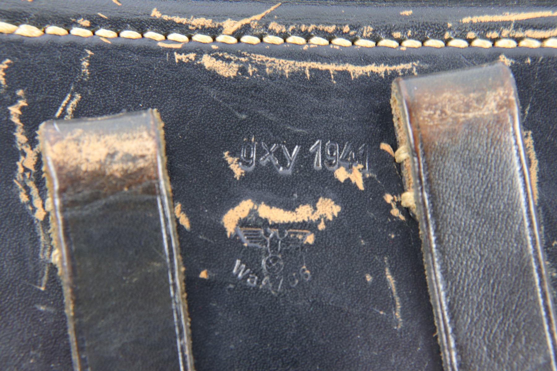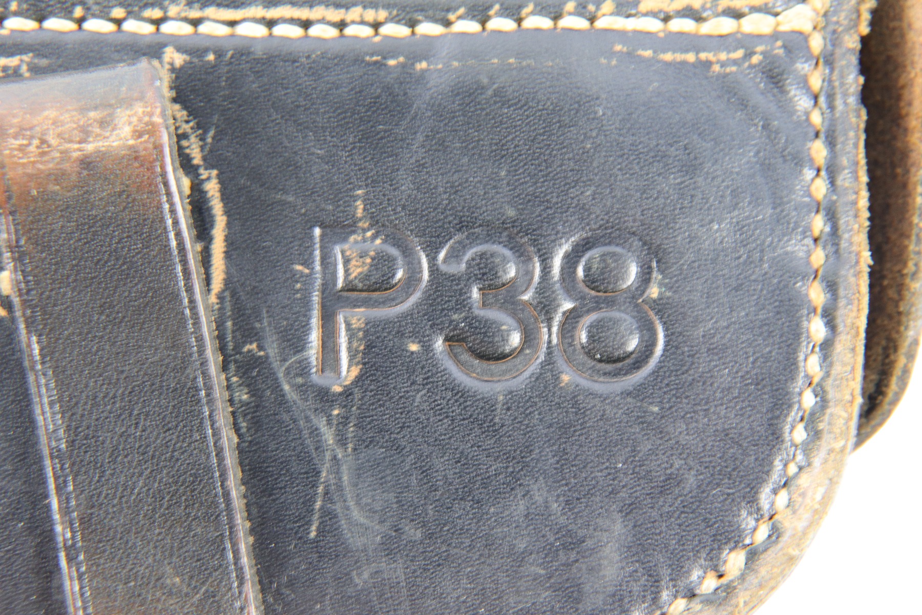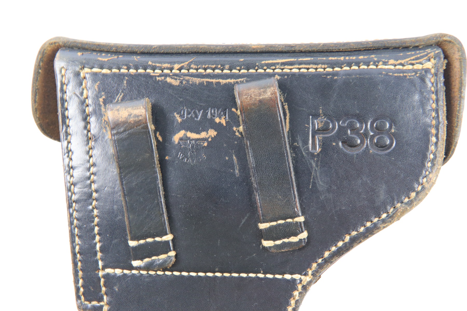 4/18/18 – This is an original 1941 dated P.38 holster. The back of the holster is “gxy” maker code stamped with a 1941 date and waffen proof eagle WaA706. There’s also a P.38 stamp on the back leather. The leather is somewhat pliable but overall excellent with some light fading of the original black ink. There is also some minimal scuffing, but no cracks or wrinkling on the leather. The stitching is all original and in tact. Guaranteed original and authentic.