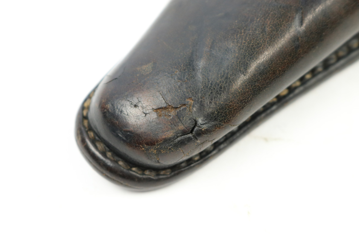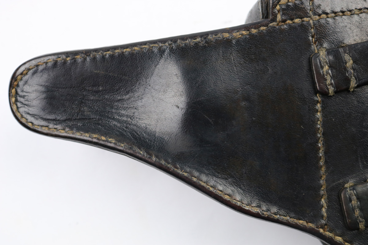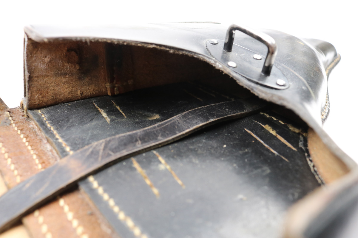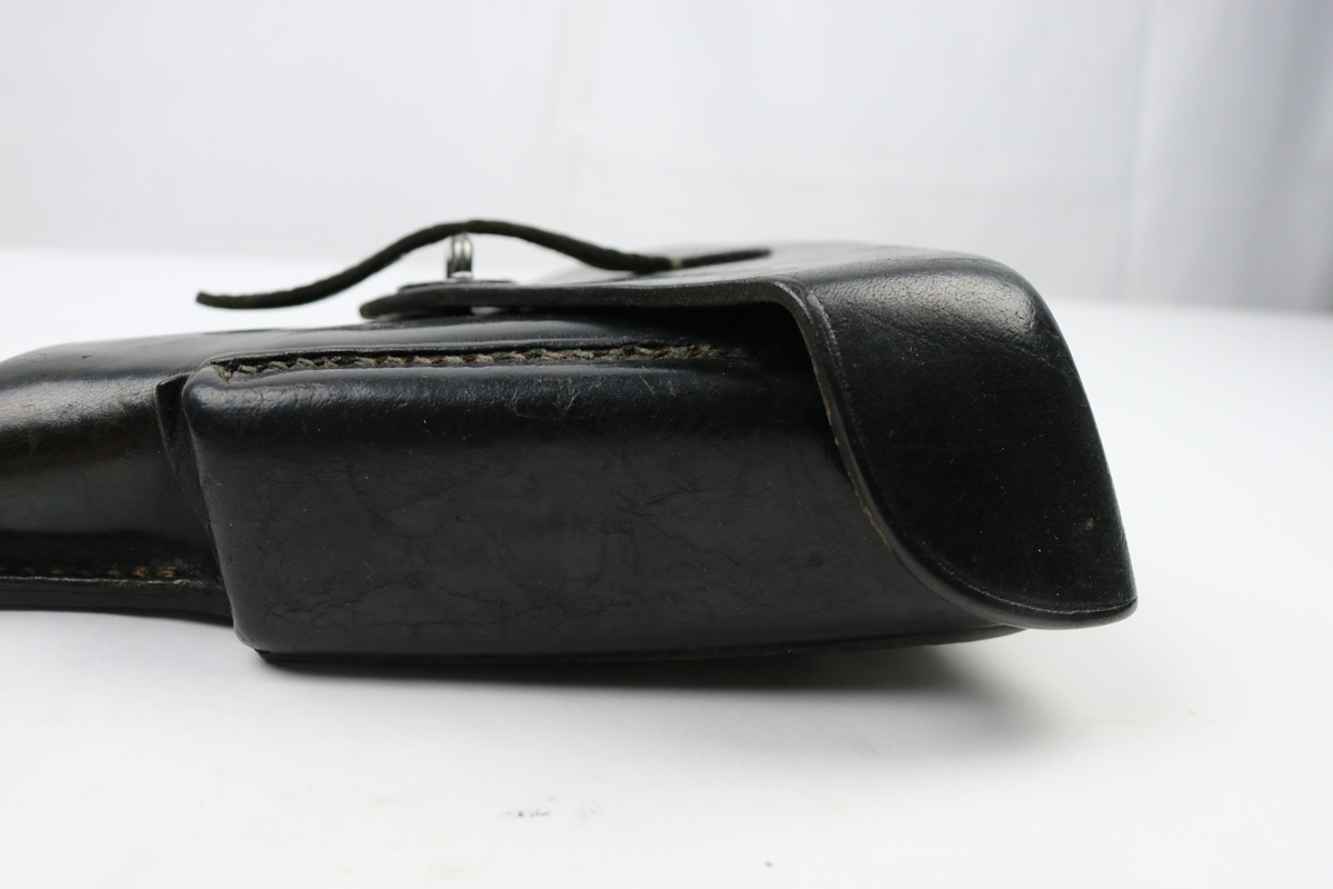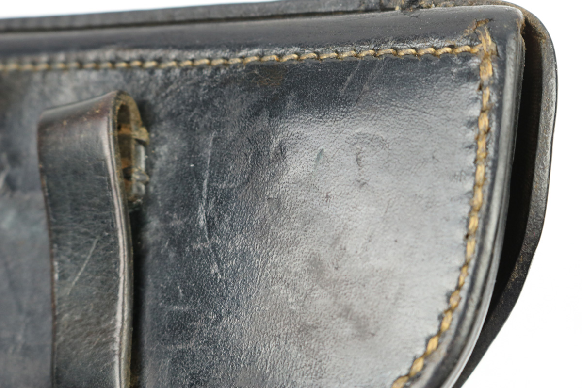 7/23/18 – This is an original 1941 production P.38 holster. These early WW2 production holsters are hard to find. The back of the holster is maker stamped, dated, and waffen proofed. The wafffen proof and P.38 stamp are faint but visible. The leather is somewhat soft and plilable but excellent conditoin overall with no major flaws, but there is a small blemish near the toe of the holster. This is a crack that goes fairly deep, but not all the way through the leather. The stitching is all original and in tact. Fairly clean interior leahter as well. Guaranteed original and authentic.