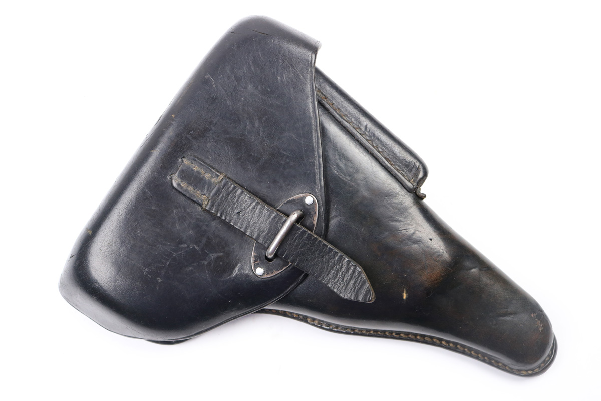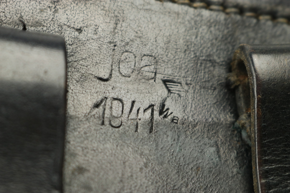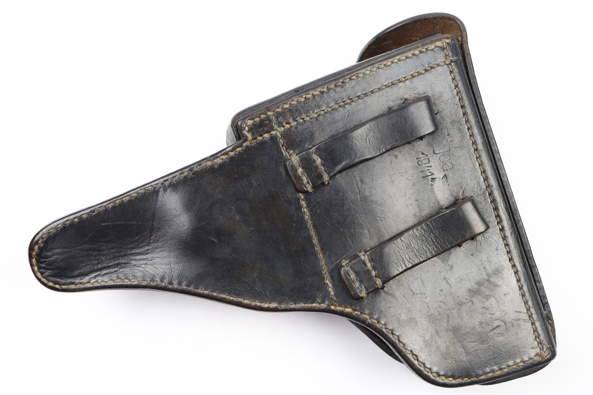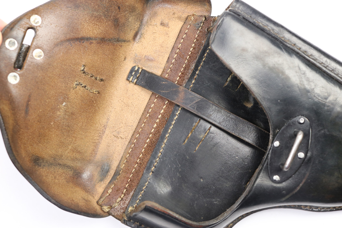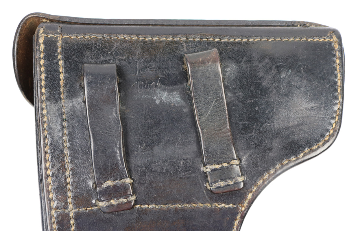 7/23/18 – This is an original 1941 production P.38 holster. These early WW2 production holsters are hard to find. The back of the holster is maker stamped, dated, and waffen proofed. The wafffen proof and P.38 stamp are faint but visible. The leather is somewhat soft and plilable but excellent conditoin overall with no major flaws, but there is a small blemish near the toe of the holster. This is a crack that goes fairly deep, but not all the way through the leather. The stitching is all original and in tact. Fairly clean interior leahter as well. Guaranteed original and authentic.
