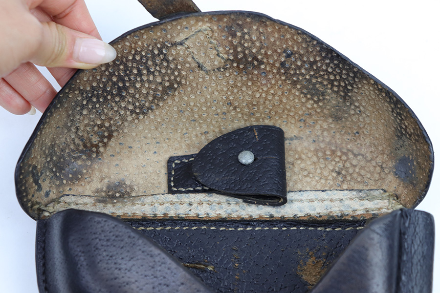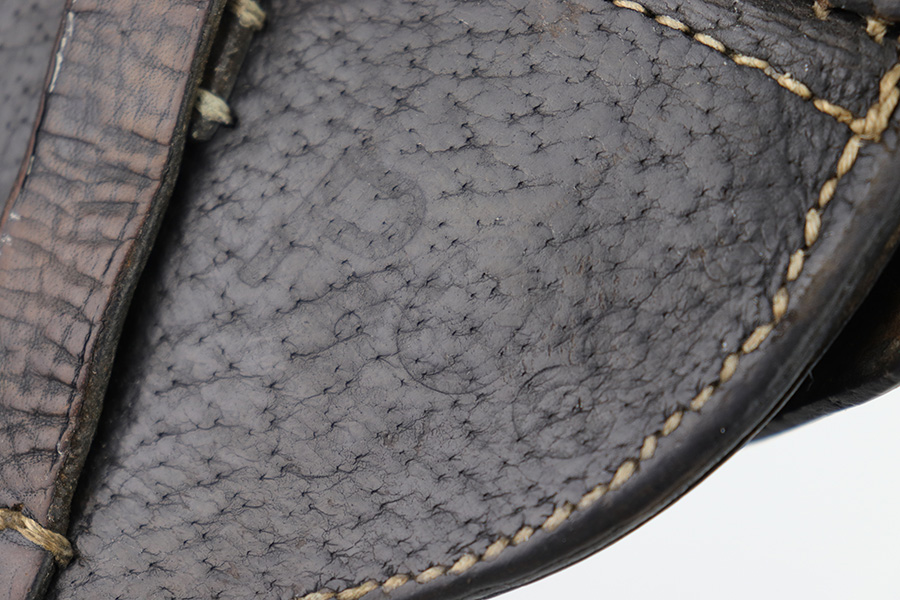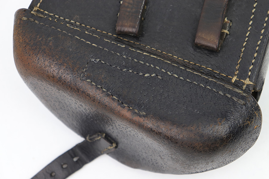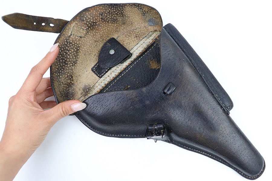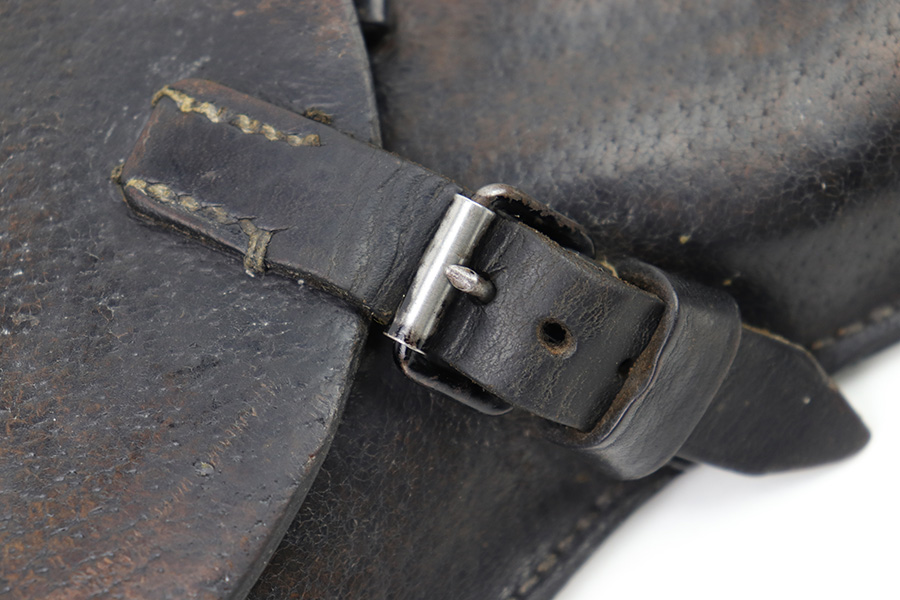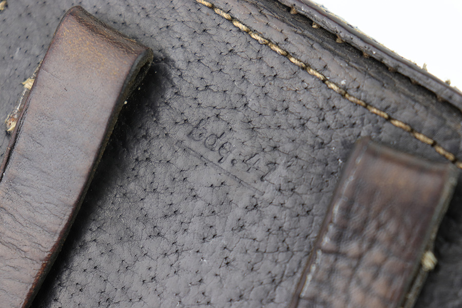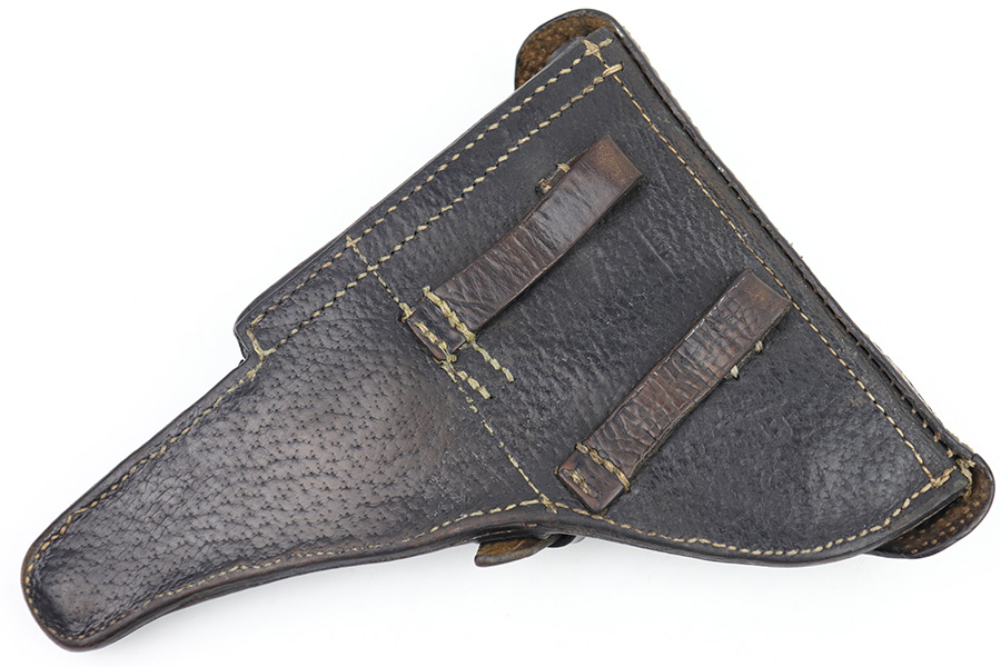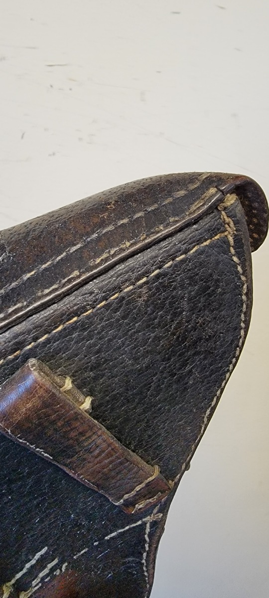 3/7/23 – This is an original and rare variation 1941 Luger holster made from Pigskin leather. The holster leather is very nice with normal pliability and some light surface wear but no excessive damage, and the leather holds shape nicely. The stitching is all original and mostly intact without any major issues, but there are a few loose / broken stitches on the top leather. This doesn’t affect functionality, and the lid is still secure on the body of leather. The back leather is maker stamped, dated, waffen proofed and P.08 stamped. The stamps are faint but still visible. The interior leather is excellent. A great example and pairs well with a Black Widow Luger.