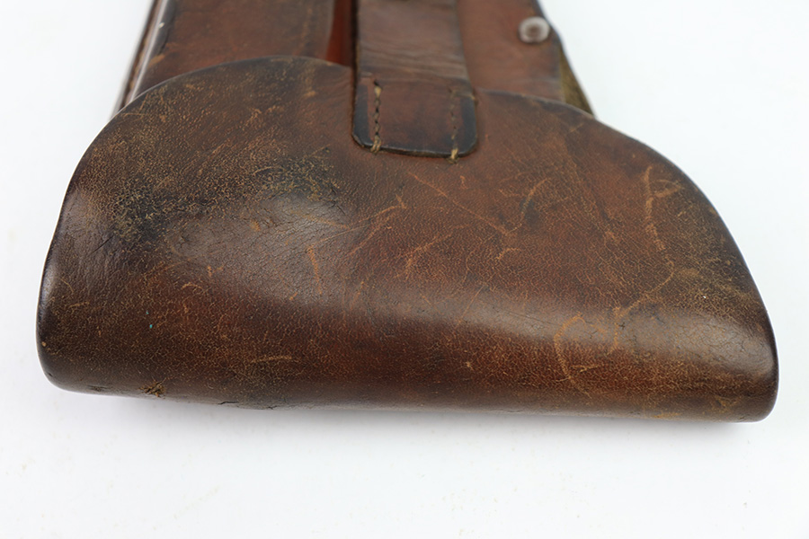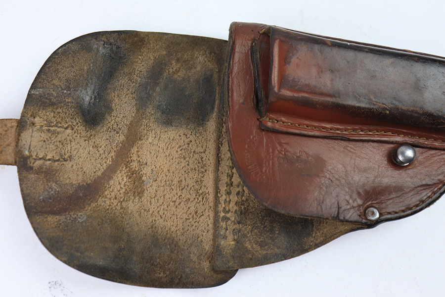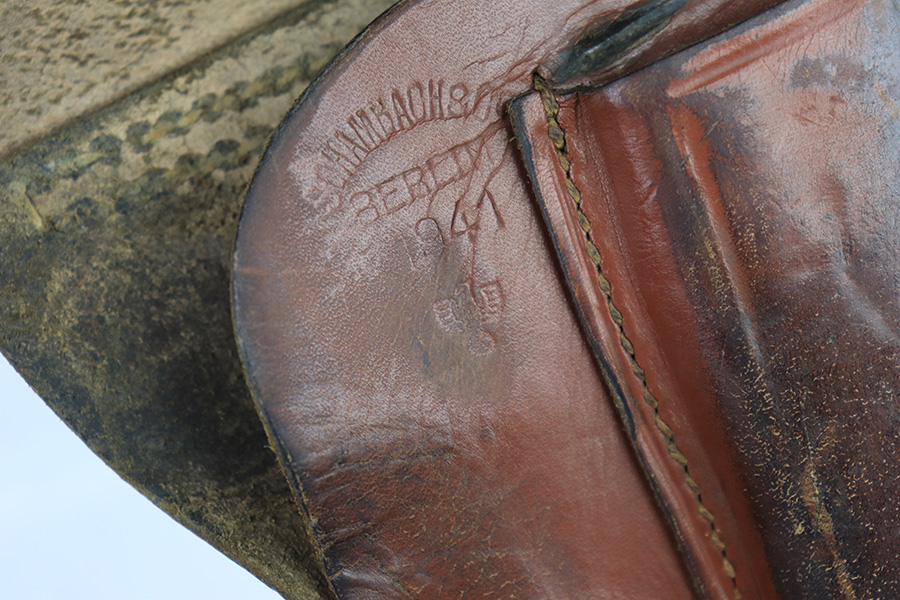 12/21/22 – This is an original 1941 dated holster issued to the German Police during WW2. The holster fits a Walther PPK or similar sized 7.65mm Axis pistol. The front leather is maker stamped, date stamped, and police eagle proof stamped under the closure strap. The leather is soft and pliable with honest wear throughout. There’s surface wrinkling and dark staining in some areas of the leather. The back belt loop has two added rivets, but all the stitching is original and intact.