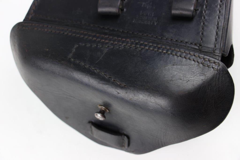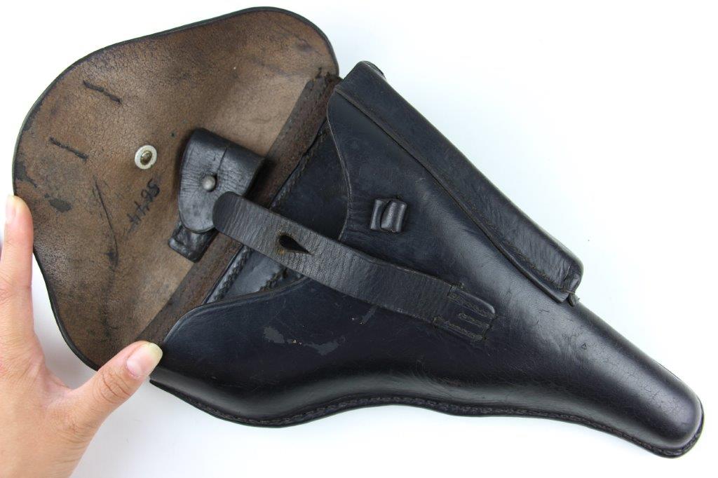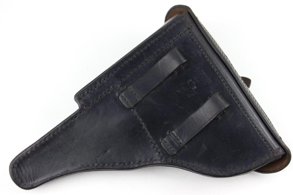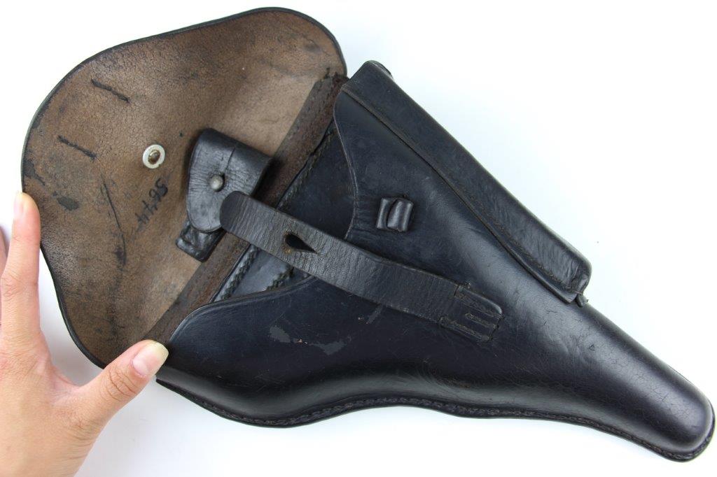 8/7/24 – This is a near-excellent condition 1941 dated Police Luger holster. These wartime police examples are fairly scarce, especially in this condition. The holster has all black leather and stitching, with all original stitching tight and intact. The leather is firm with mild pliability and shows normal signs of previous use and age. There’s mild wrinkling on the front leather and closure strap, but no excessive cracking or blemishes. Some minor scuffing on the front leather as shown in photos. The back leather is clean with a crisp maker stamp, “A. Fischer Berlin C.2” 1941 date stamp, and a crisp (mint) police eagle proof stamp with a visible “B” within the eagle’s breast. The interior leather is clean with some serial numbers handwritten on the interior leather. Steel closure stud shows natural surface patina. Overall a high-end police holster that’s very well marked.