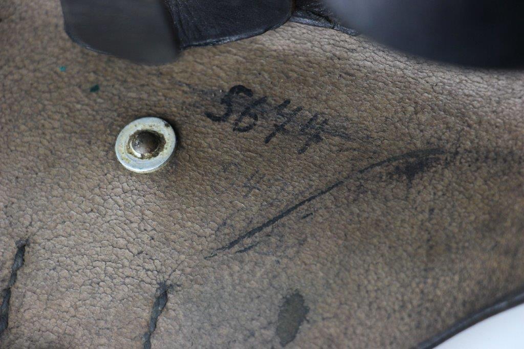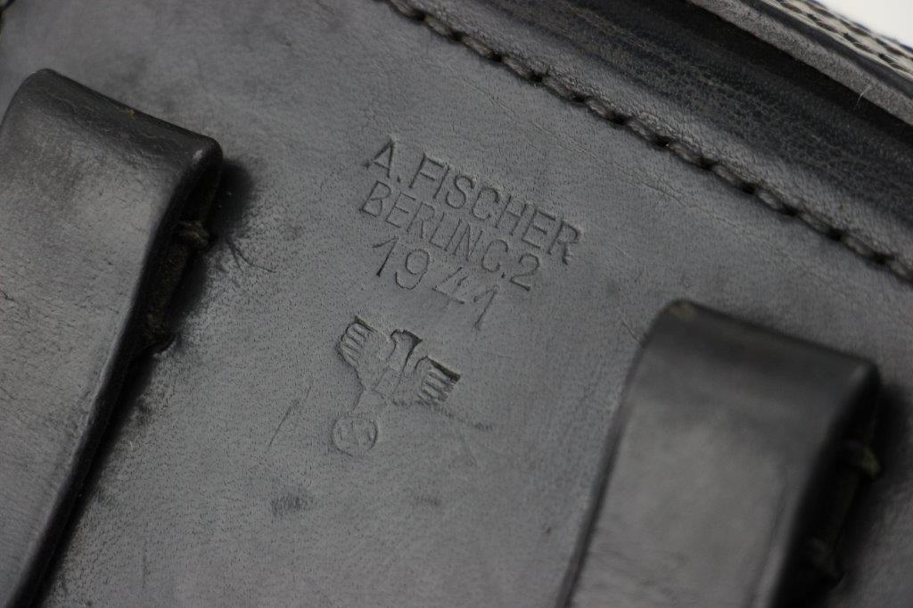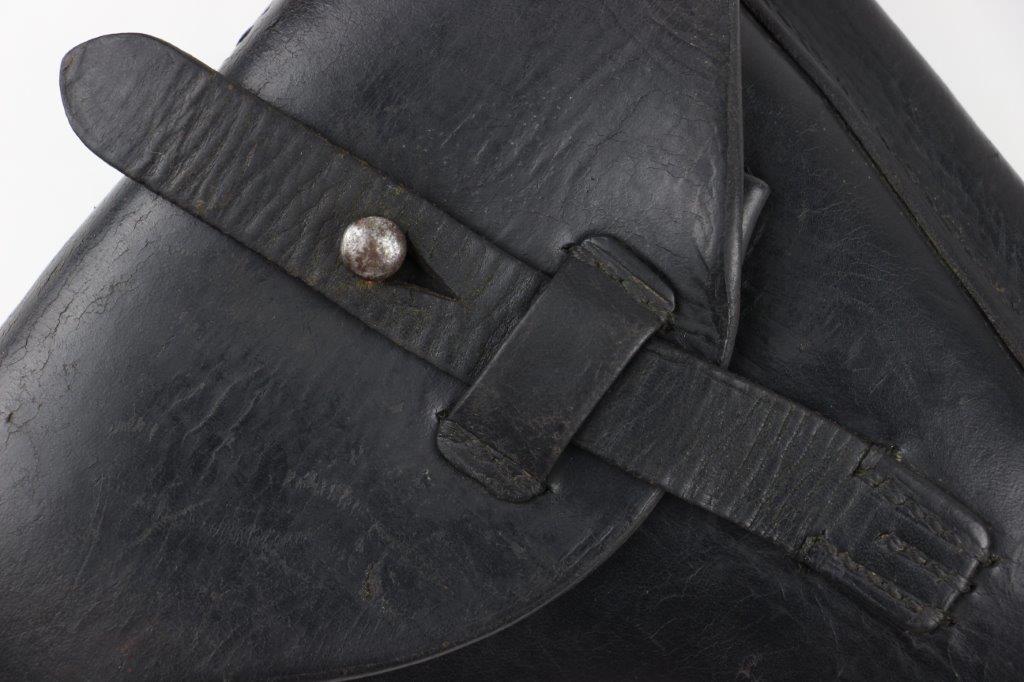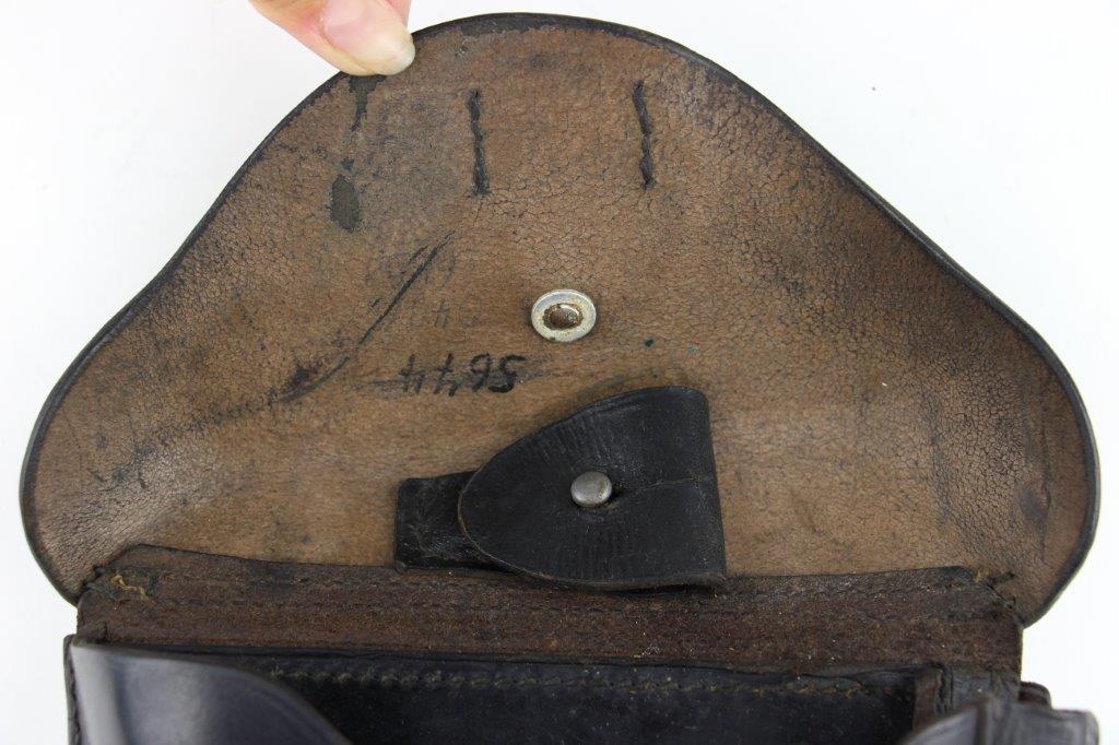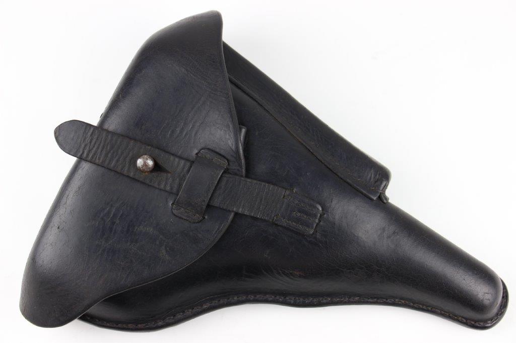 8/7/24 – This is a near-excellent condition 1941 dated Police Luger holster. These wartime police examples are fairly scarce, especially in this condition. The holster has all black leather and stitching, with all original stitching tight and intact. The leather is firm with mild pliability and shows normal signs of previous use and age. There’s mild wrinkling on the front leather and closure strap, but no excessive cracking or blemishes. Some minor scuffing on the front leather as shown in photos. The back leather is clean with a crisp maker stamp, “A. Fischer Berlin C.2” 1941 date stamp, and a crisp (mint) police eagle proof stamp with a visible “B” within the eagle’s breast. The interior leather is clean with some serial numbers handwritten on the interior leather. Steel closure stud shows natural surface patina. Overall a high-end police holster that’s very well marked.