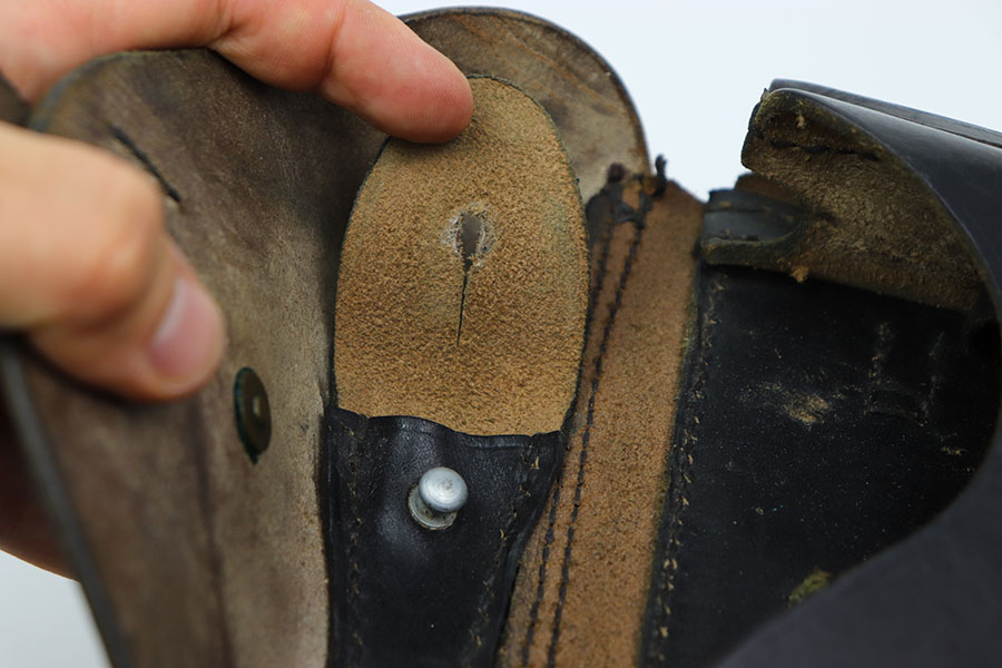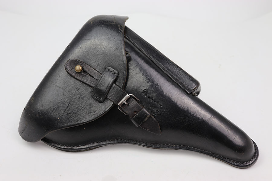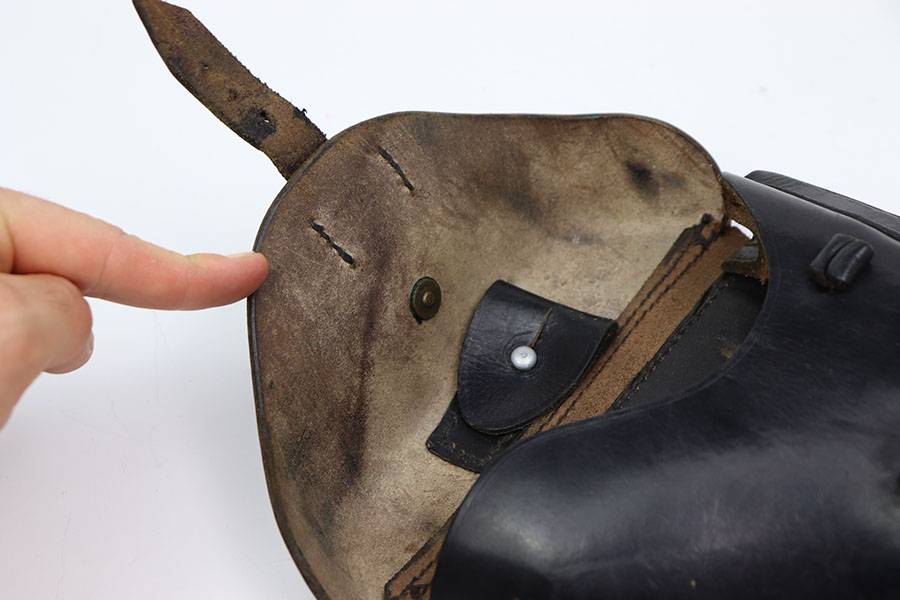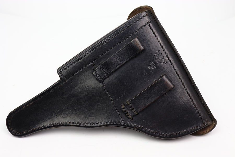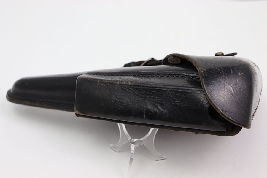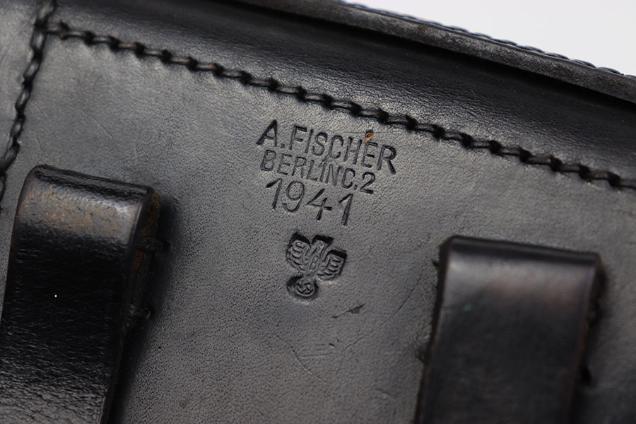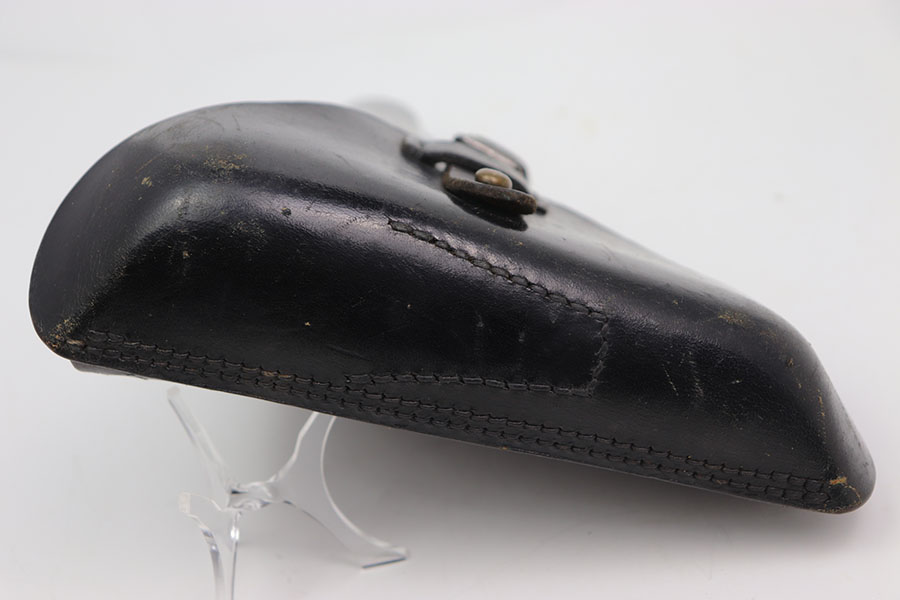 4/8/24 – This is an original 1941 police luger holster that has been converted to a military configuration (closure strap replaced). The holster is in overall excellent condition with very minor wear on the closure flap, no cracking or scratches. The holster is maker marked, “A.Fischer,” dated “1941.” The inside is clean with no marking, pliability is strong, and stitching appears to be all original and intact.