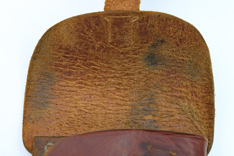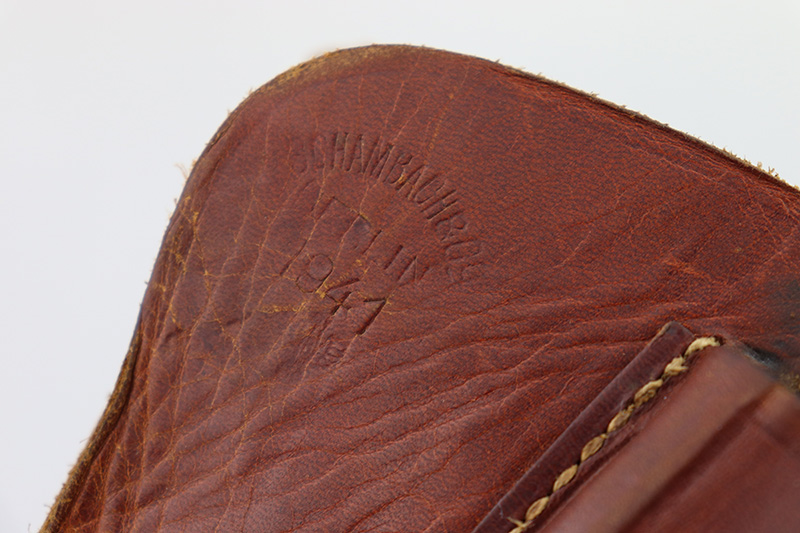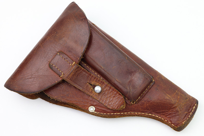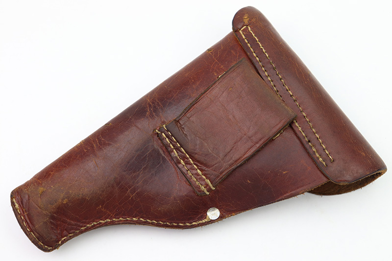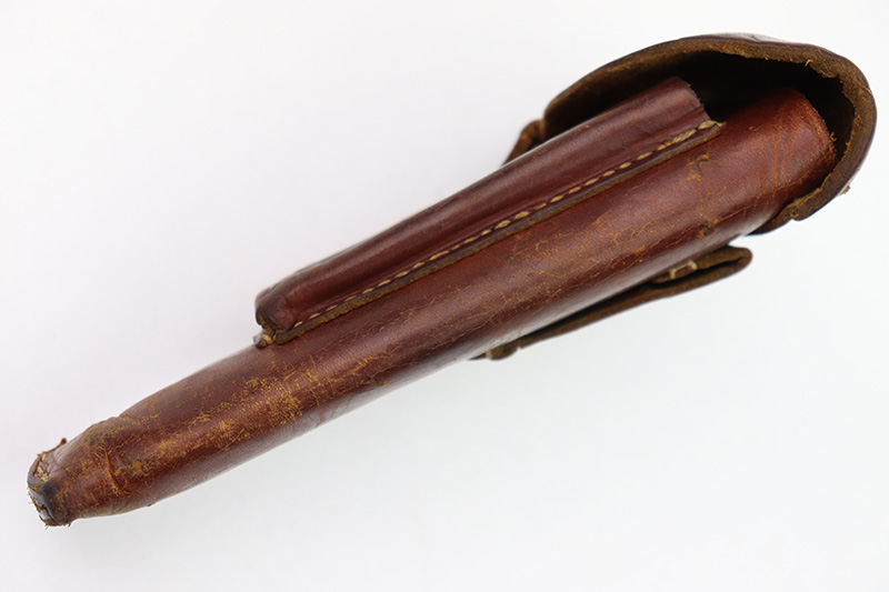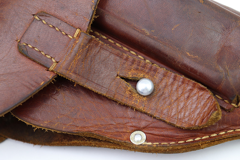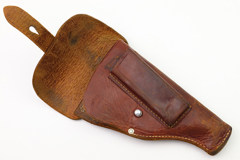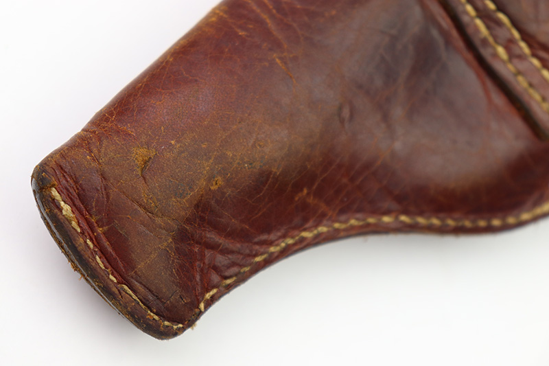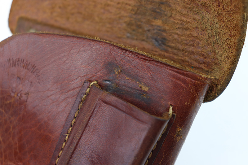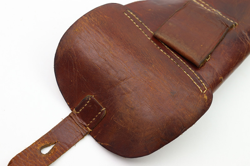 8/18/22 – This is an original Police issued pistol holster from 1941. The holster is maker stamped, dated, and police proof stamped under the closure strap. The brown leather is wrinkled throughout the exterior, but this is all surface wear and doesn’t go deep into the leather. The leather is soft and pliable. No stitching issues. Fits most 7.65mm Axis pistols.
