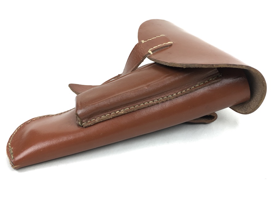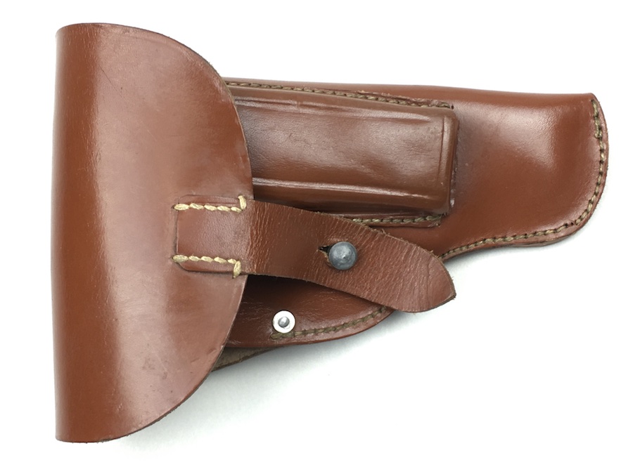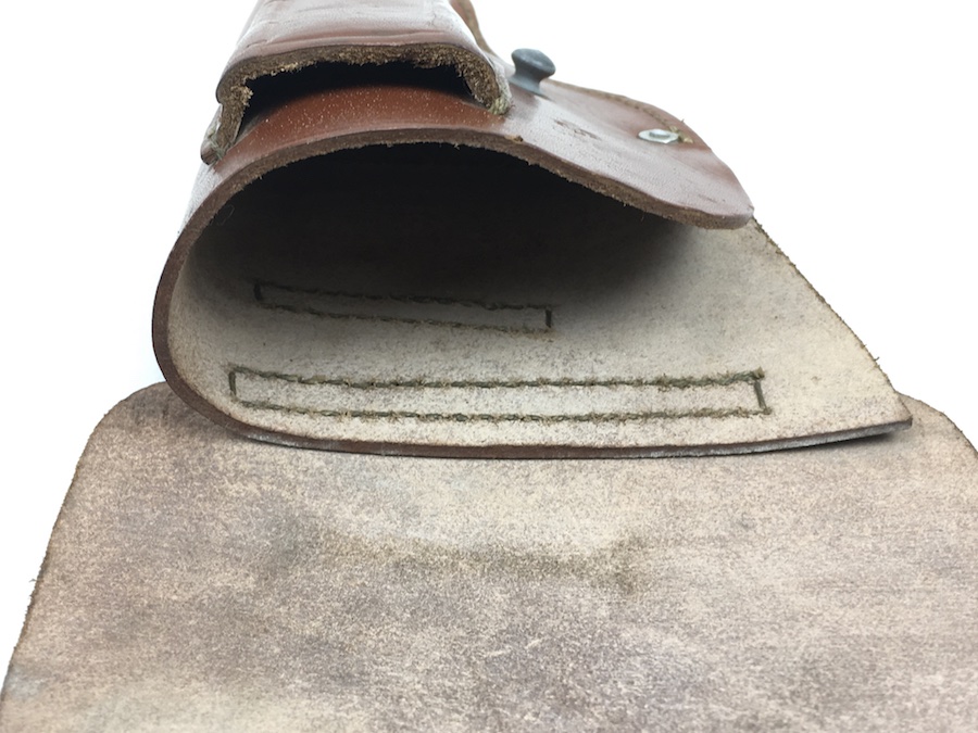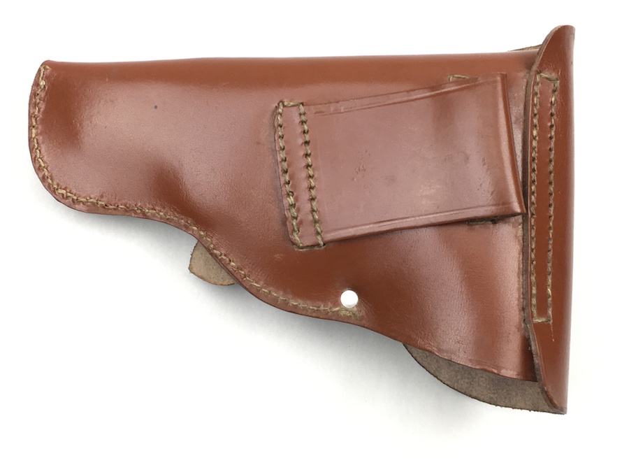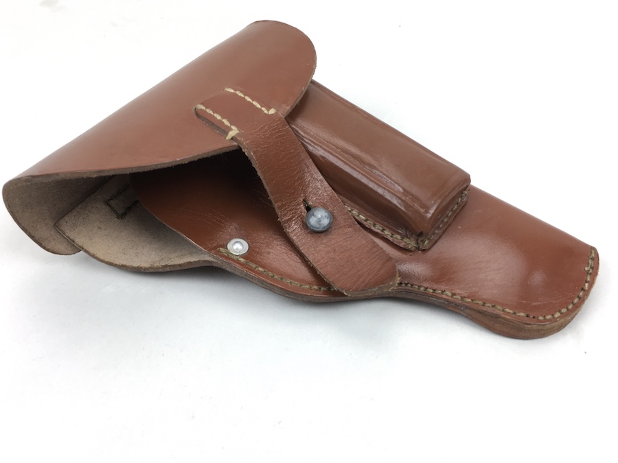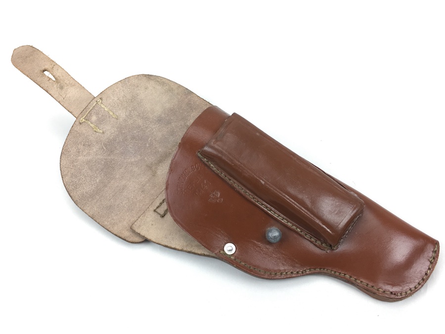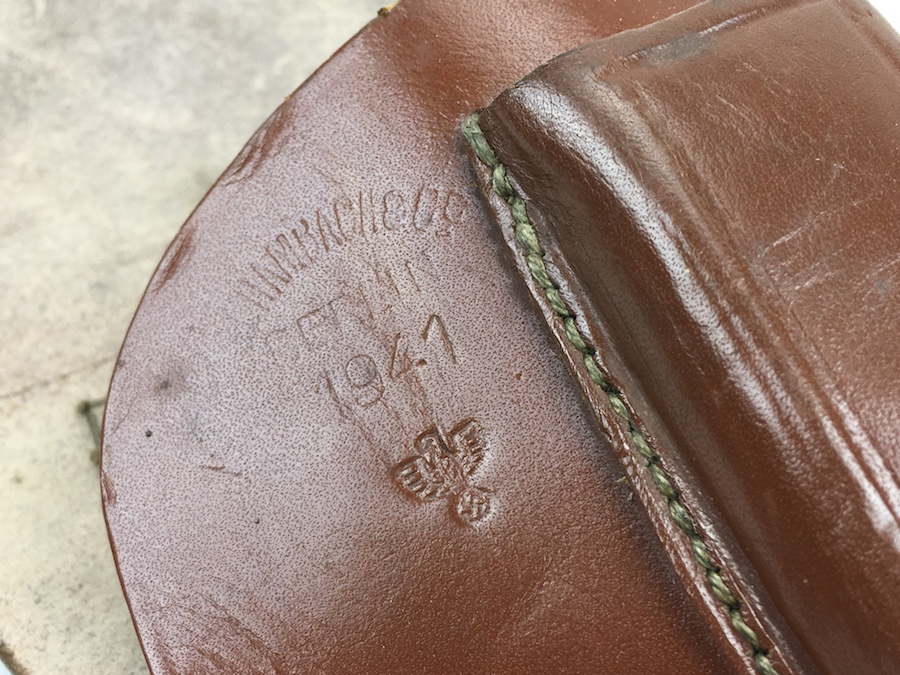 8/2/19 – This is an original 1941 dated Walther PPK (or similar sized pistol) holster. The holster is dated, police eagle stamped, and maker stamped under the closure strap. Minty leather is firm and clean – appears un-issued. All original stitching. Very hard to upgrade police holster!