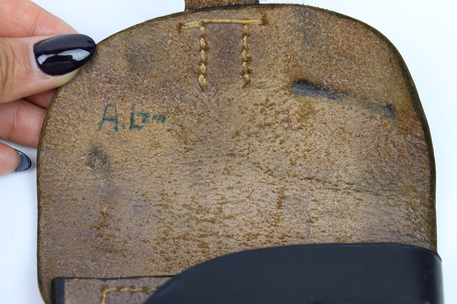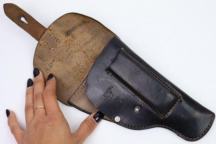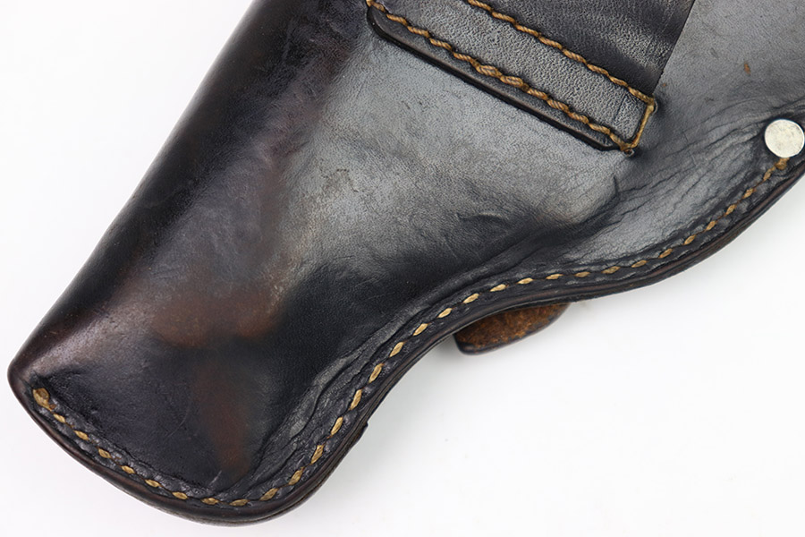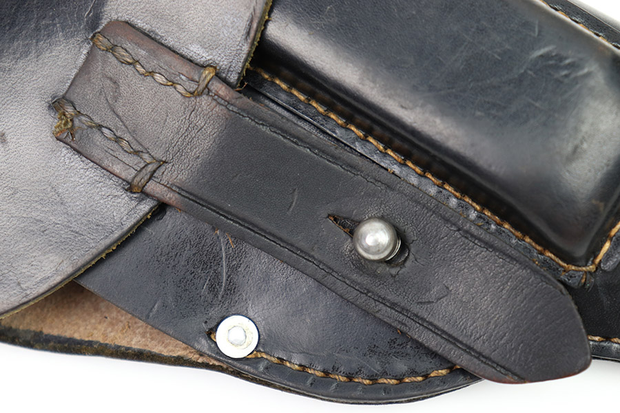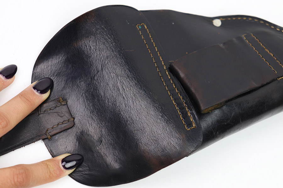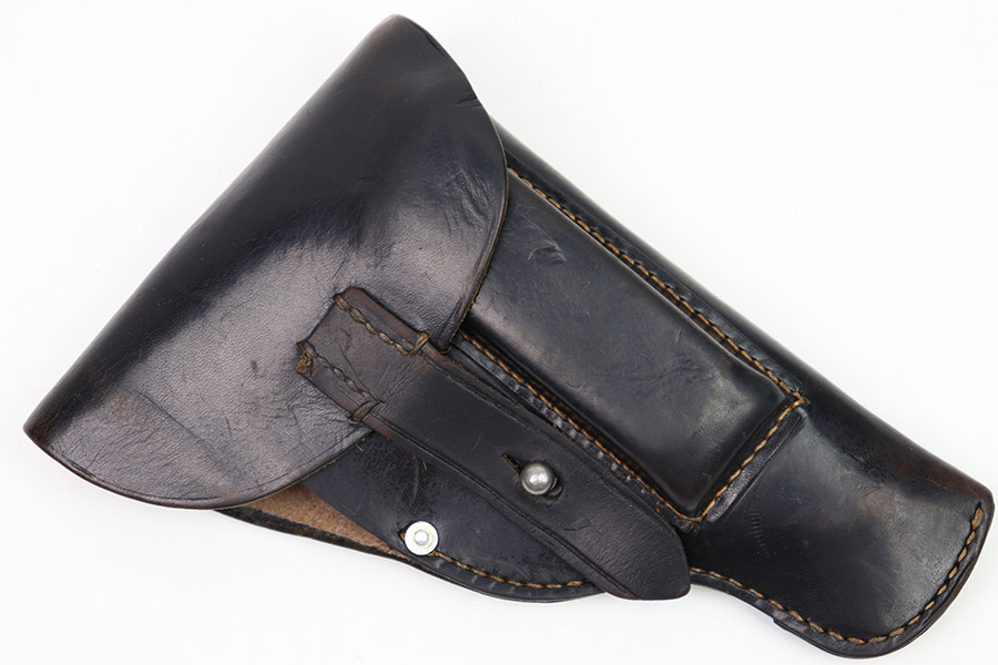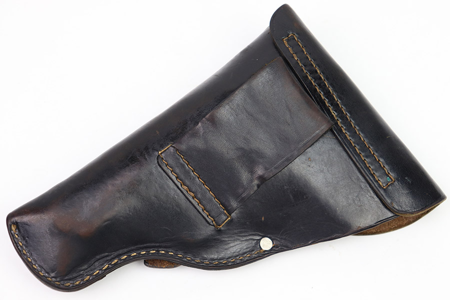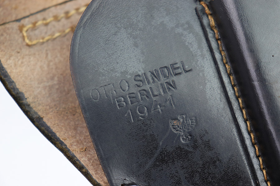 11/1/22 – This is an excellent, original example of a Walther PPK, or similar sized 7.65mm Police pistol Holster from 1941. The exterior leather is in overall excellent condition showing only minor signs of wear throughout. There is minimal wrinkling on the closure flap’s fold. The closure strap shows minimal use wear. The interior leather is in great overall condition. There is black ink writing that is illegible on the interior and discoloration where a magazine base rubs against the closure flap. Above the closure stud is a “Otto Sindel Berlin” maker mark, “1941” date, and police eagle proof. The stitching is clean and strong throughout.