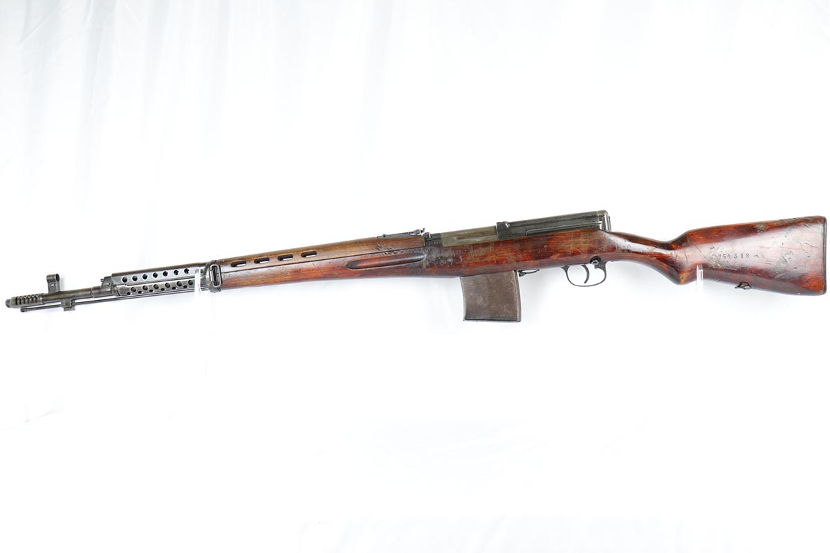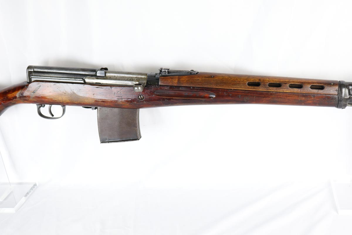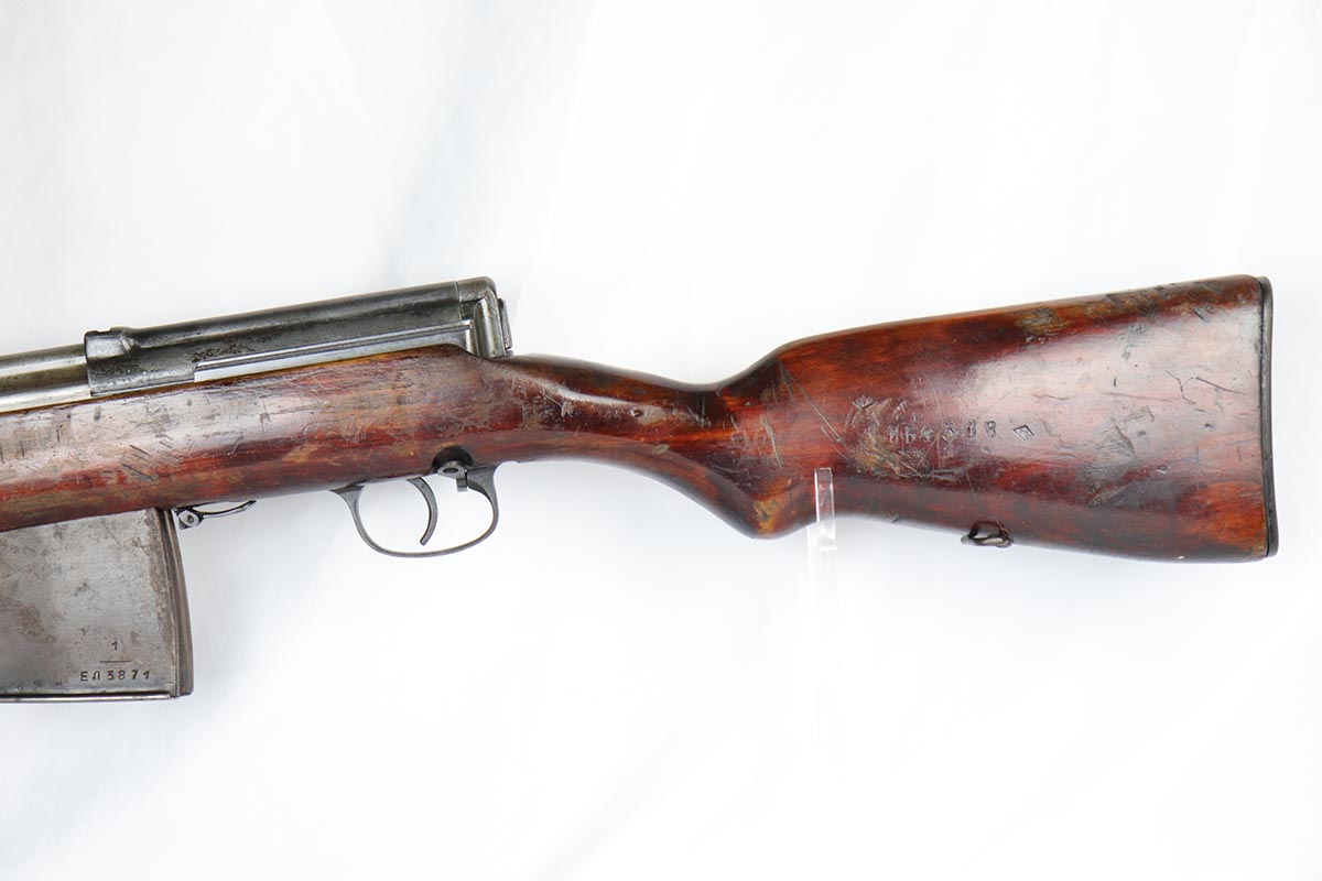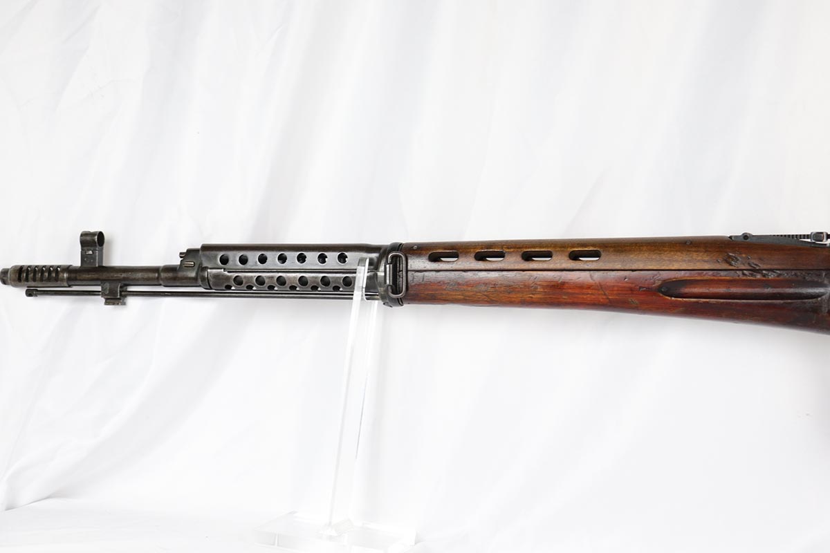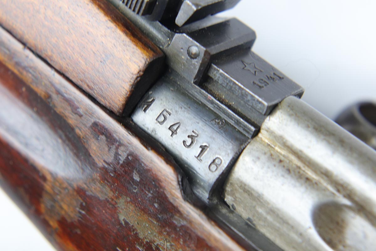 6/5/18 – This is an excellent condition, all original, and all matching Russian SVT 40 rifle, made in 1941 at the Tula factory, just in time for the German invasion of Soviet Union in operation Barbarossa. Despite all the talk about German military might in the beginning of WWII, the SVT40 semi-auto rifle was way ahead of the German K98 bolt action rifle, rivaling the American M1 Garand, developed around the same time. Rugged and performing well in the severe weather conditions, it was captured in the beginning of the war in some numbers by the Germans and played a role in development of K41 and K43 rifles. This particular gun is all original vet bring back without import marks and with 70-80% of the original blue remaining with some uniform thinning to the receiver and barrel. Beautiful stock with all the cartouches intact and no cracks. Sharp markings on the receiver with all the correct proofmarks. Very good bore. It is almost impossible to find an original non-import SVT40 in this condition, as most have been either imported or reworked by the Finns.