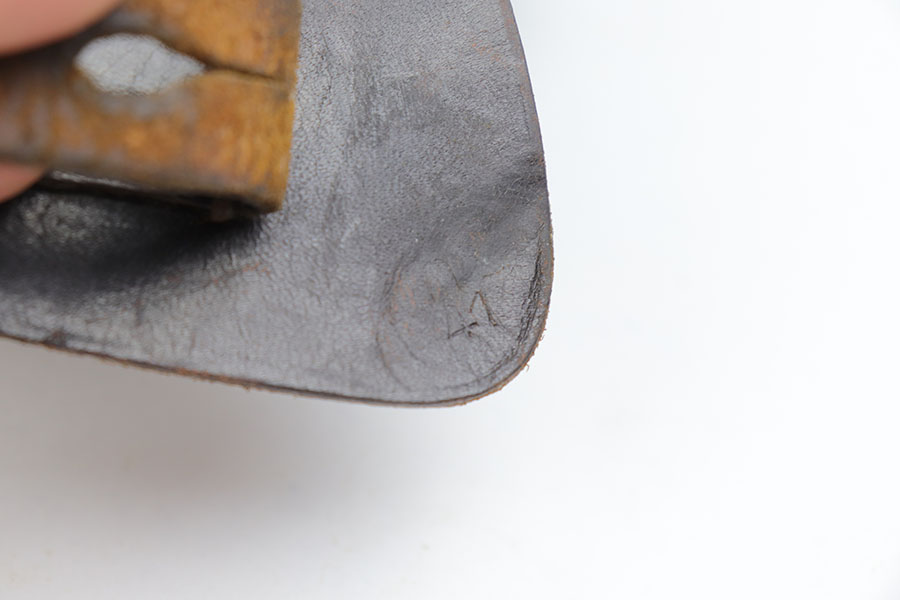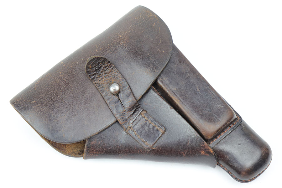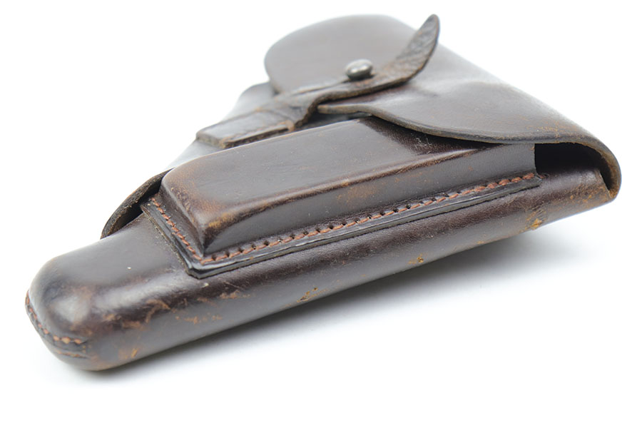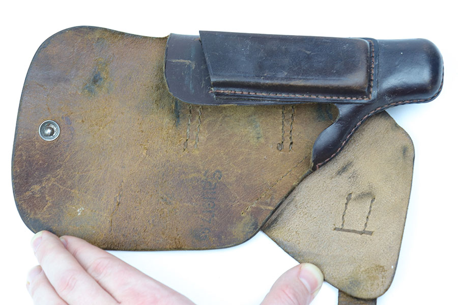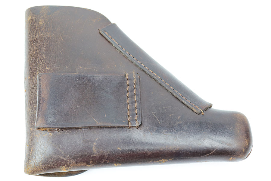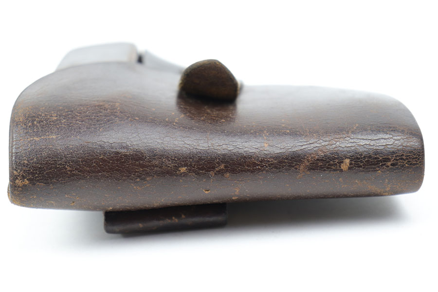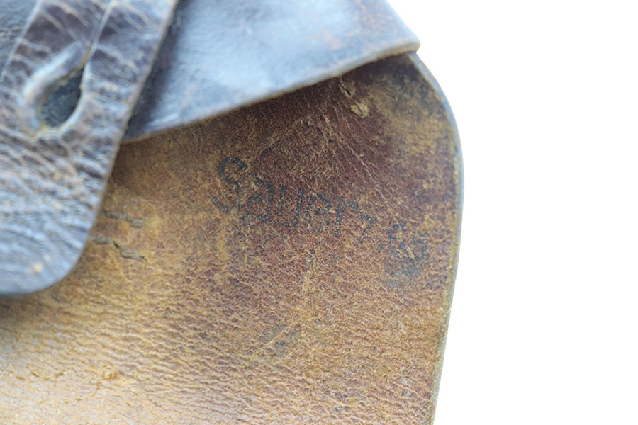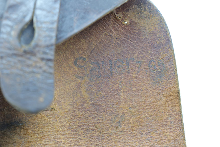 9/1/20 – This is a very scarce 1941 dated holster for a Sauer 38h. The holster is stamped with a waffen military proof eagle on the closure strap, and has a very faint, yet still visible “jhg 41” stamp under the closure strap. The interior leather has a Sauer 7.65 ink stamp. Very uncommon to see holsters like this from WW2. The brown leather is in great overall condition but shows typical signs of use and aging. All original stitching in tact.