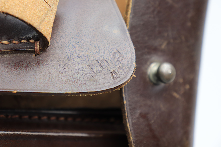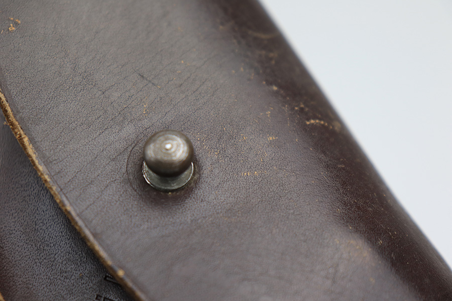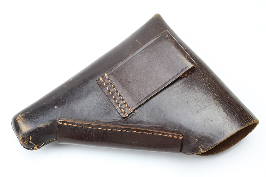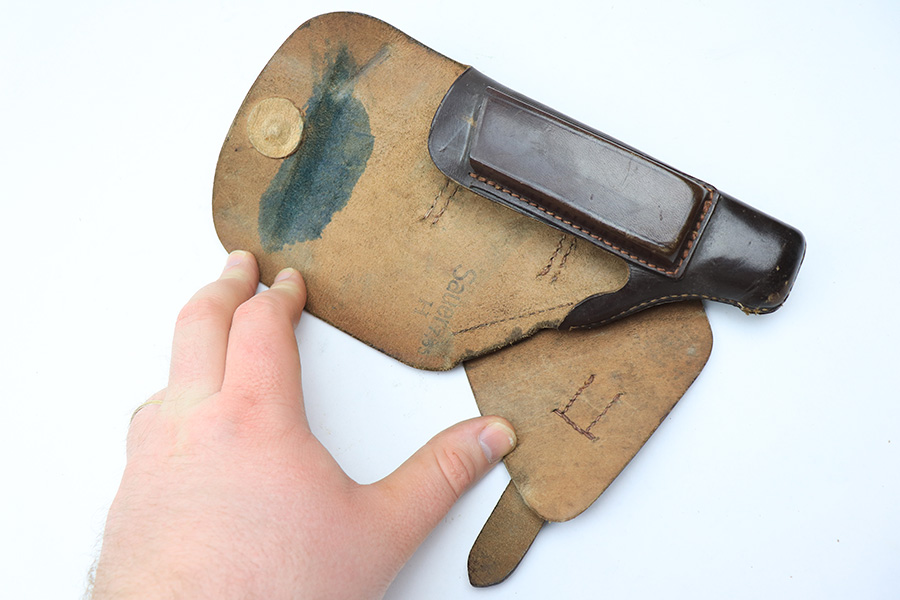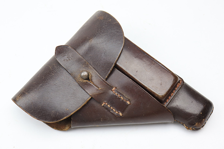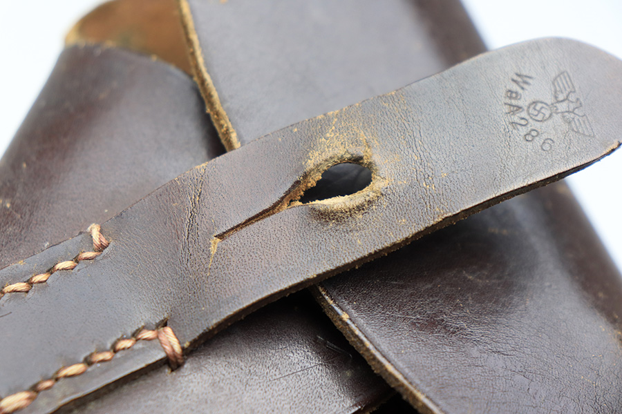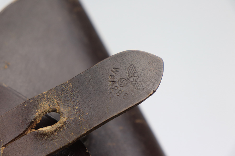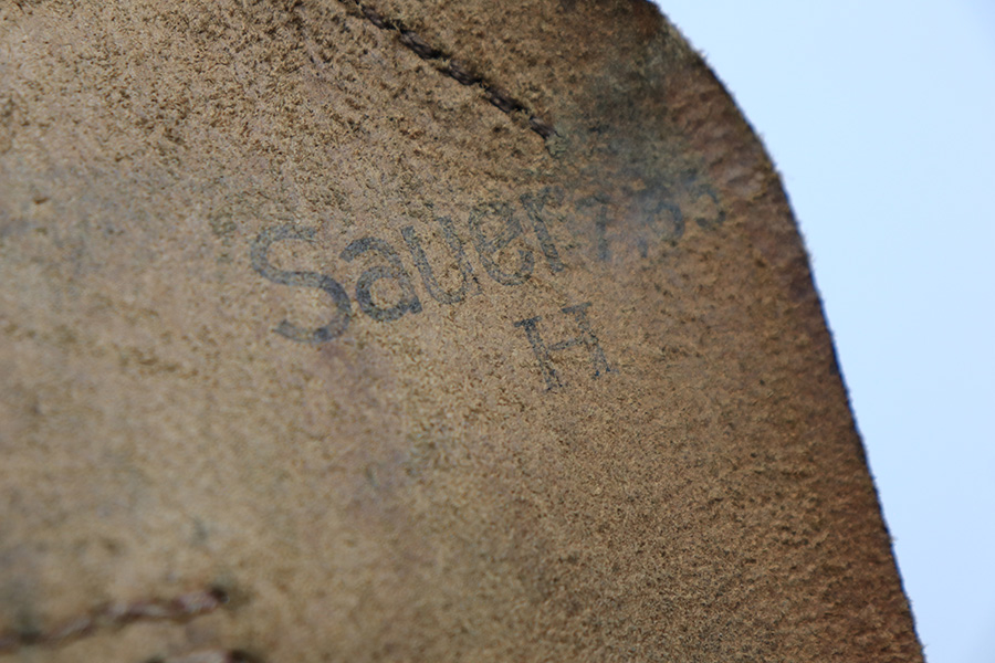 4/5/22 – This is a fairly scarce, desirable holster made for the Sauer 38h pistol. The holster is stamped “jhg 41” under the closure strap, and waffen proofed on the closure strap. The interior leather has a “Sauer 7,65 H” ink stamp (extremely rare). Unfortunately, the toe of the holster has some cracking and a few missing stitches. This is a small area, and doesn’t affect functionality of the holster. The rest of the leather and stitching is in great condition.
