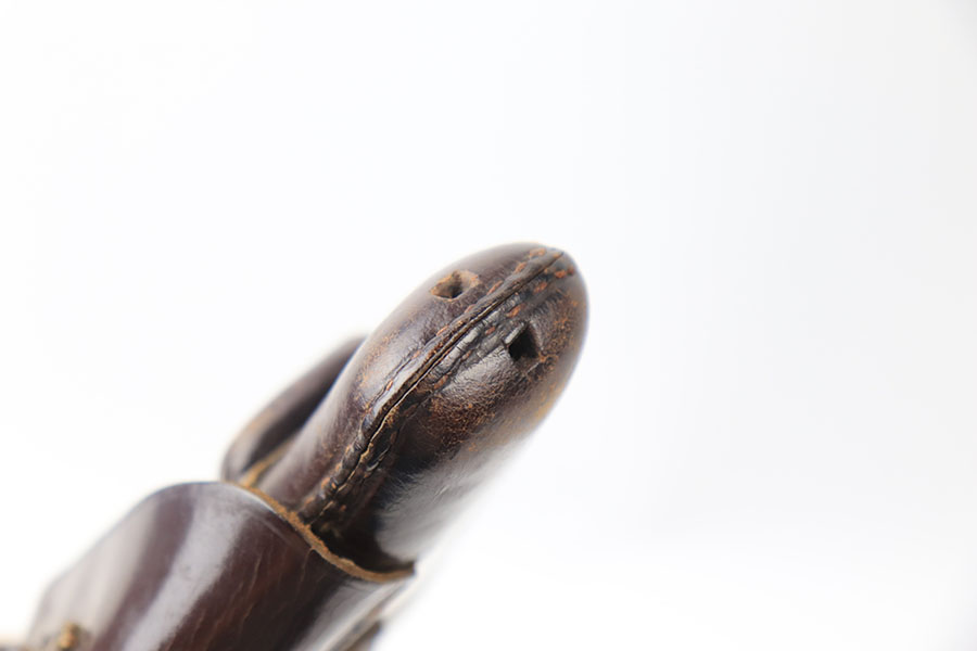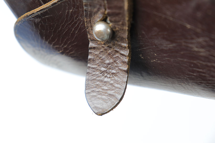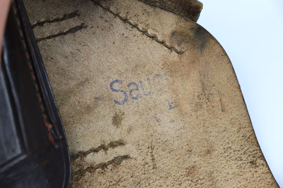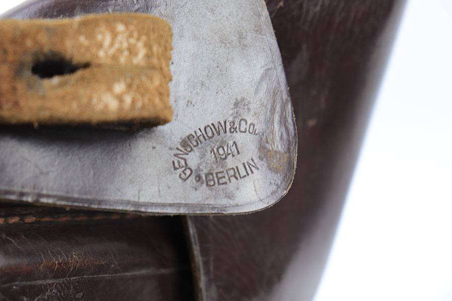 6/30/21 – This is an original and fairly scarce Sauer 38h holster. The holster is maker stamped by Genschow & Co under the closure strap, as well as 1941 date stamped. The interior leather has a Sauer ink stamp, as shown. The closure strap has a waffen proof stamp as well. The leather shows some typical signs of use wear and no excessive damage. The toe of leather has a purposefully made hole for a lanyard, as shown.