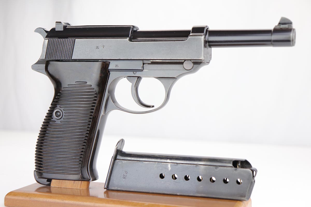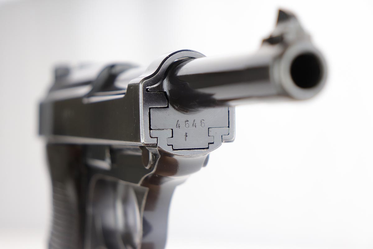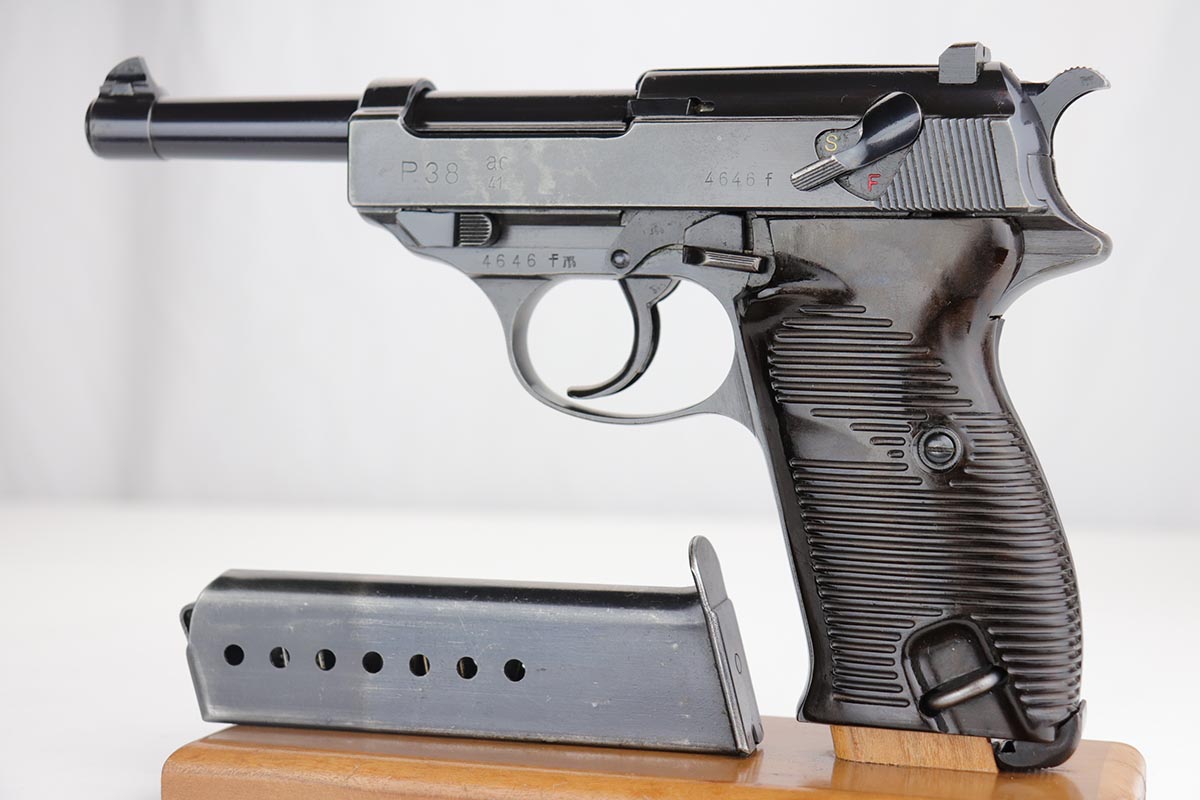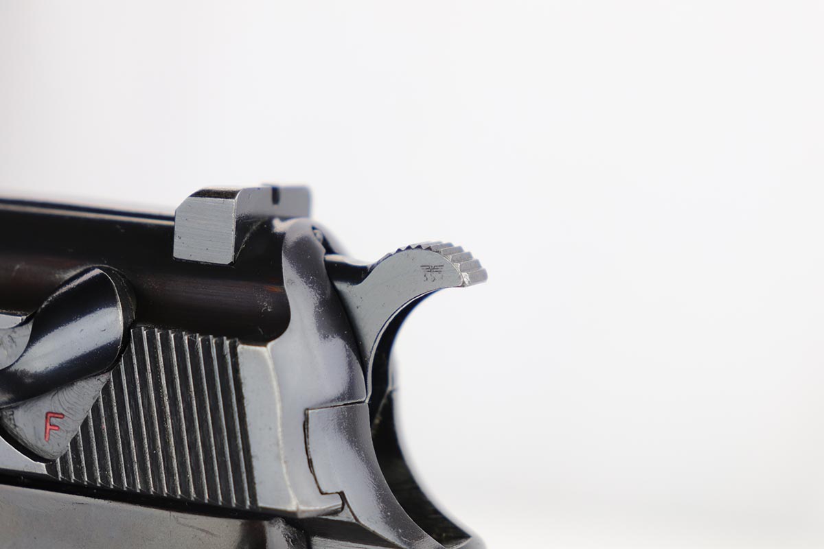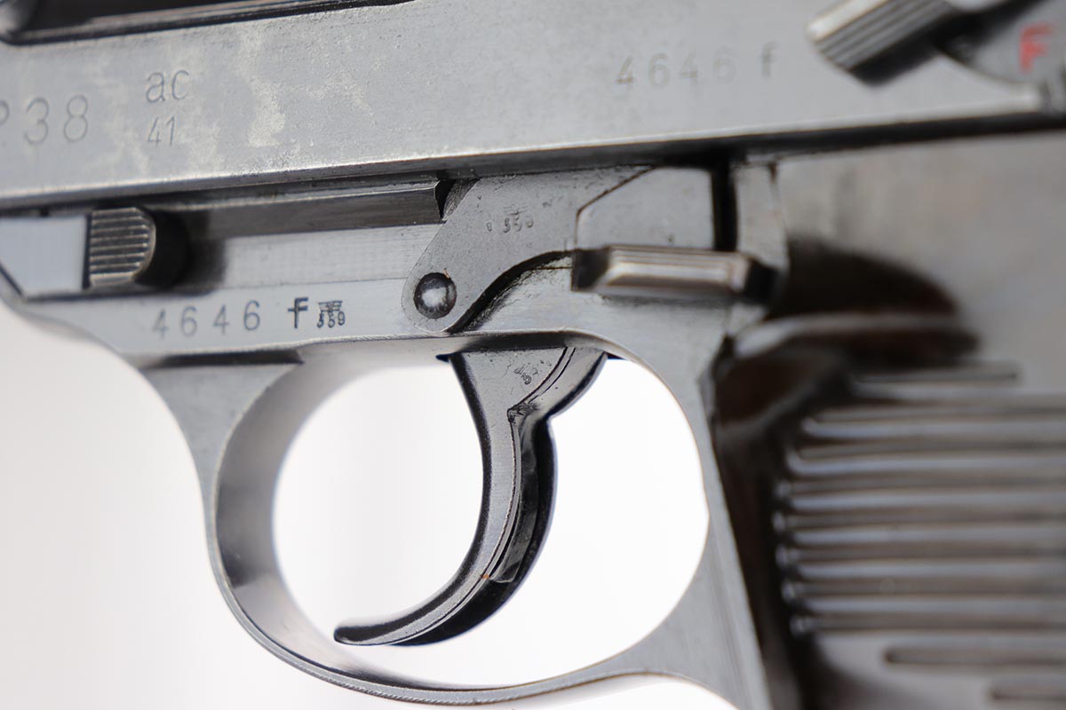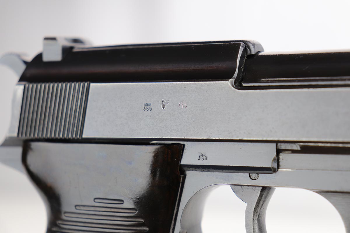 1/29/20 – This is an all matching, second variation Walther P.38 from August of 1941. The high polish blue rates at about 92-93% with some thinning on both sides of the slide, and some oxidation most major surface areas. All small parts are E/359 proofed, including the grips. Early Walther magazine with two spine proofs. Strong, shiny bore. Good mechanics, including de-cocker.