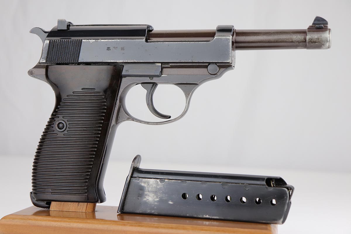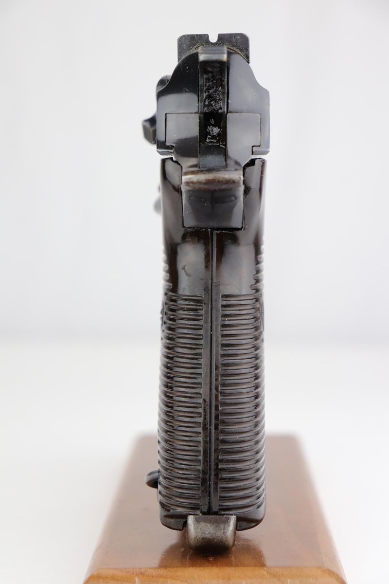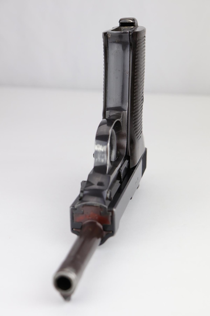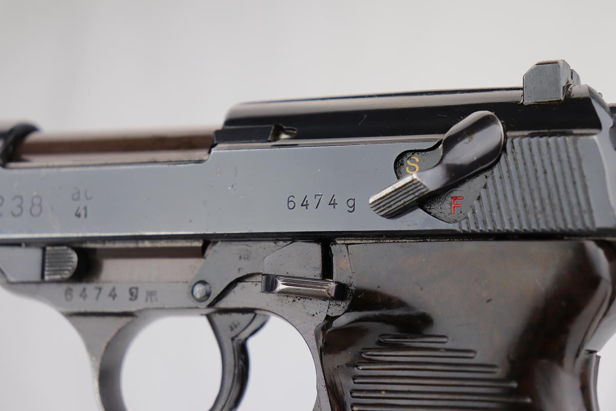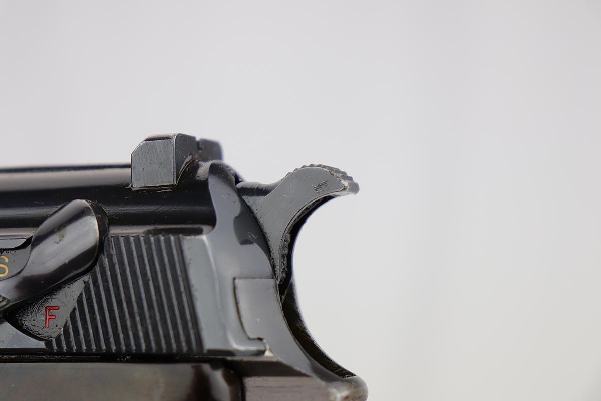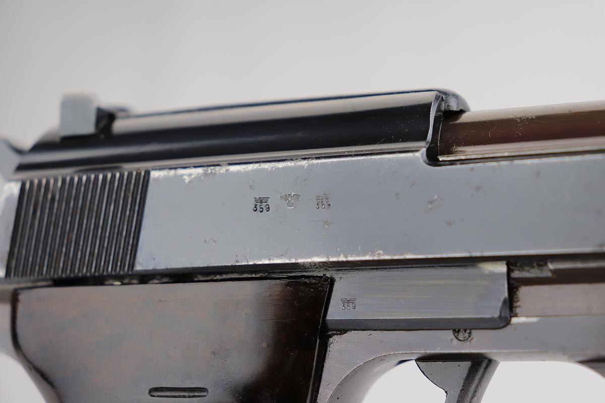 8/29/19 – This is a second variation Walther P.38 from 1941, with high-polish blue but no ‘ac’ proof on slide. The bluing rates at around 92% with the majority of the finish loss on the barrel and trigger guard, as well as minor slide edge wear. All small parts are E/359 proofed, including the grips. Walther magazine. Good mechanics, including de-cocker. Minty bore.