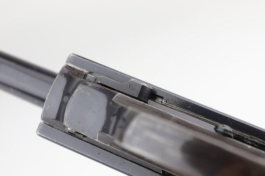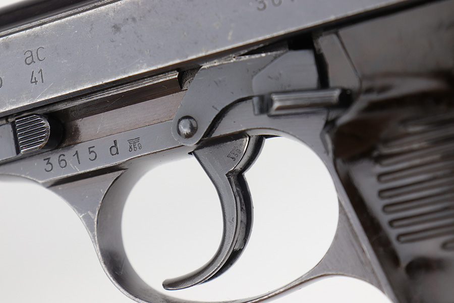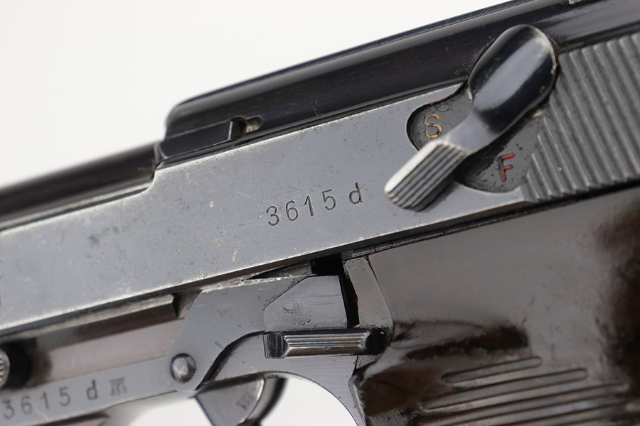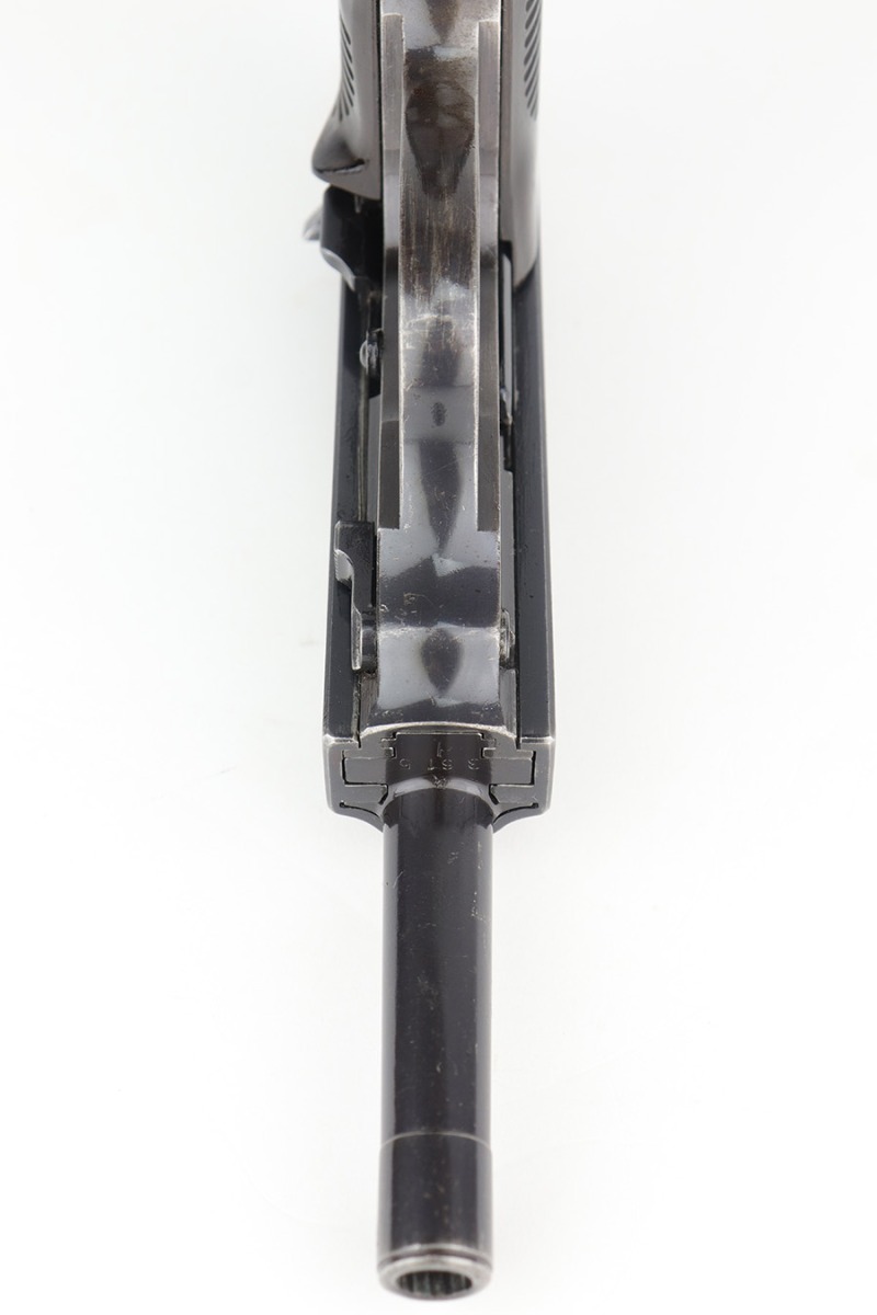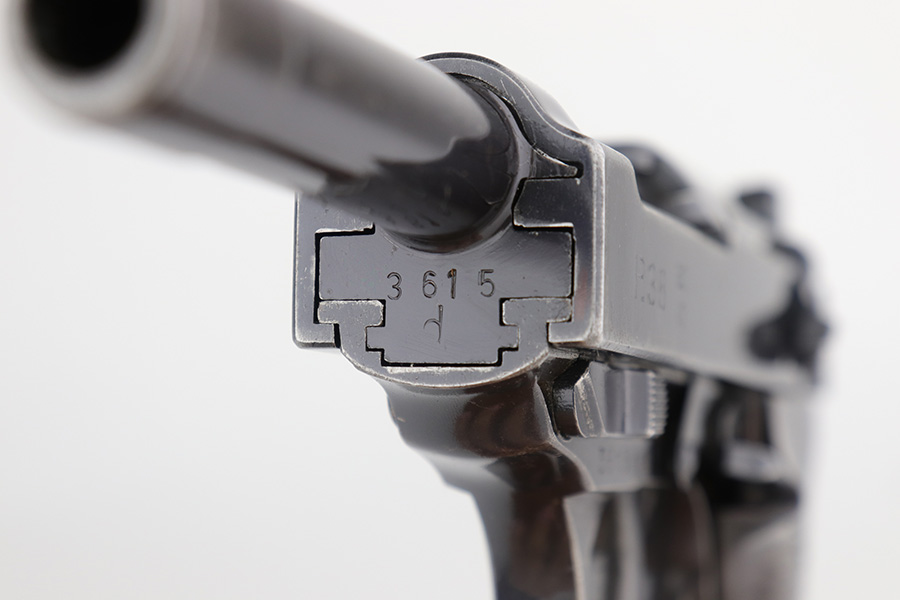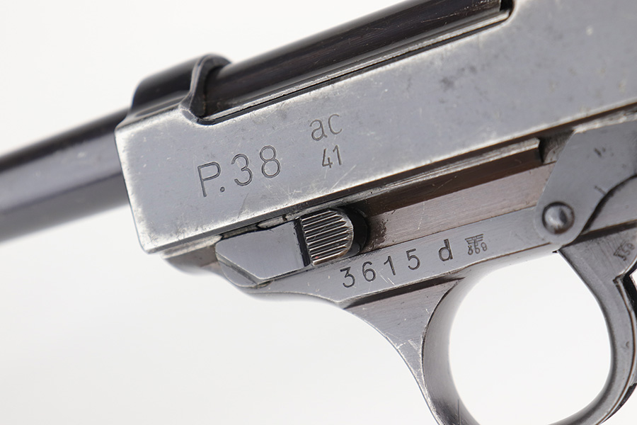 12/23/22 – This is a very nice example of an AC 41 Walther P.38 issued to the Nazi military in 1941. It is all matching and has the proper “Eagle 359” military acceptance proofs throughout. It has retained somewhere between 85-90% of its original high polish finish. Generally, there is wear around the muzzle and along both sides of the slide, concentrated mostly around the high edges. Some thinning and brown patina on the front strap. There is also a small ding in the metal on the front strap. Comes with a set of excellent “Eagle 359” proofed grips and a numbered period-correct magazine that is not matching to the gun but is in the same “d” suffix serial block. The bore has good rifling with minor frosting in the grooves. De-cocker is functional.