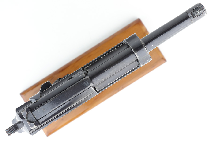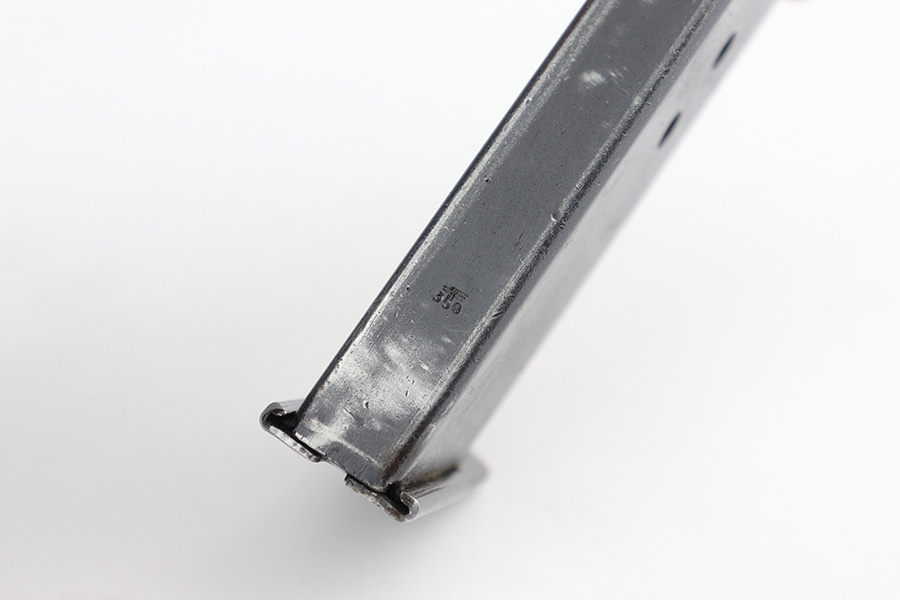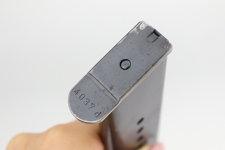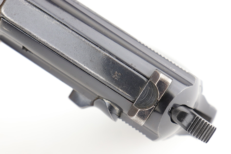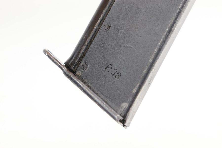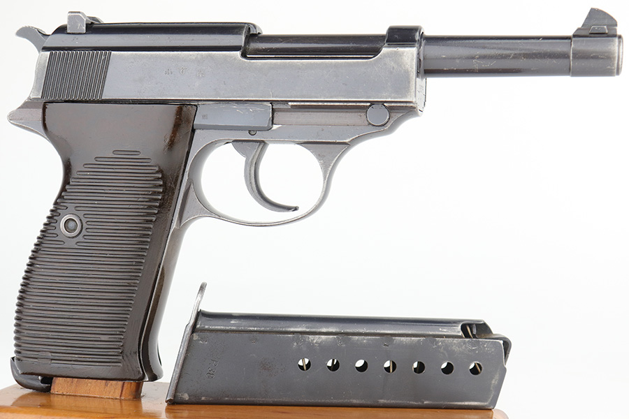 12/23/22 – This is a very nice example of an AC 41 Walther P.38 issued to the Nazi military in 1941. It is all matching and has the proper “Eagle 359” military acceptance proofs throughout. It has retained somewhere between 85-90% of its original high polish finish. Generally, there is wear around the muzzle and along both sides of the slide, concentrated mostly around the high edges. Some thinning and brown patina on the front strap. There is also a small ding in the metal on the front strap. Comes with a set of excellent “Eagle 359” proofed grips and a numbered period-correct magazine that is not matching to the gun but is in the same “d” suffix serial block. The bore has good rifling with minor frosting in the grooves. De-cocker is functional.