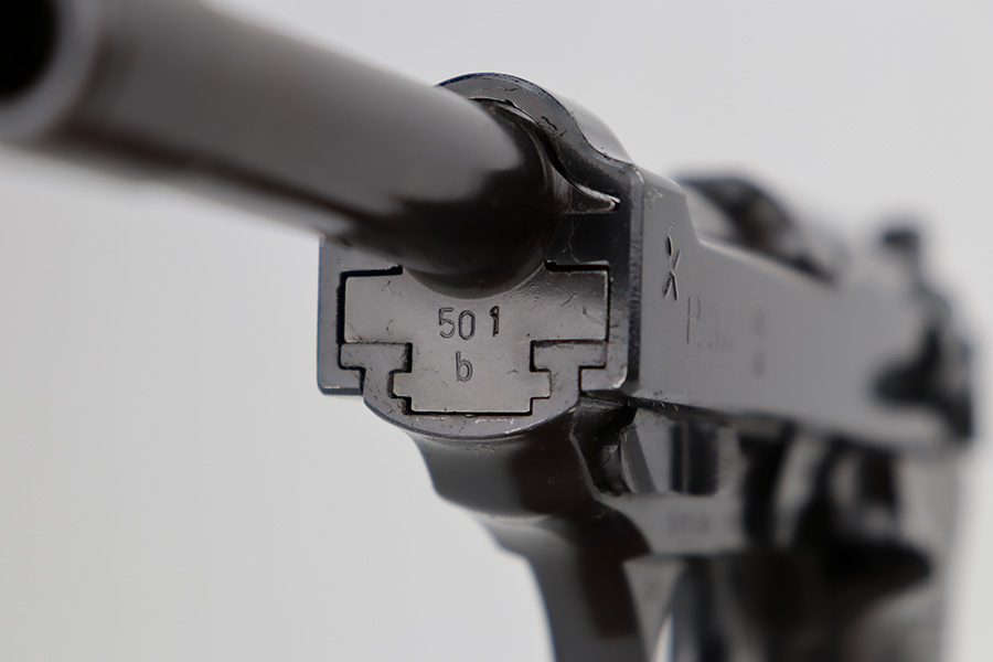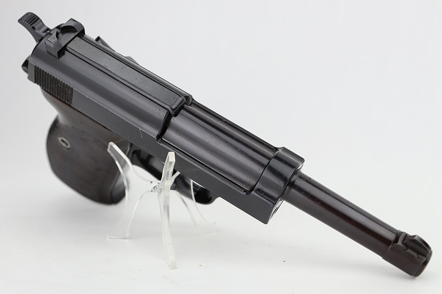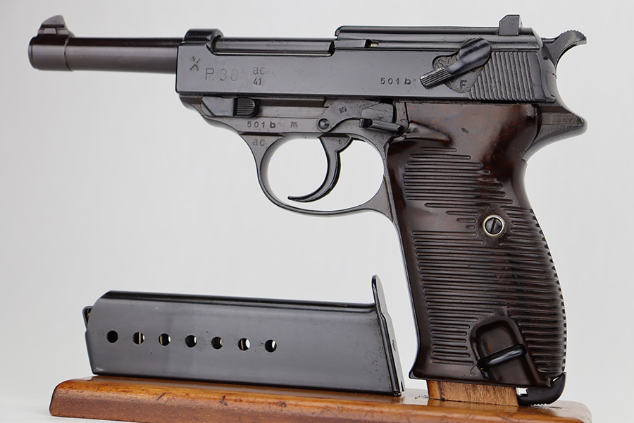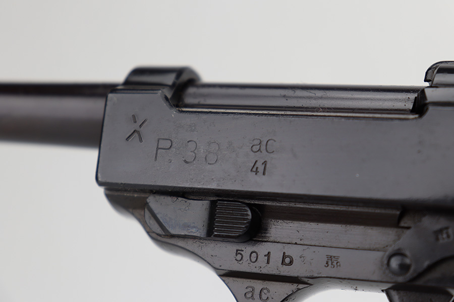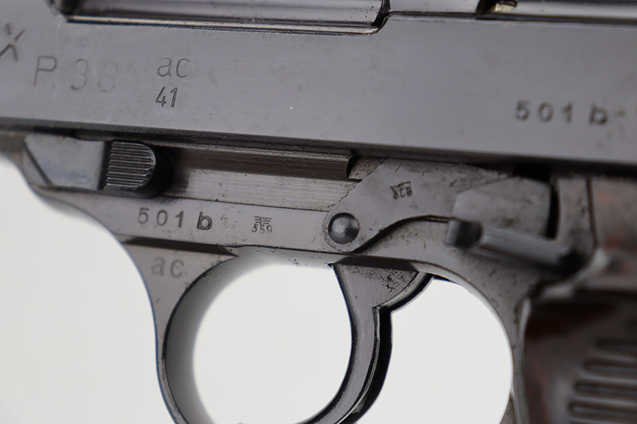 6/15/23 – This is a nice example of an AC 41 Walther P.38 issued to the Nazi military in 1941. It is all matching and has the proper “Eagle 359” military proofs throughout, even on the small parts. This gun was captured by the Russians at the end of WW2, as evidenced by its dark “Russian Dipped” finish and “Russian X” marking on the left side of the slide. There is very little actual finish loss, but there are areas of pin-pricking on the front strap and left side of the slide. Some light scratching on the right side of the slide. Fitted with excellent bakelite grips – the right grip is waffen-proofed, the left is not. Comes with an “Eagle 135” marked Mauser magazine. The bore has decent rifling, but there is pitting throughout. De-cocker is functional.
