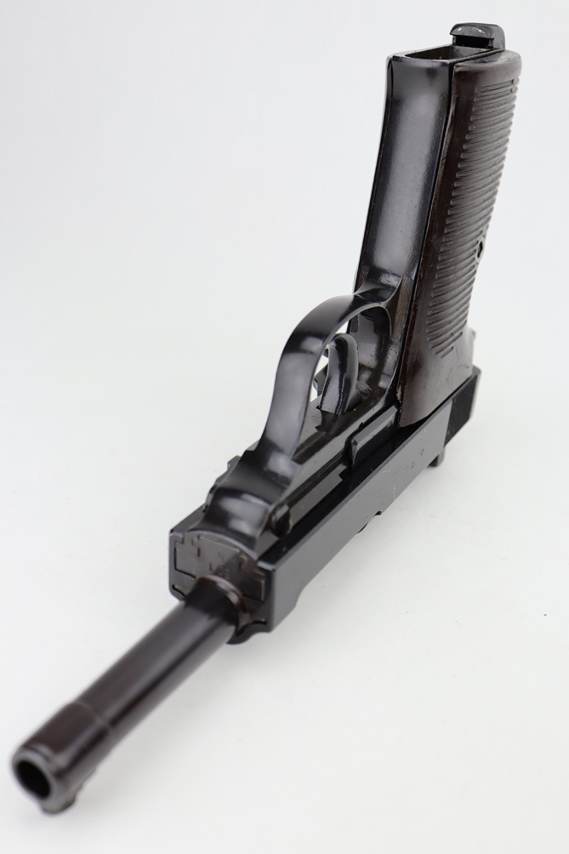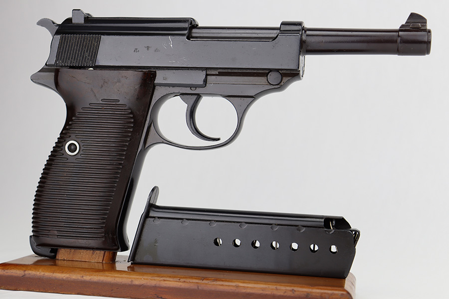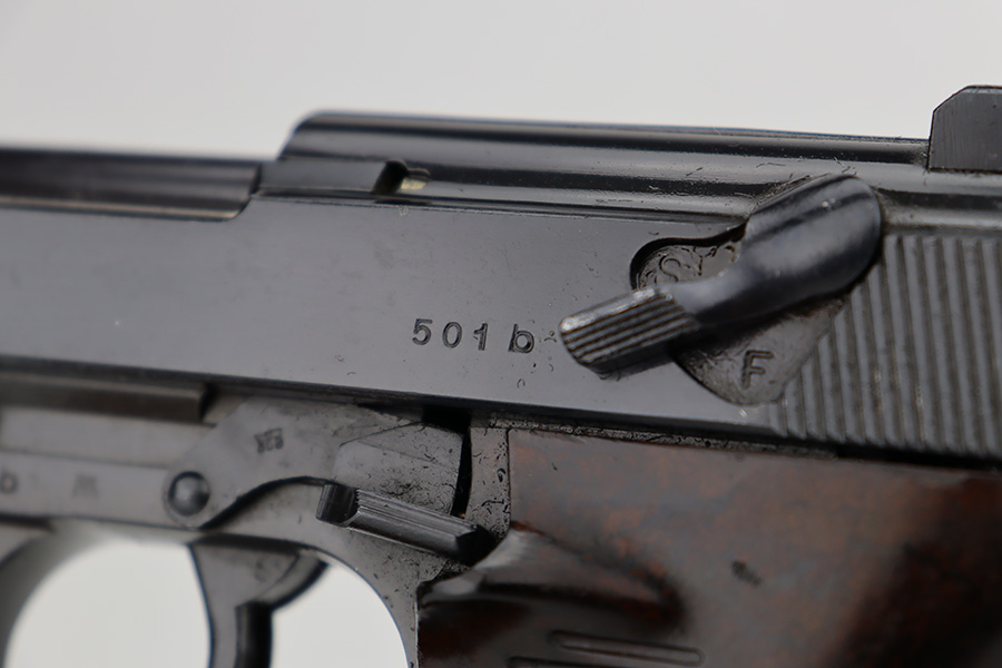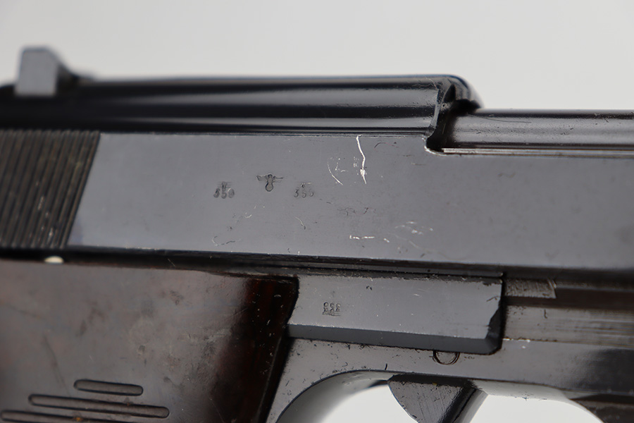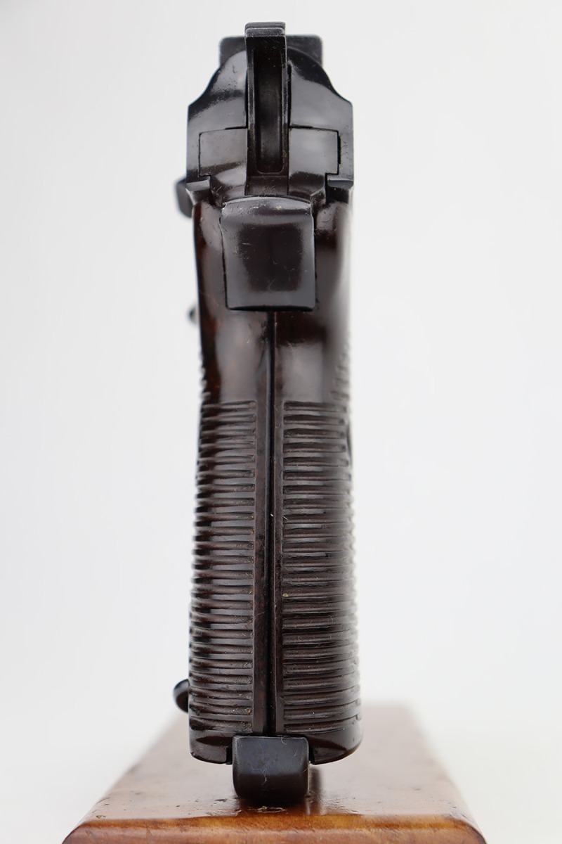 6/15/23 – This is a nice example of an AC 41 Walther P.38 issued to the Nazi military in 1941. It is all matching and has the proper “Eagle 359” military proofs throughout, even on the small parts. This gun was captured by the Russians at the end of WW2, as evidenced by its dark “Russian Dipped” finish and “Russian X” marking on the left side of the slide. There is very little actual finish loss, but there are areas of pin-pricking on the front strap and left side of the slide. Some light scratching on the right side of the slide. Fitted with excellent bakelite grips – the right grip is waffen-proofed, the left is not. Comes with an “Eagle 135” marked Mauser magazine. The bore has decent rifling, but there is pitting throughout. De-cocker is functional.
