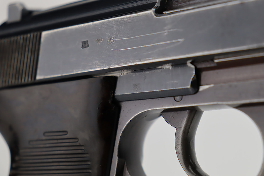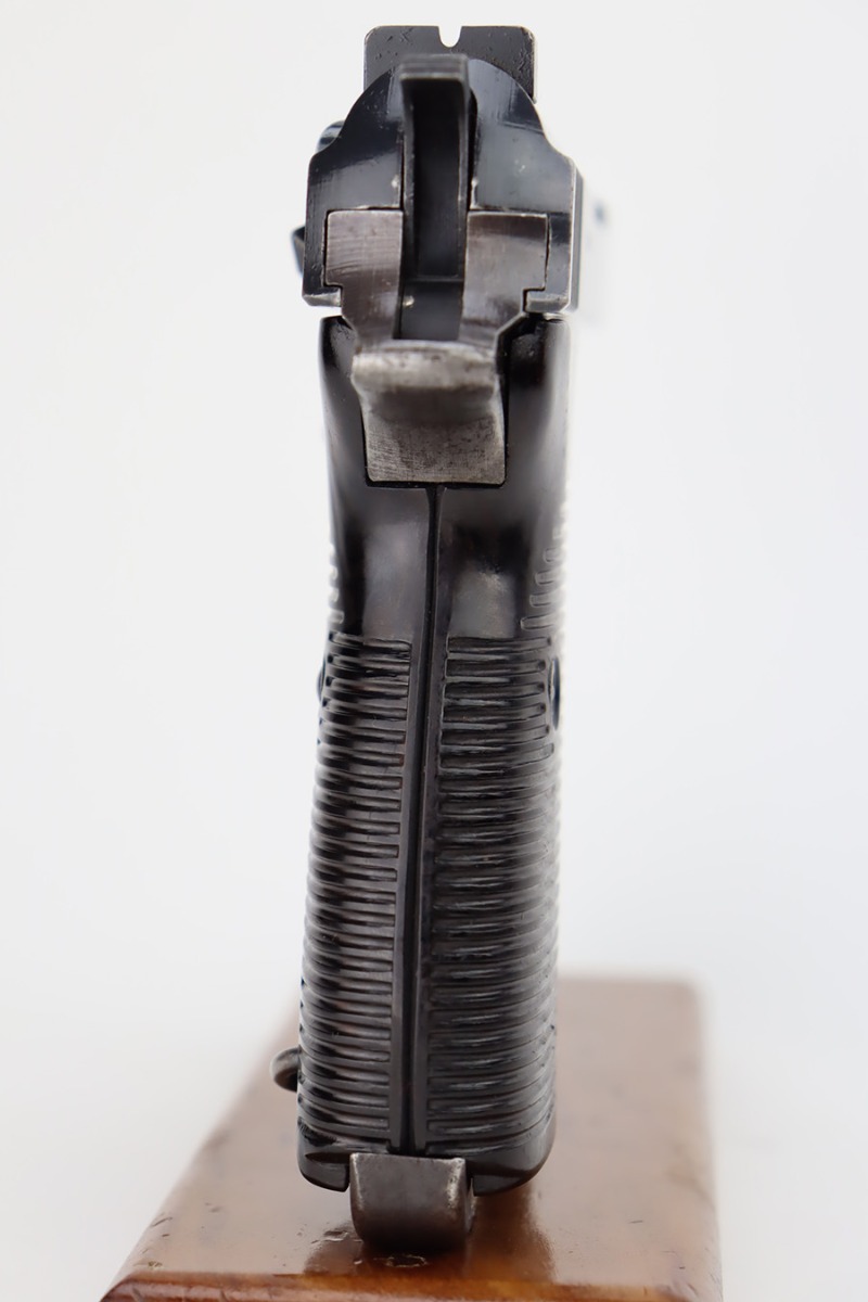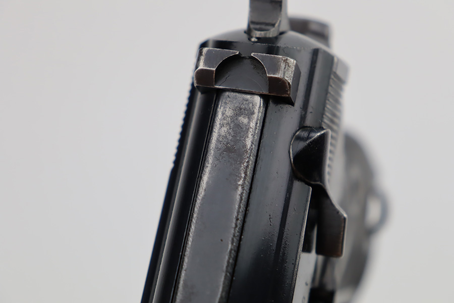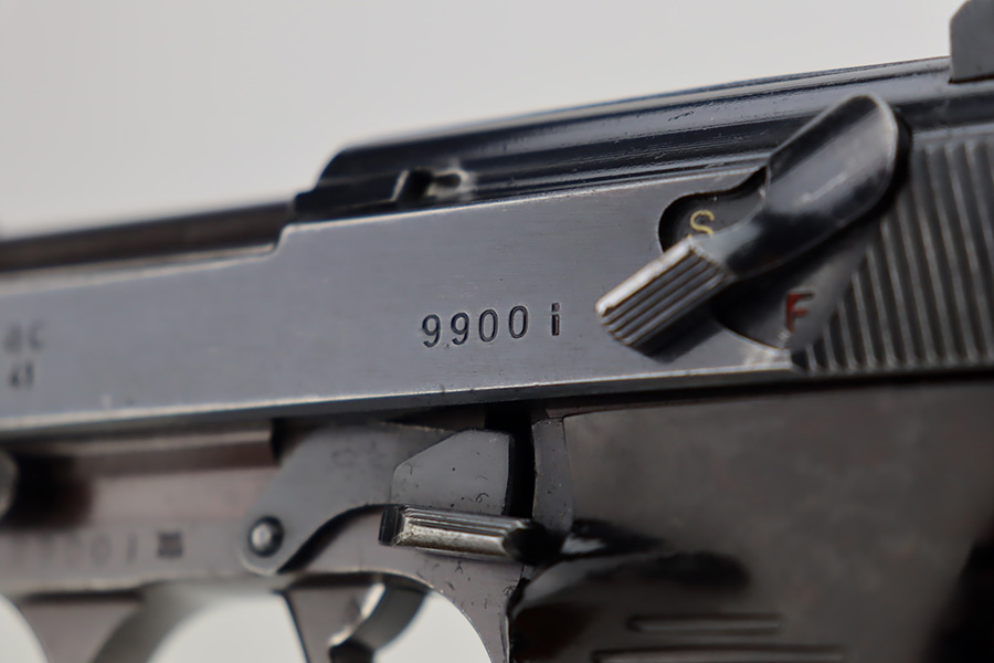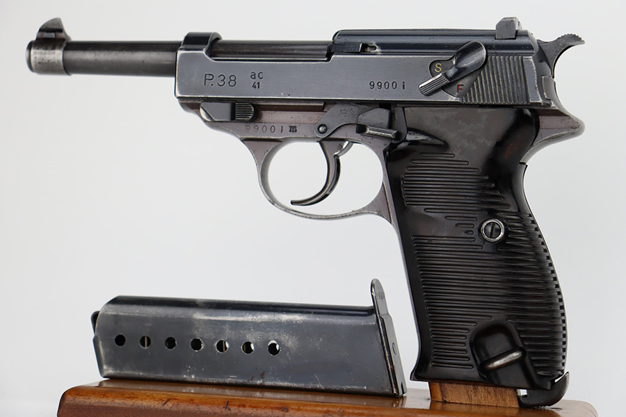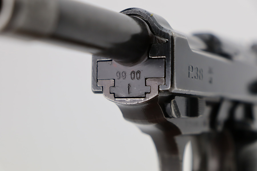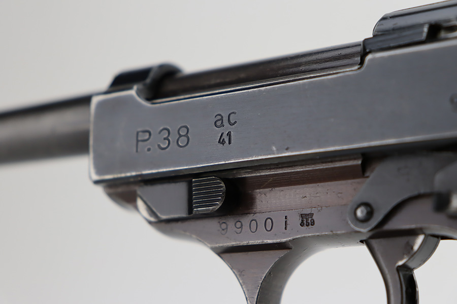 10/20/23 – This is a nice AC 41 Walther P.38 issued to the Nazi military in 1941. It is all matching with the proper “Eagle 359” military acceptance proofs throughout. Fitted with excellent waffen-proofed grips. It comes with a numbered magazine that is in the same “i” block, but it is not matching. The original high polish bluing rates roughly 70% with obvious finish loss on the front strap and along the barrel. General high edge wear with a couple of very light scratches on the right side of the slide. The bore has good rifling, but there is pin-pricking throughout. De-cocker is not functional.