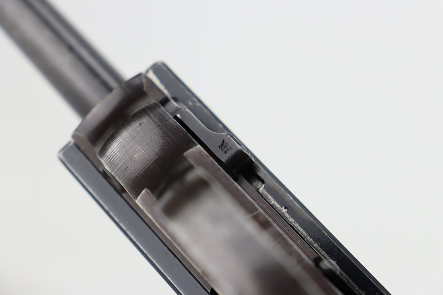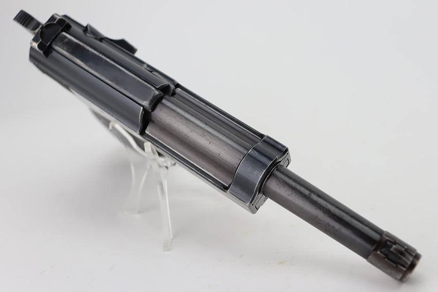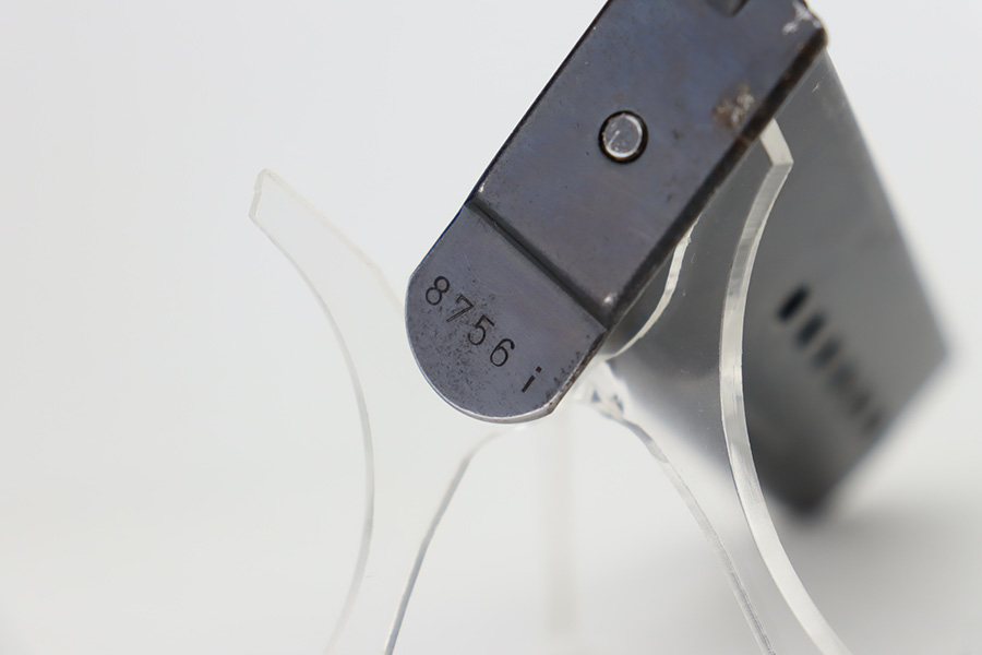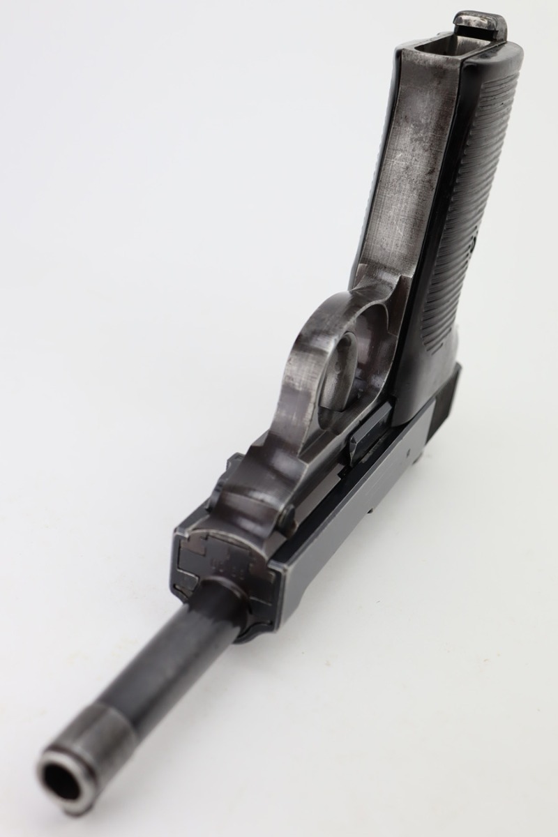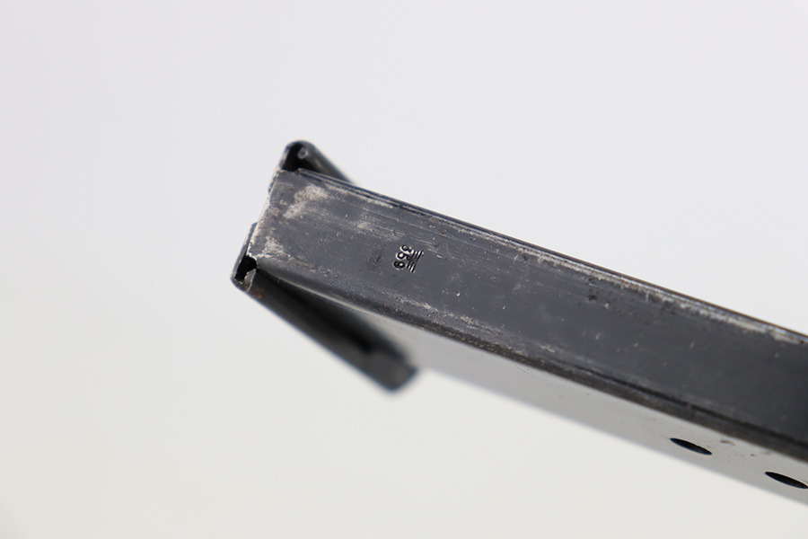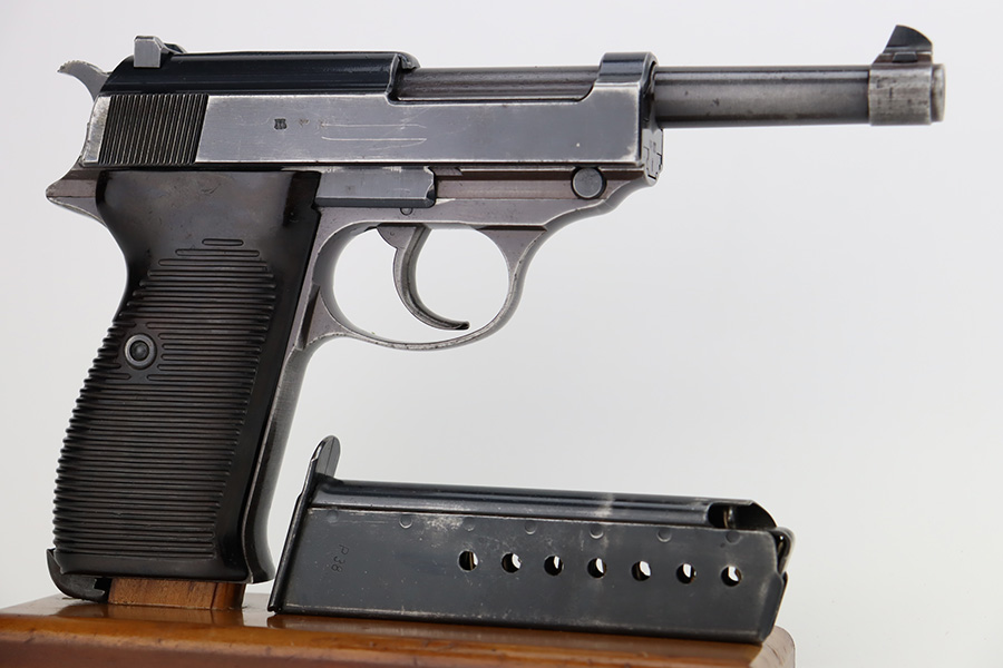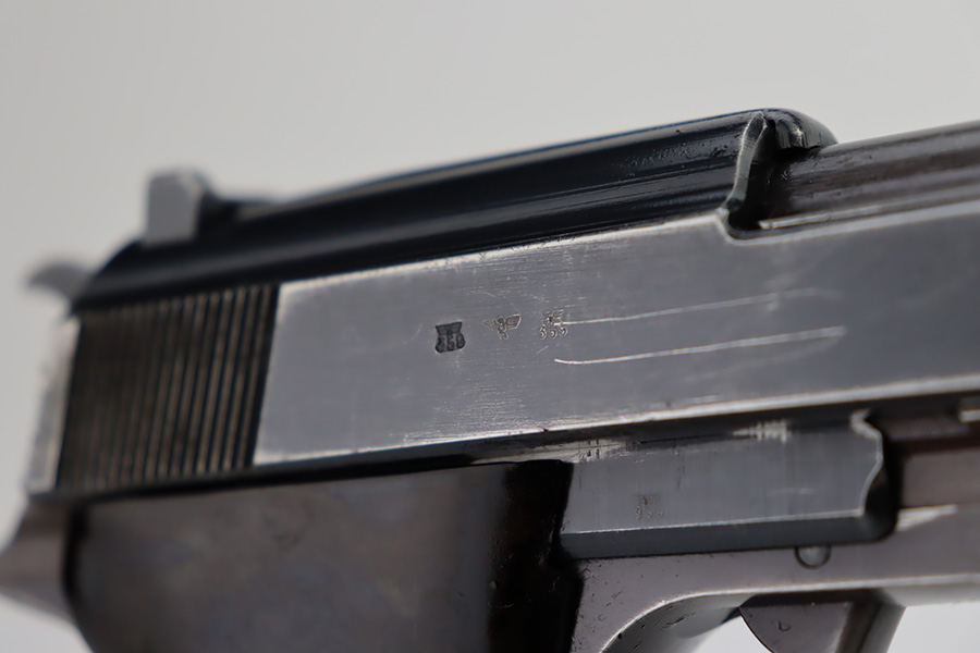10/20/23 – This is a nice AC 41 Walther P.38 issued to the Nazi military in 1941. It is all matching with the proper “Eagle 359” military acceptance proofs throughout. Fitted with excellent waffen-proofed grips. It comes with a numbered magazine that is in the same “i” block, but it is not matching. The original high polish bluing rates roughly 70% with obvious finish loss on the front strap and along the barrel. General high edge wear with a couple of very light scratches on the right side of the slide. The bore has good rifling, but there is pin-pricking throughout. De-cocker is not functional.