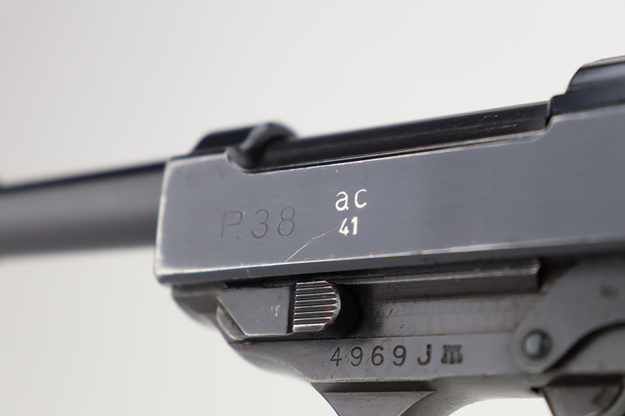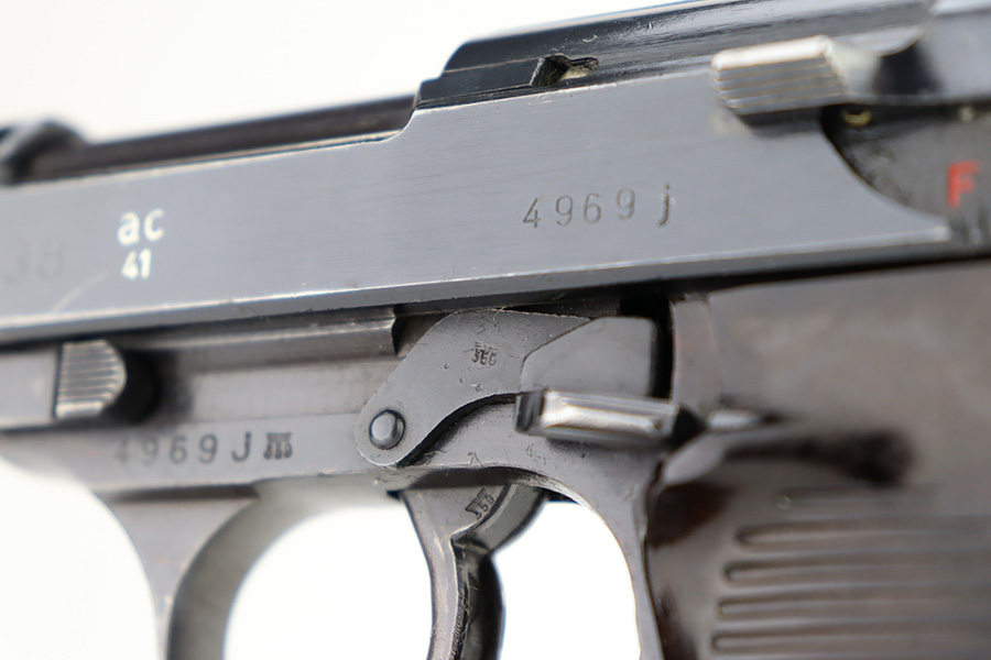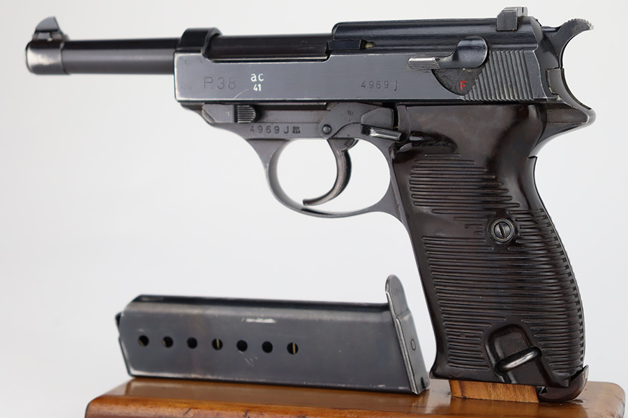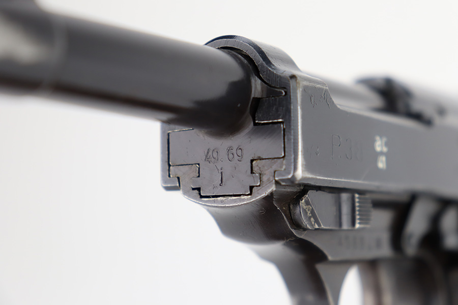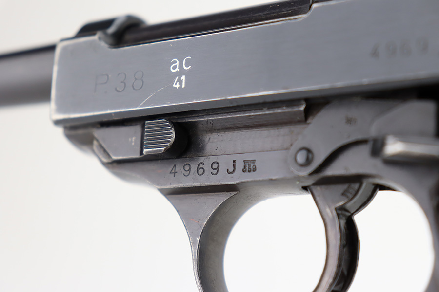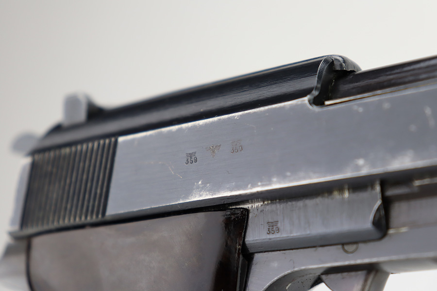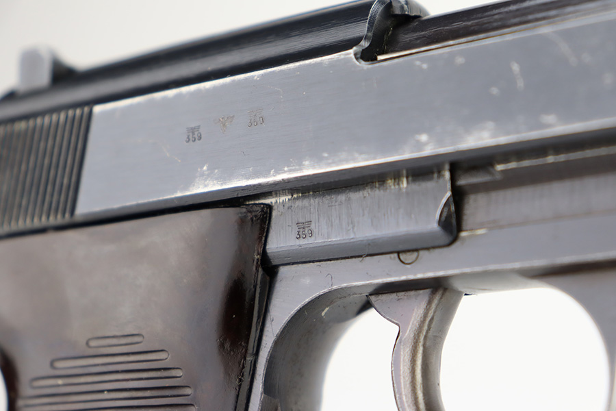 12/8/23 – This is a very nice AC 41 Walther P.38 issued to the German military in 1941. All matching with the proper “Eagle 359” military acceptance proofs throughout, even on the small parts. Fitted with excellent “Eagle 359” proofed Walther grips. Comes with a numbered but mismatched magazine #9546i. The bluing on the gun rates about 93% with minor wear around the muzzle and on the high edges of the slide. Some minor thinning on the front strap. Very nice bore with great rifling. De-cocker is functional.