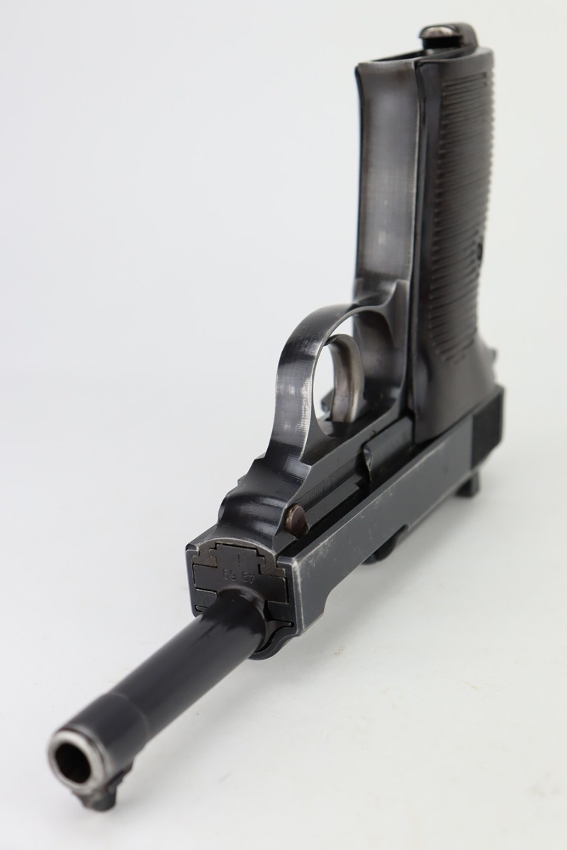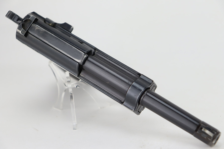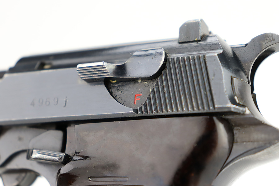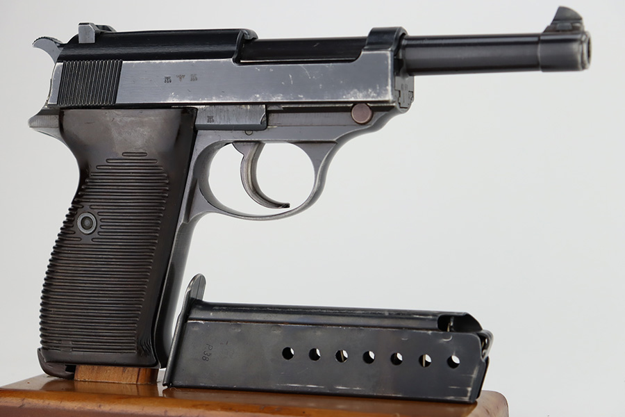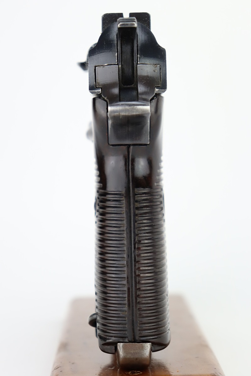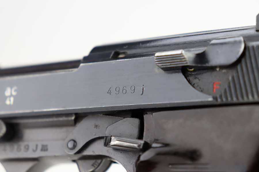 12/8/23 – This is a very nice AC 41 Walther P.38 issued to the German military in 1941. All matching with the proper “Eagle 359” military acceptance proofs throughout, even on the small parts. Fitted with excellent “Eagle 359” proofed Walther grips. Comes with a numbered but mismatched magazine #9546i. The bluing on the gun rates about 93% with minor wear around the muzzle and on the high edges of the slide. Some minor thinning on the front strap. Very nice bore with great rifling. De-cocker is functional.