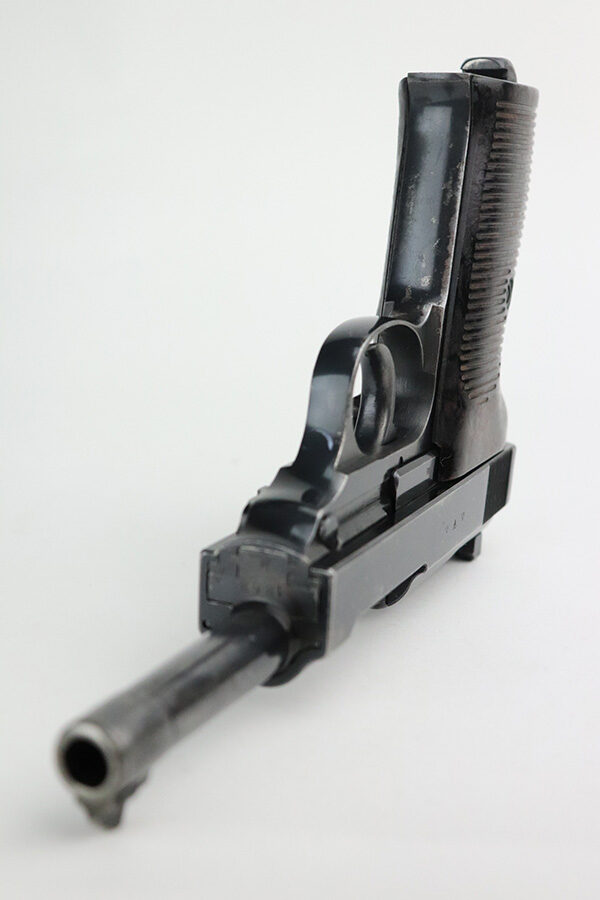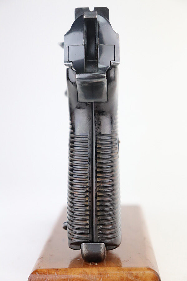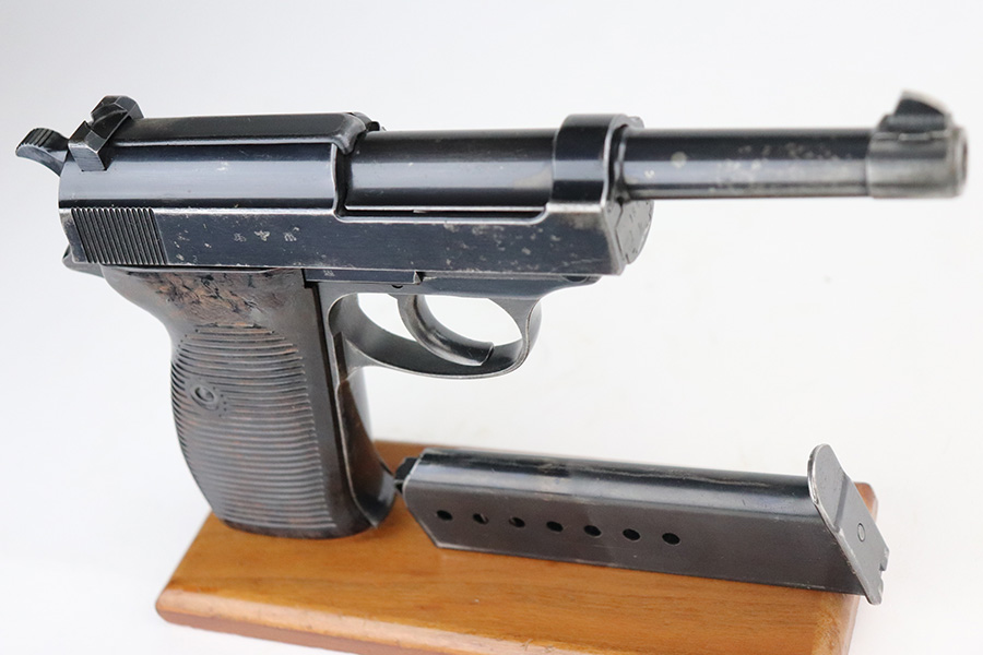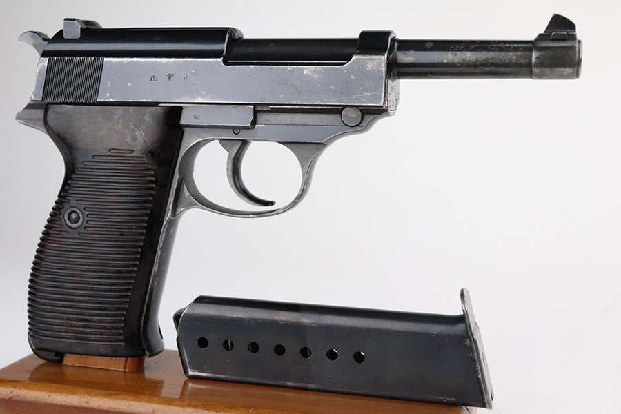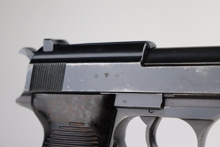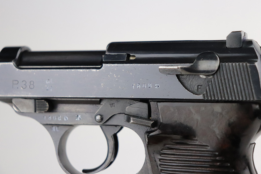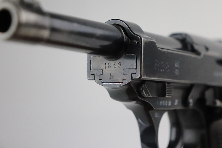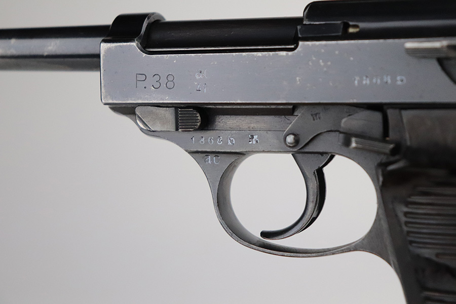 7/16/21 – This is a nice example of a first-variation AC 41 Walther P.38 issued to the Nazi military in 1941. It is all matching and has the proper “Eagle 359” military proofs throughout, even on the small parts. It has retained somewhere between 85 and 90% of its original high polish finish. There are areas of splotchy discoloration on the front strap, on the barrel, and both sides of the slide. Wear on the high edges of the slide and around the muzzle. Comes with excellent waffen-proofed grips and an un-numbered Walther magazine. Excellent bore – shiny with strong rifling with hints of freckling in the grooves. De-cocker is functional.