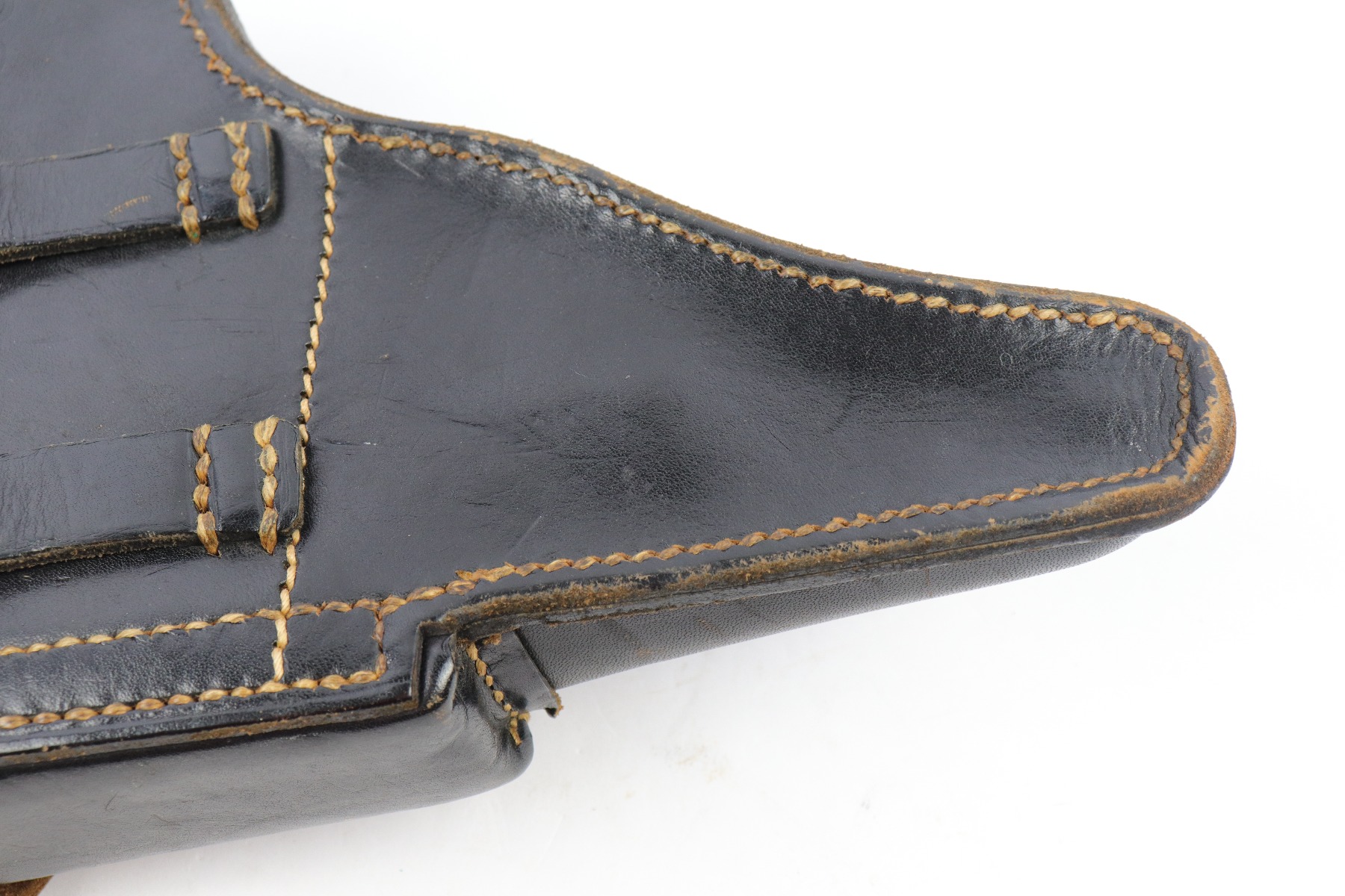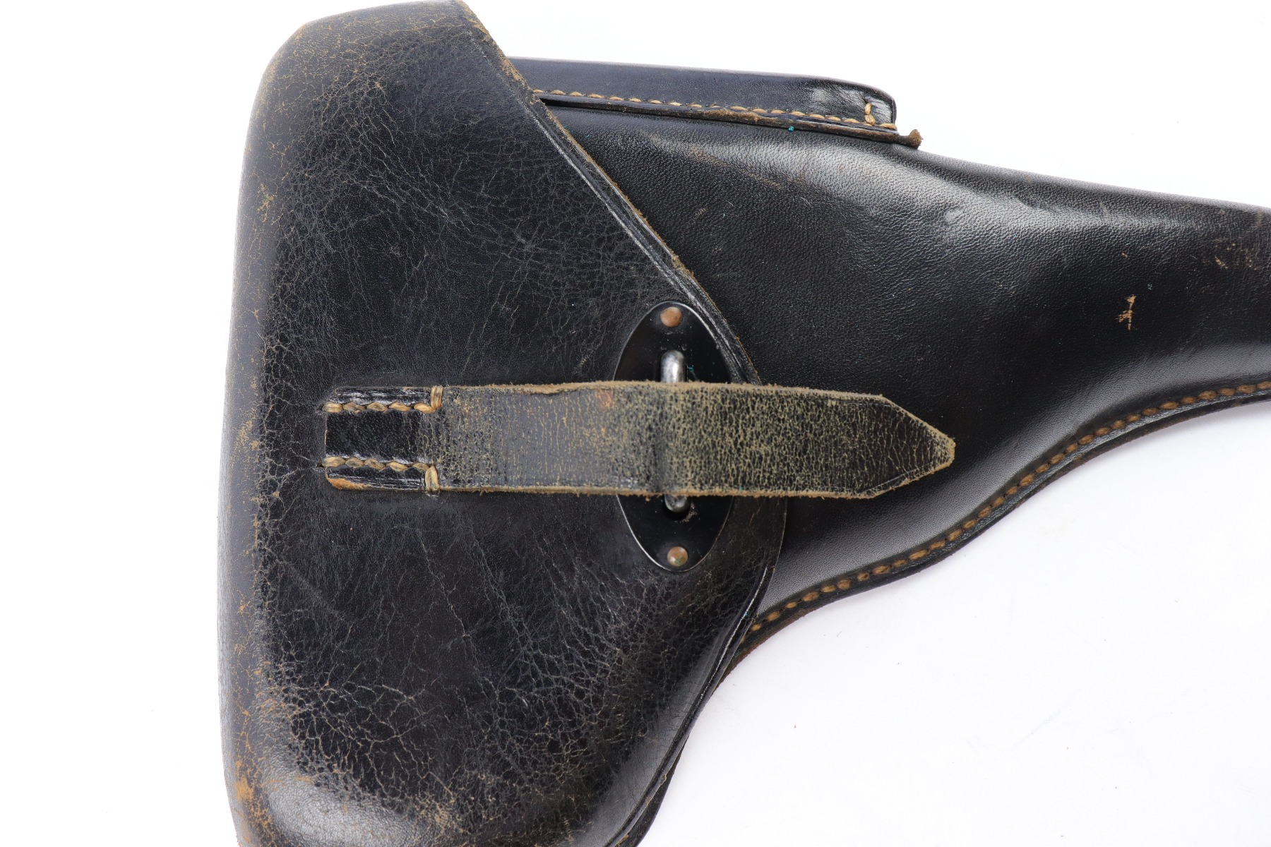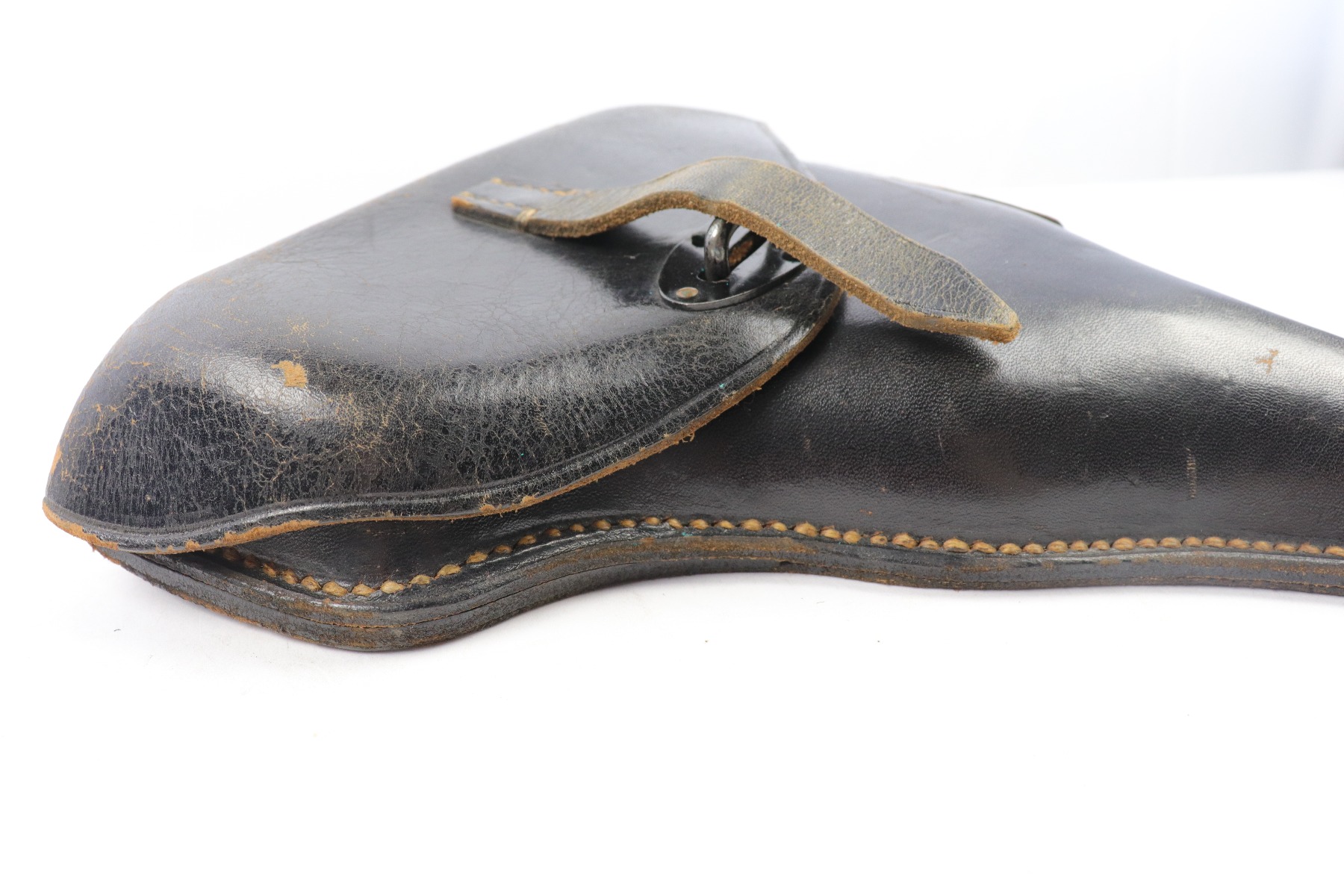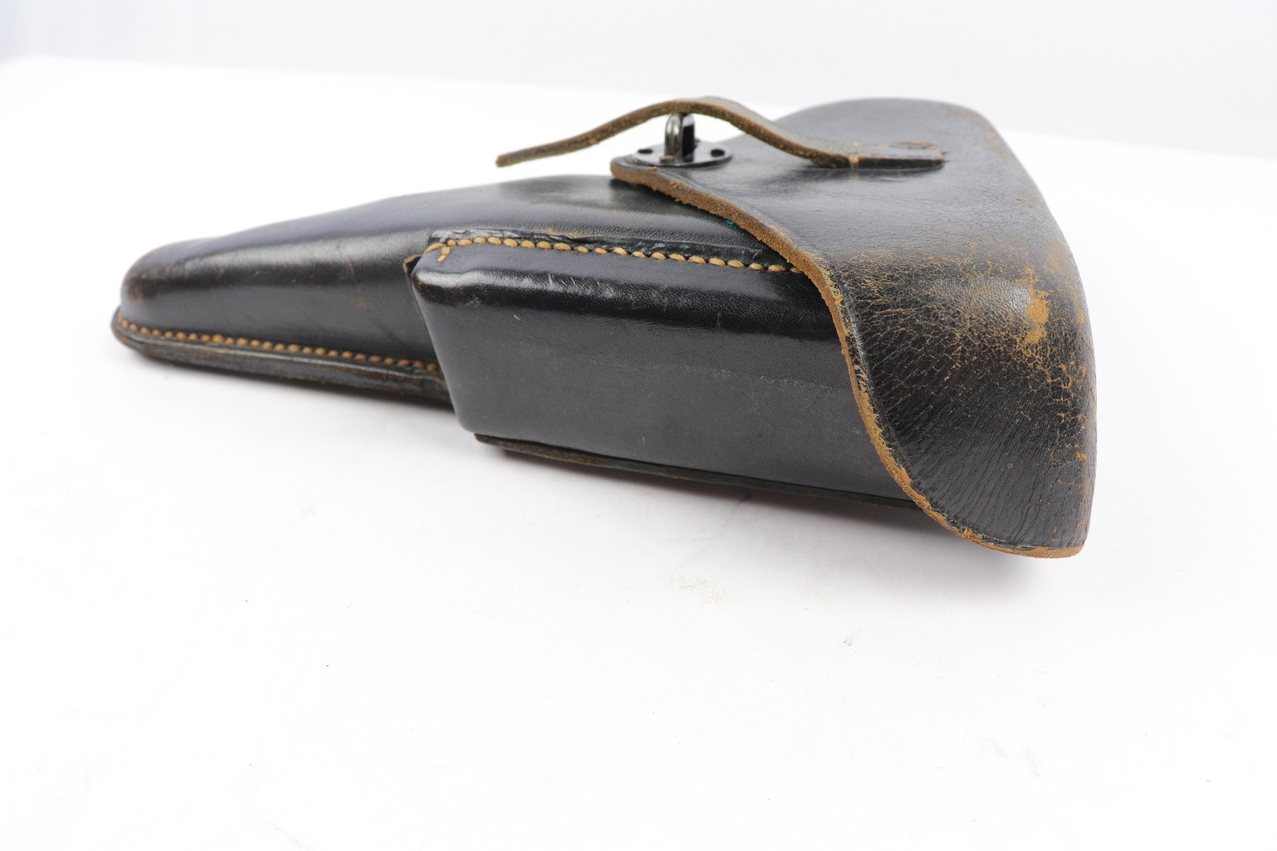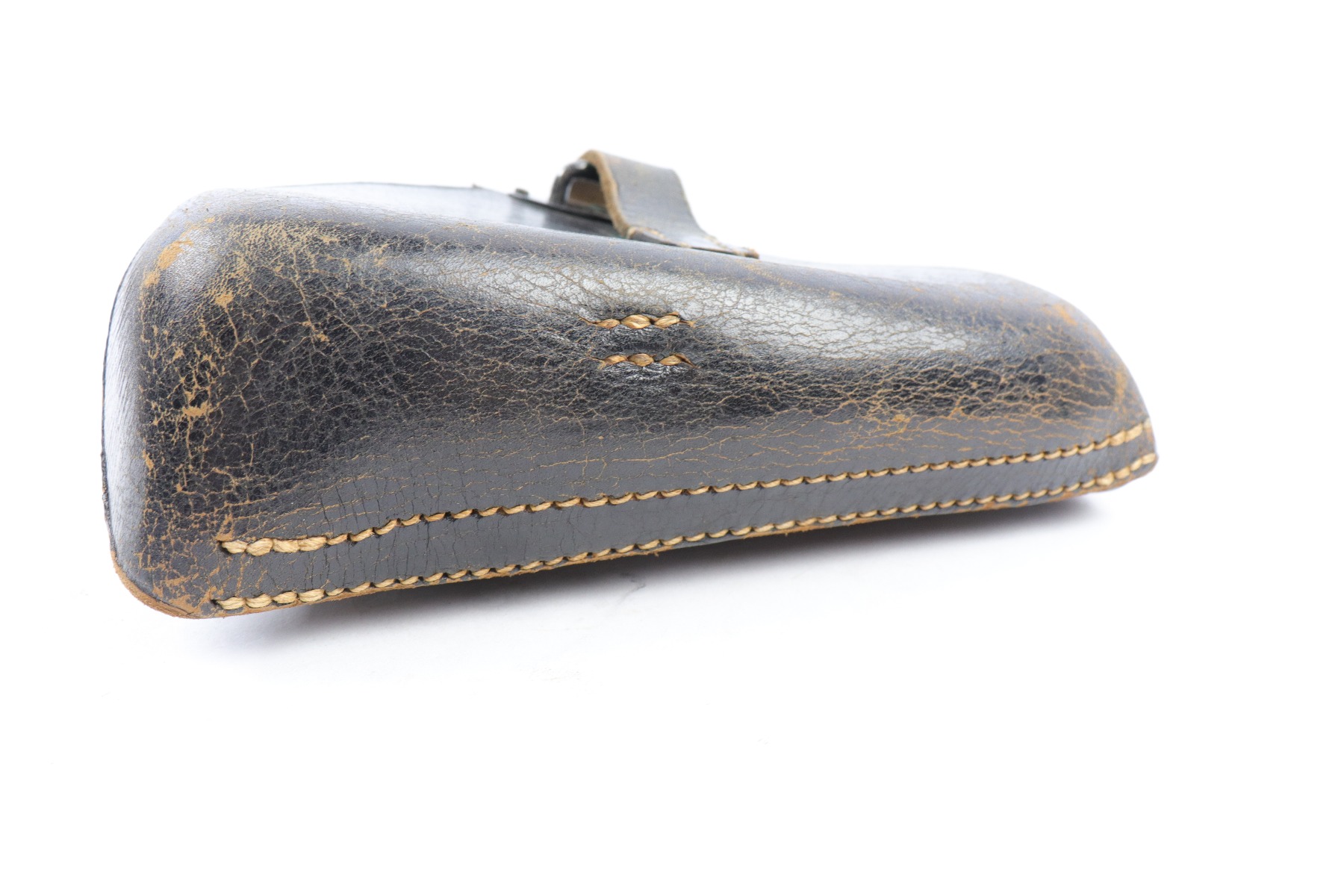 4/9/18 – This is an original 1941 dated P.38 hardshell holster. The holster is “joa” maker stamped with a 1941 date and waffen WaA706 military proof stamped. The holster leather is fairly firm with some pliability and overall very nice. There is some light surface wrinkling throughout the front lid piece of leather – as shown in photos. The wrinkling isn’t very deep into the leather at all. The sttiching is all tight and original with no notable flaws. The interior leather is clean. Guaranteed original and authentic.