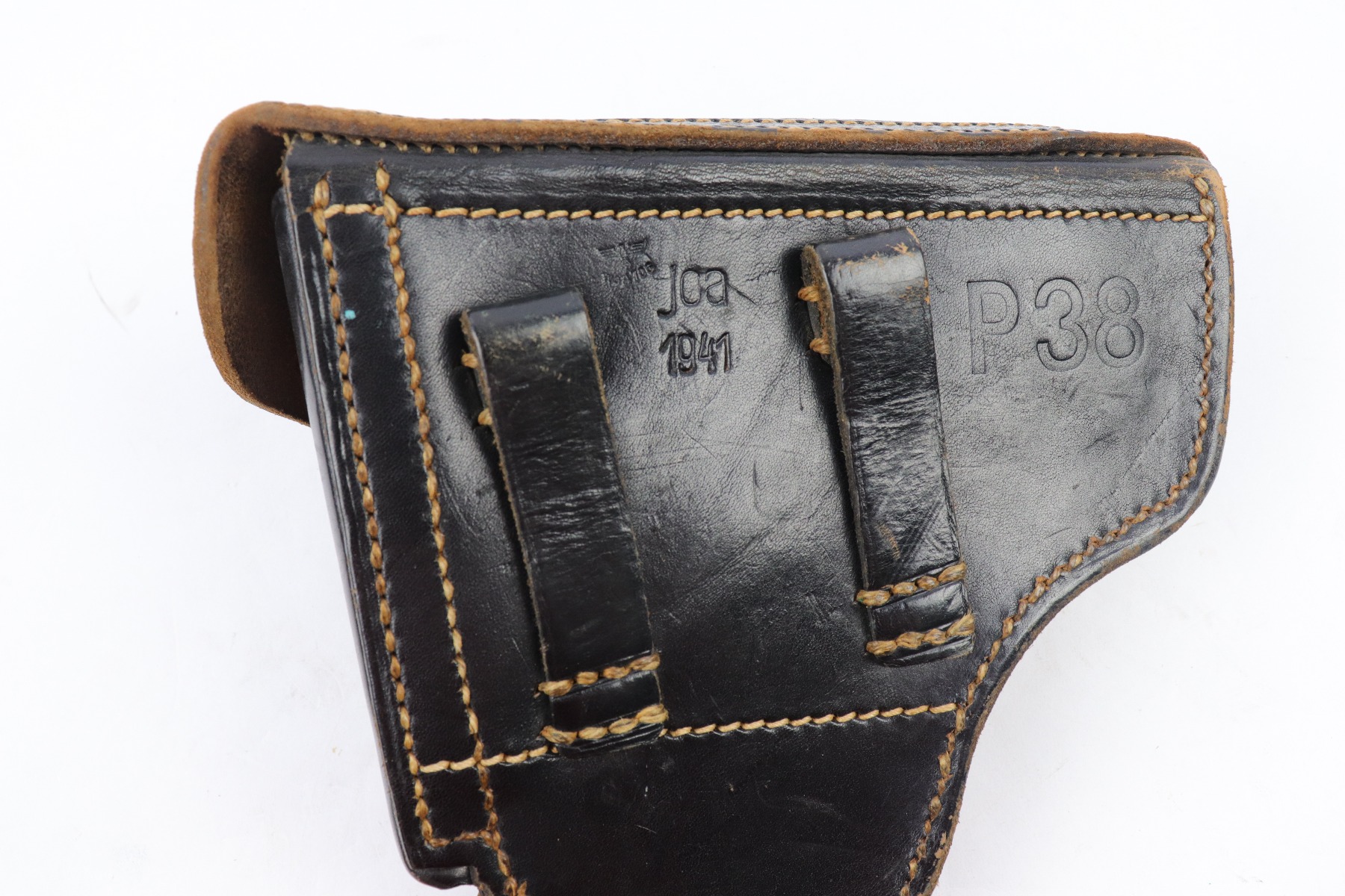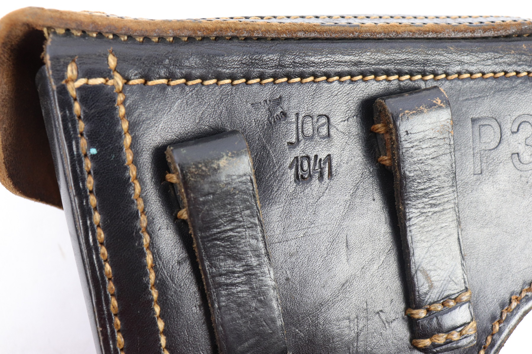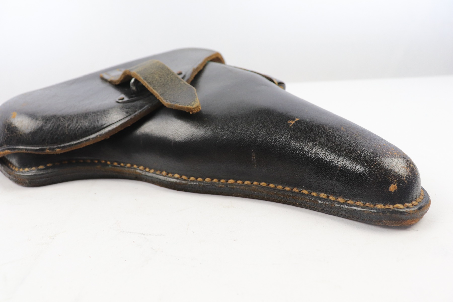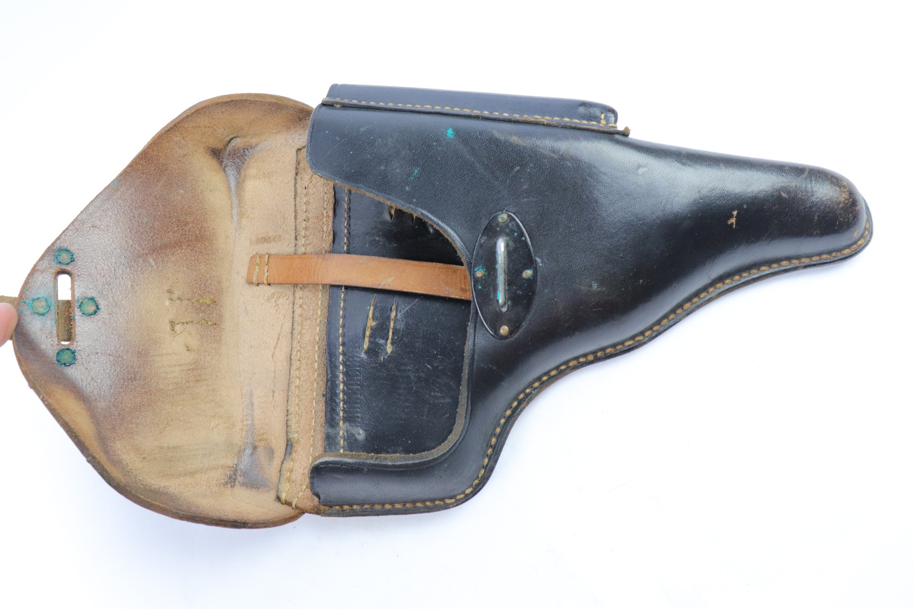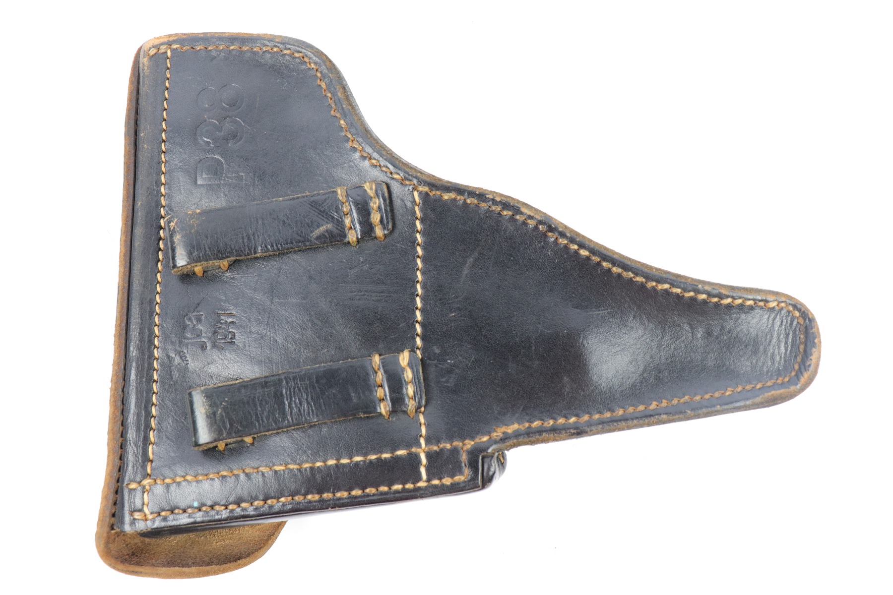 4/9/18 – This is an original 1941 dated P.38 hardshell holster. The holster is “joa” maker stamped with a 1941 date and waffen WaA706 military proof stamped. The holster leather is fairly firm with some pliability and overall very nice. There is some light surface wrinkling throughout the front lid piece of leather – as shown in photos. The wrinkling isn’t very deep into the leather at all. The sttiching is all tight and original with no notable flaws. The interior leather is clean. Guaranteed original and authentic.
