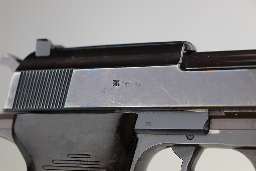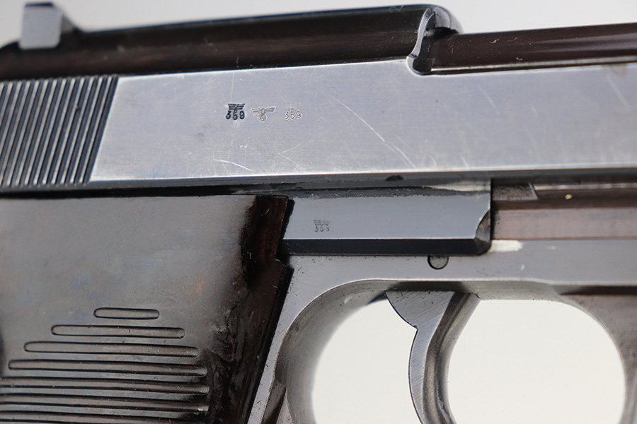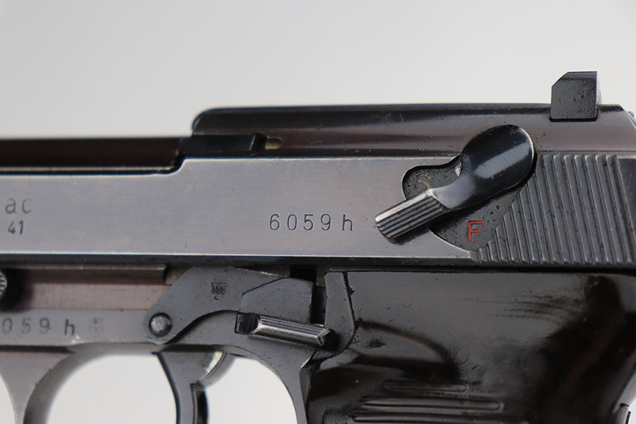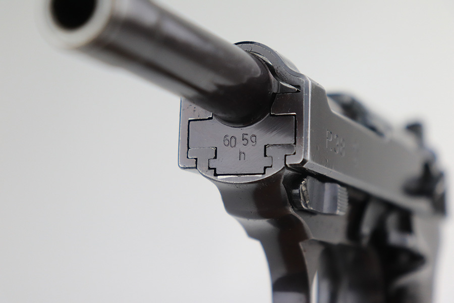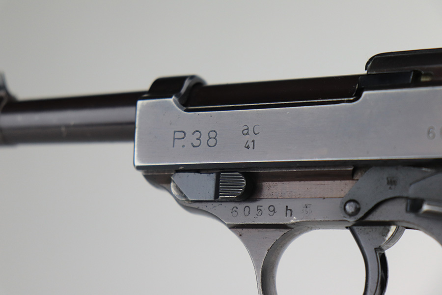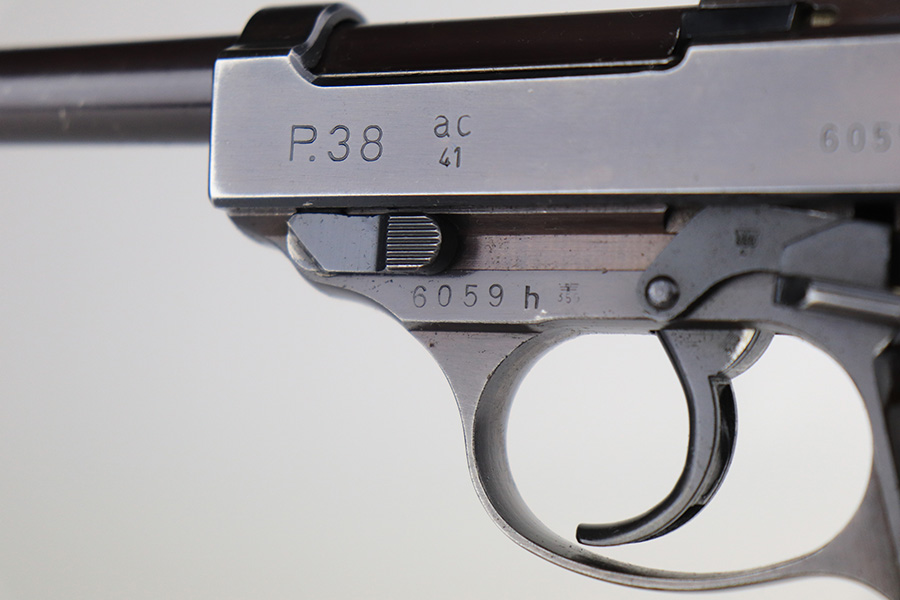 12/10/21 – This is a fully original and matching Walther P.38 with the original numbered magazine.  This is a second variation ‘ac 41’ with high-polish finish and rare horseshoe sear.  The grips are waffen proofed and the right panel is the correct, rare variation made to fit the horseshoe sear.  The finish rates at 93-94% with high edge thinning and some thinning on the front strap.  Excellent bore.  De-cocker functions properly.  Magazine is fully correct and numbered to the pistol.   NOTE: Comes with only the one matching magazine, though two are shown in photos.