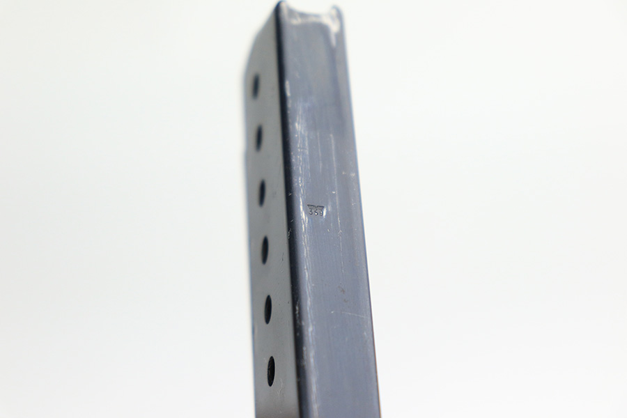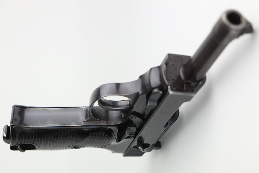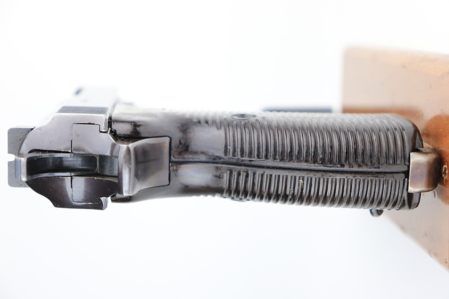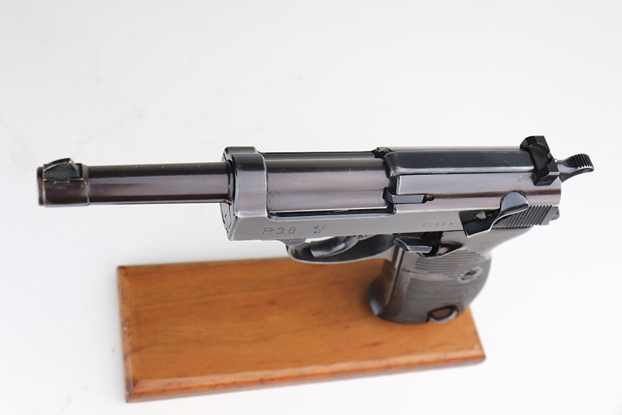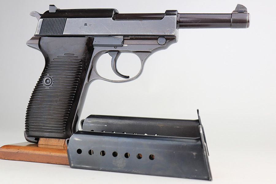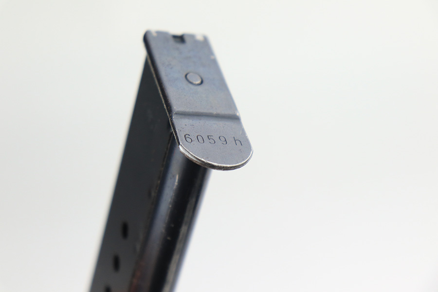 12/10/21 – This is a fully original and matching Walther P.38 with the original numbered magazine.  This is a second variation ‘ac 41’ with high-polish finish and rare horseshoe sear.  The grips are waffen proofed and the right panel is the correct, rare variation made to fit the horseshoe sear.  The finish rates at 93-94% with high edge thinning and some thinning on the front strap.  Excellent bore.  De-cocker functions properly.  Magazine is fully correct and numbered to the pistol.   NOTE: Comes with only the one matching magazine, though two are shown in photos.