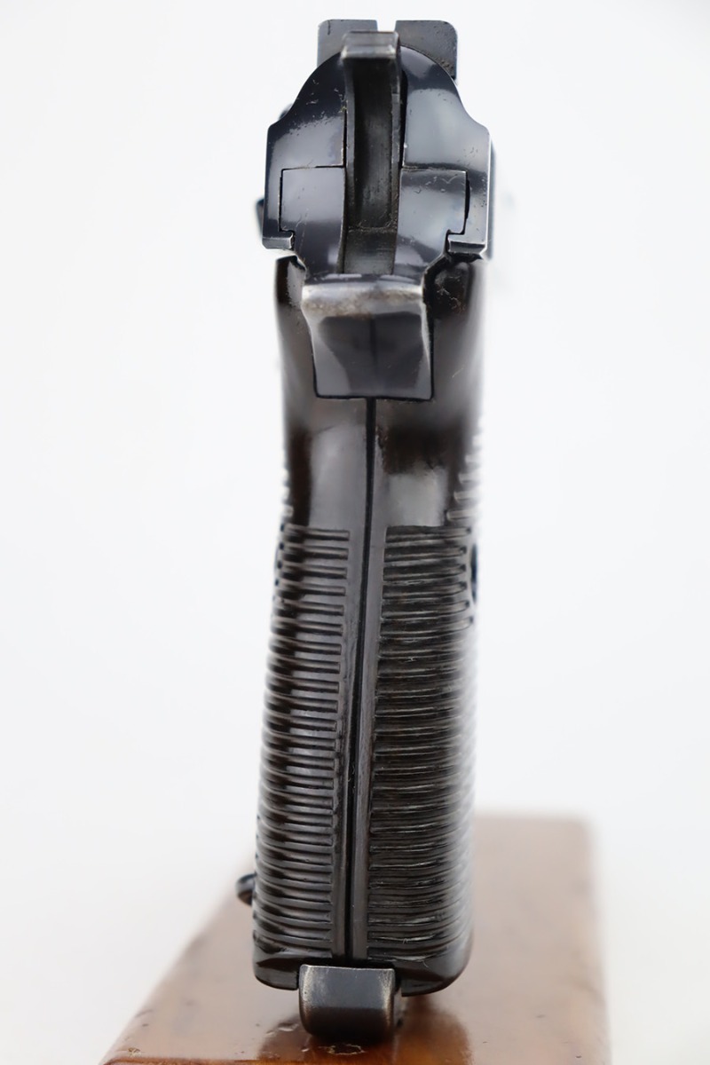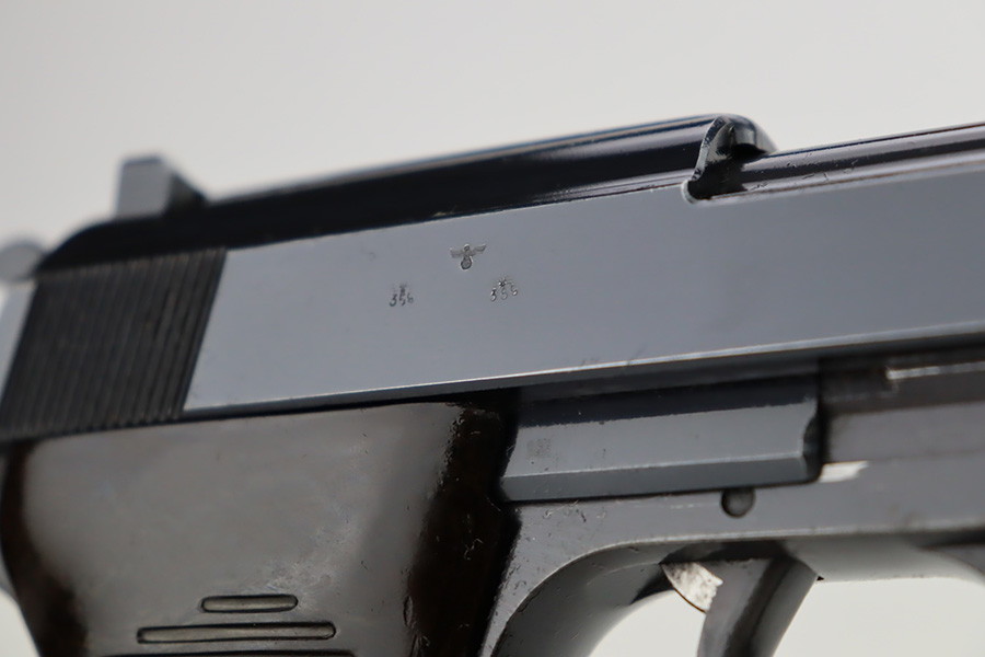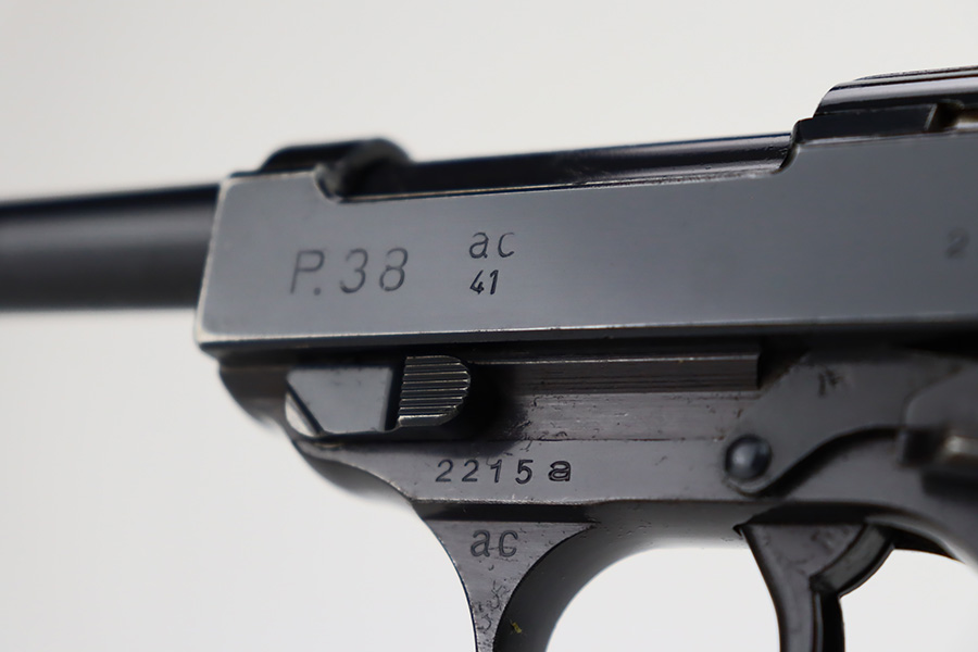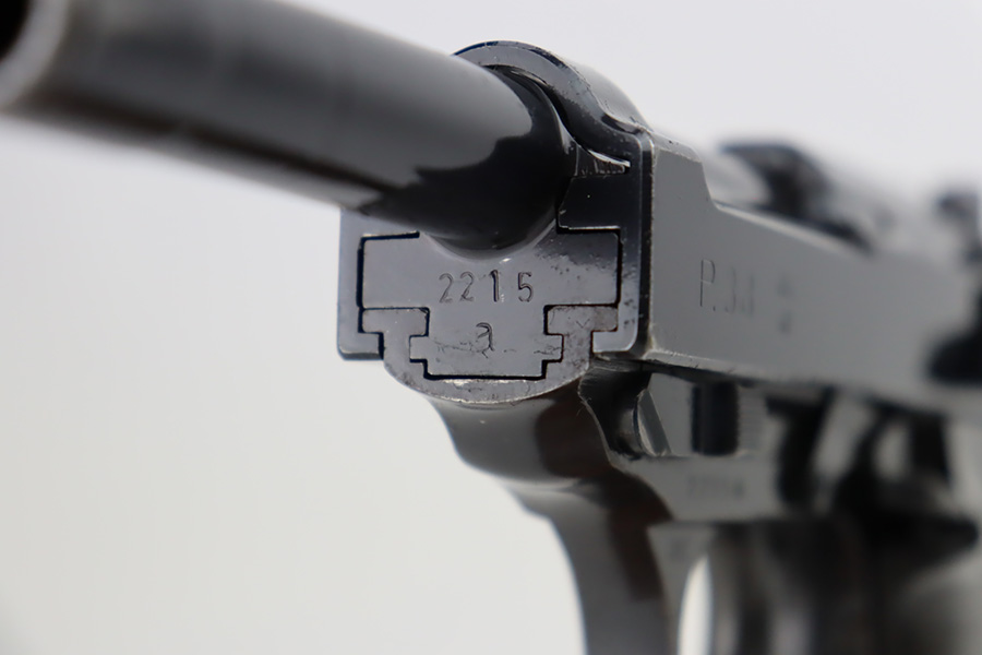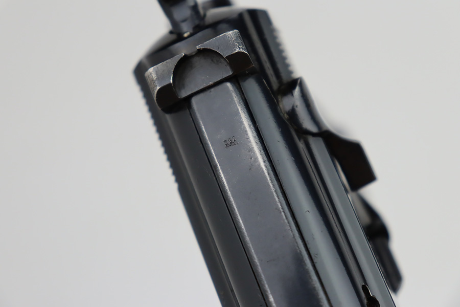 10/18/23 – This is a terrific Walther P.38 issued to the Nazi military in 1941. It comes with the original matching magazine. The gun is all matching, fully functional (including the de-cocker), and has the correct “Eagle 359” Nazi military acceptance proofs on the frame, slide, and small parts. This gun has retained about 98% of its original finish. There is minor muzzle wear, high edge wear on the slide, a few scratches and handling marks on the barrel (and some other areas), an area of wear under the trigger guard, and light oxidation on the front strap. Excellent grips, which are matching numbered to the pistol. Mint bore.