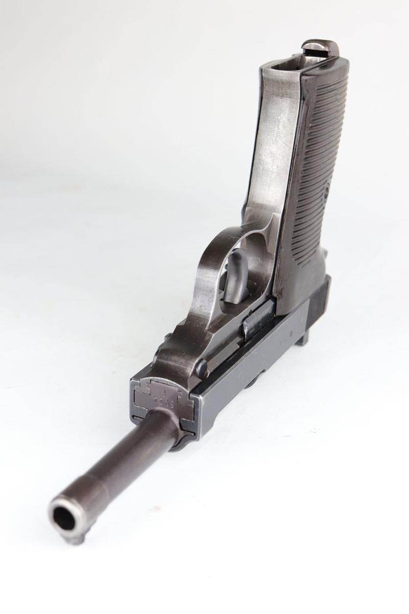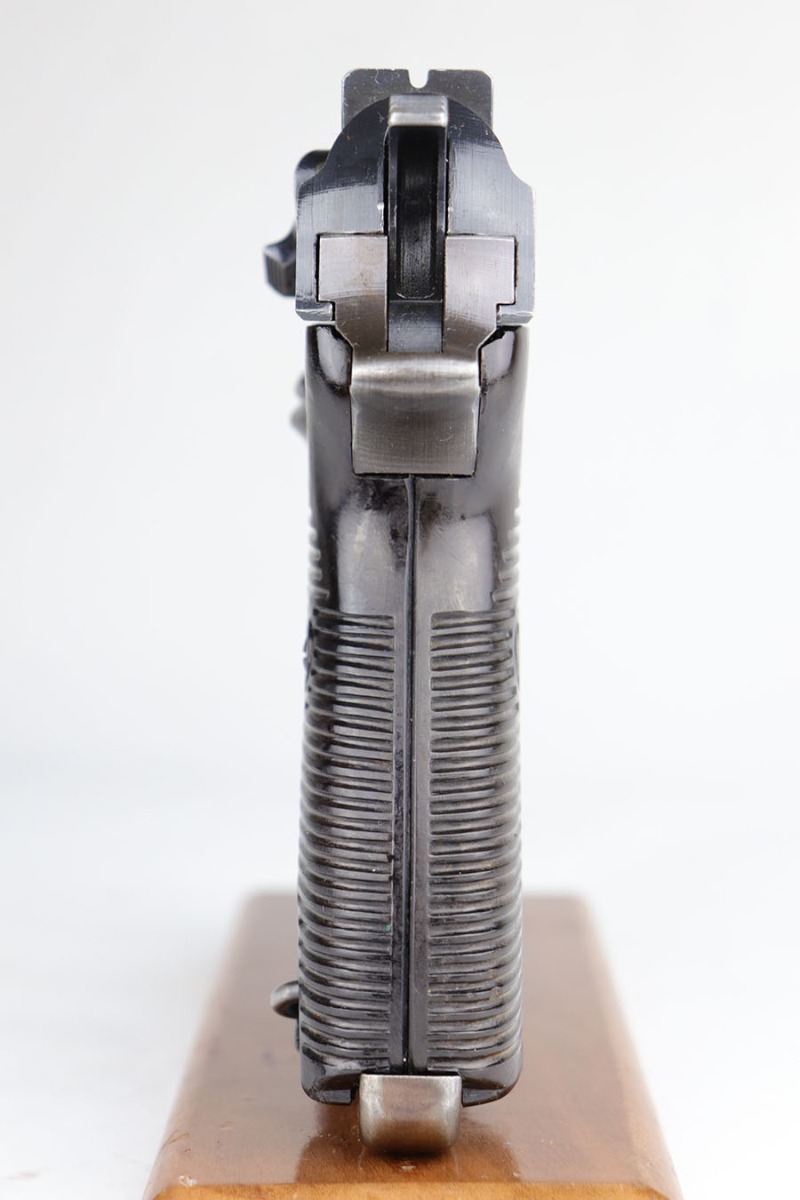 4/29/20 – This is an all matching and original Walther P.38 from November of 1941, including the magazine! This is a third variation ‘ac 41’ with military blue. All the small parts correctly have the Walther E/359 proof, including the grips. Pistol has a very nice profile but most of the finish loss is on the front strap. There is also a series of small scratches on the right side of the slide, and a few spots of finish loss on the rounded portion of the left side of the slide. Excellent grips and minty bore. Good mechanics, including de-cocker.
