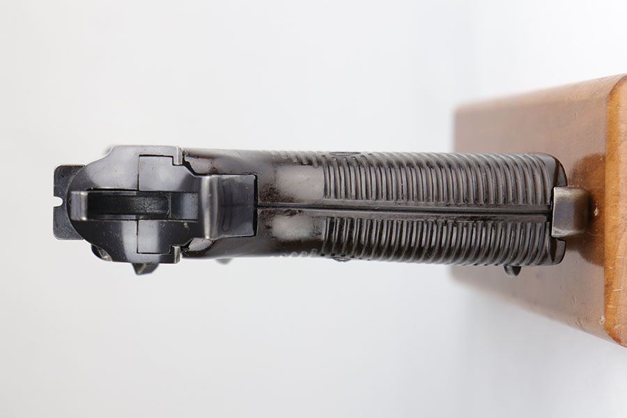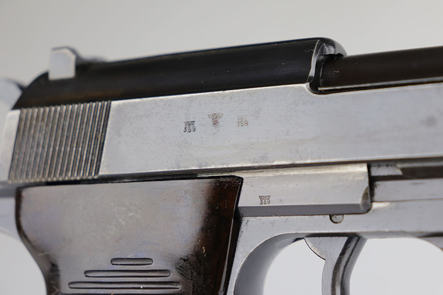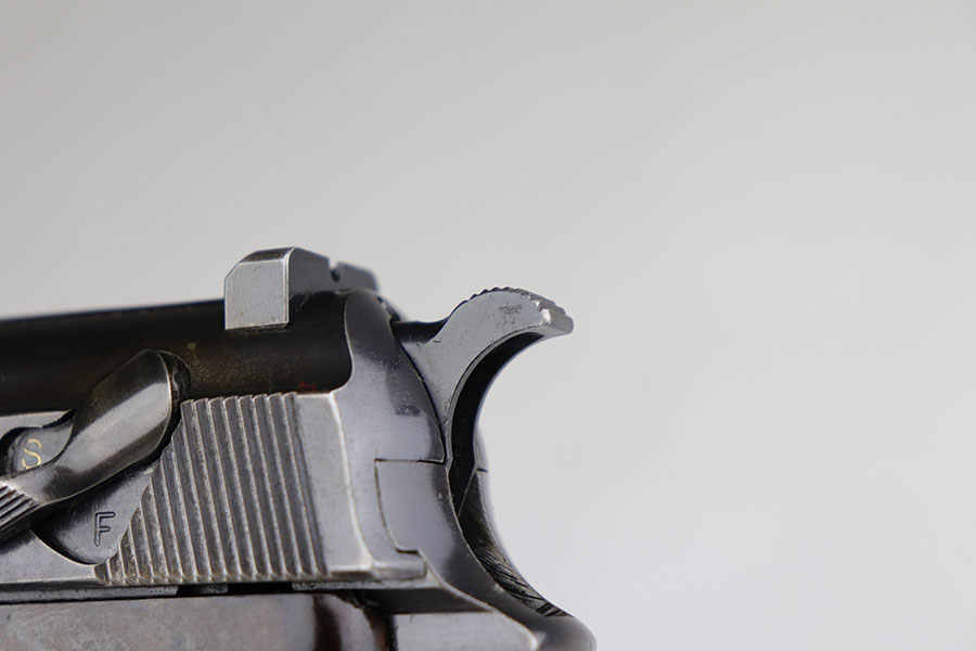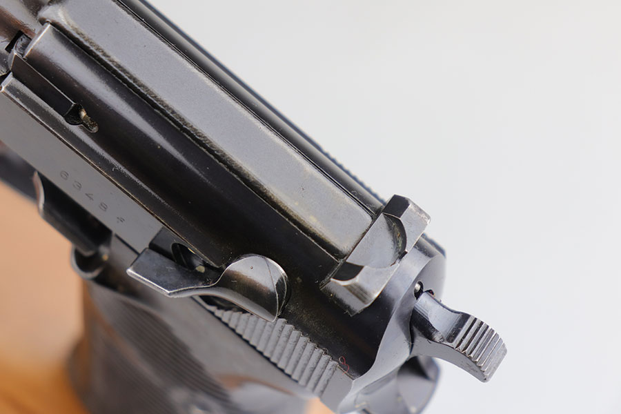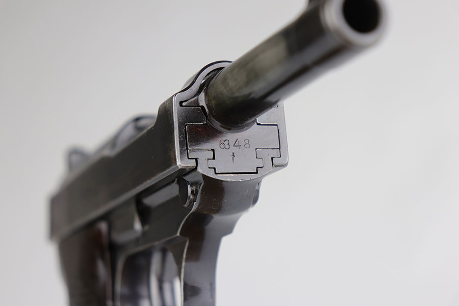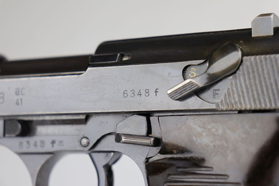 7/17/20 – Made in August of 1941, this is a Walther P.38 with original matching magazine. It’s a second variation pistol with high-polish blue rating at 80-85%. Standard high edge wear with some patina and oxidation on both sides of the slide, but majority of the finish loss is on the right side of the barrel and the front strap. Small parts are all E/359 marked, including the grips. Bore is excellent. Pistol is correct mechanically, including de-cocker.