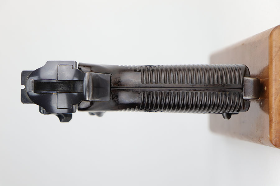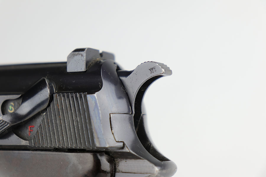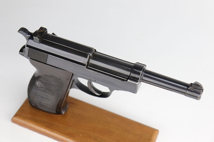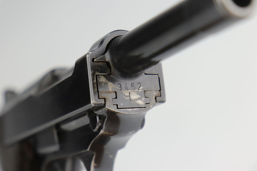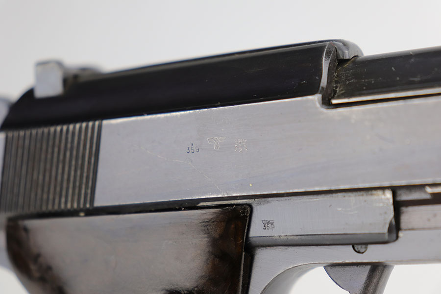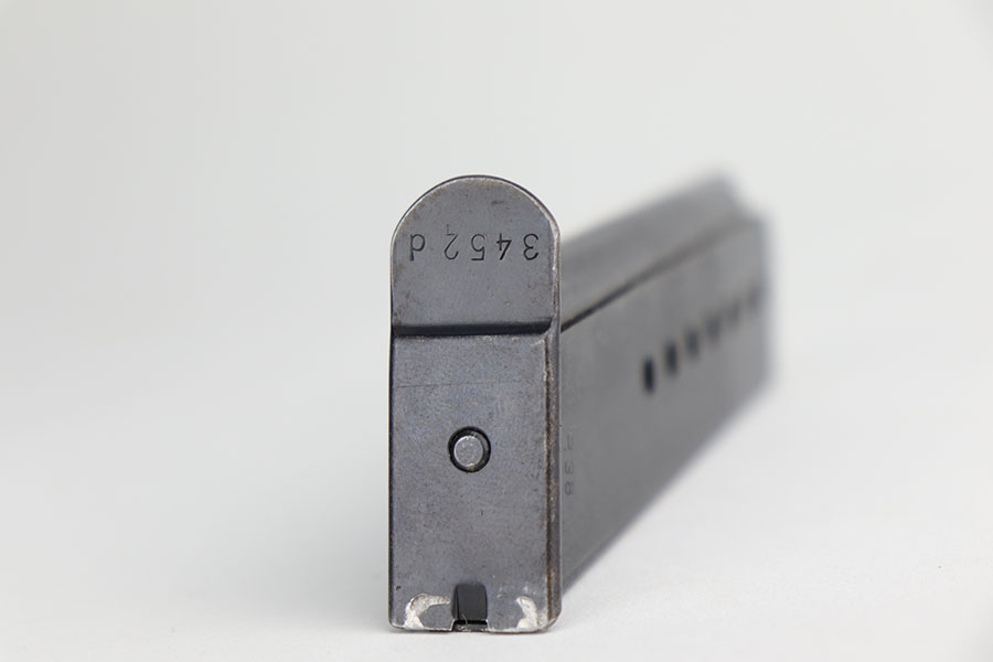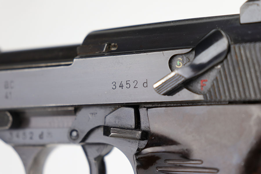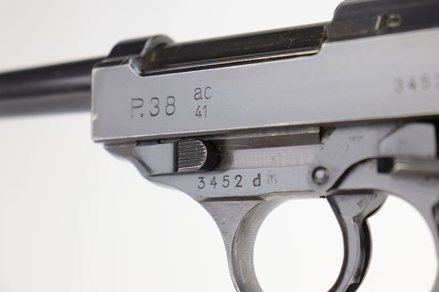 9/16/20 – This is an excellent Walther P.38 from June of 1941, with original matching magazine. All small parts, including the grips, correctly have E/359 proofs. Excellent profile view with some standard high edge wear on slide and muzzle. Also some finish loss on the trigger guard, front strap and underside of barrel. Minty bore. Good mechanics, including de-cocker. Grips are in great condition too.