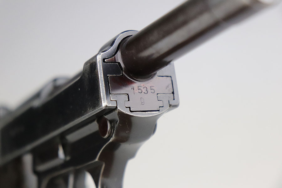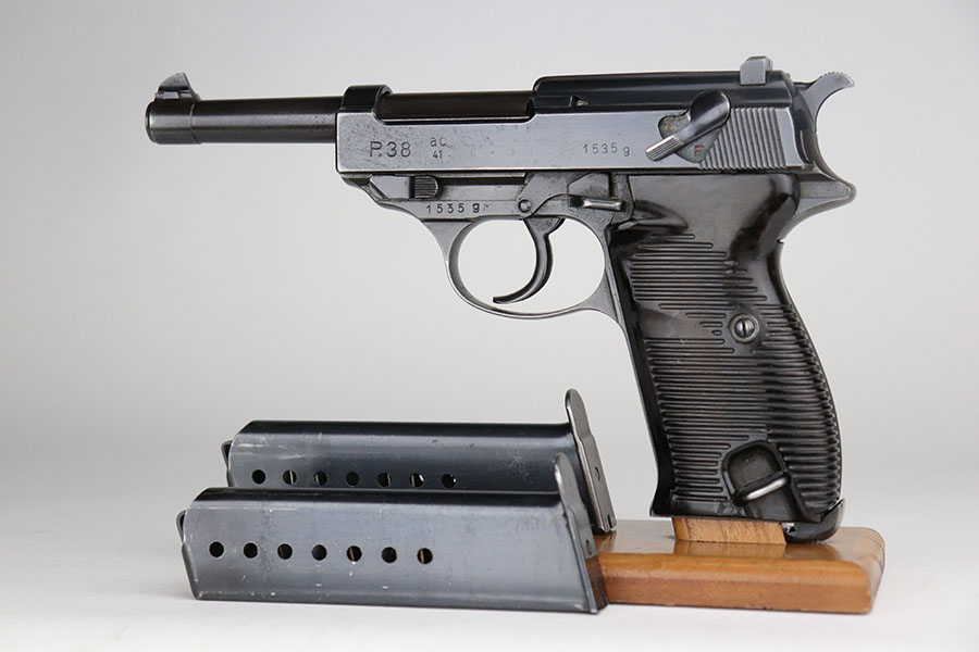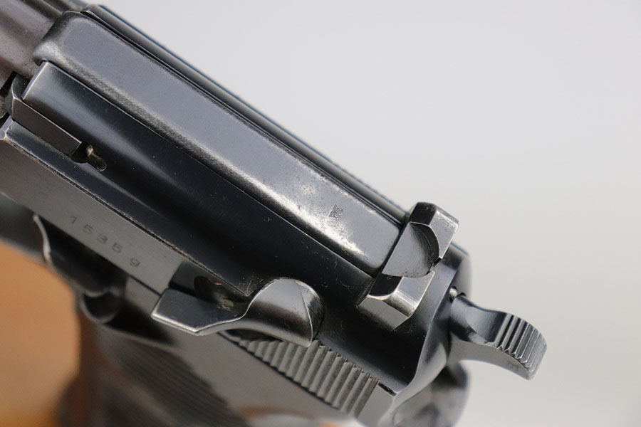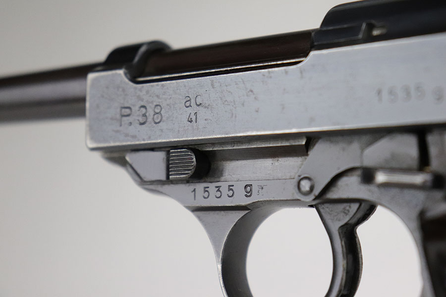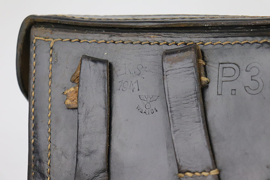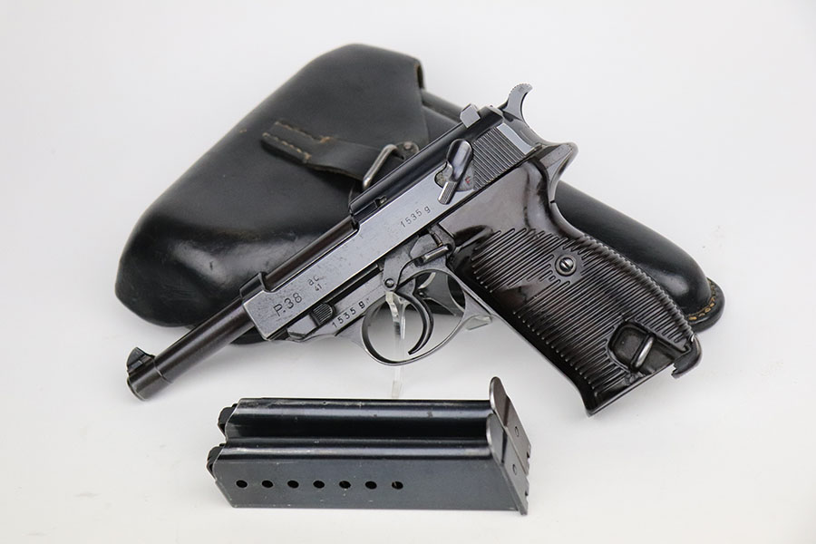 8/13/20 – This is a complete Walther P.38 rig from September of 1941. It’s a second variation pistol with high-polish blue but no ‘ac’ proof on trigger guard. The pistol has about 85-90% of the original blue remaining with thinning on the front strap, barrel and slide edges. The left side of the slide also has some freckling and oxidation throughout. Excellent bore and good mechanics. E/359 proofs on all small parts, including the grips. One magazine is Mauser made, the other is Spreewerk. Excellent and rare 1941 dated holster. It’s a hardshell example with crisp waffenamt and E.K.St. maker mark.