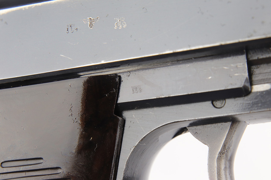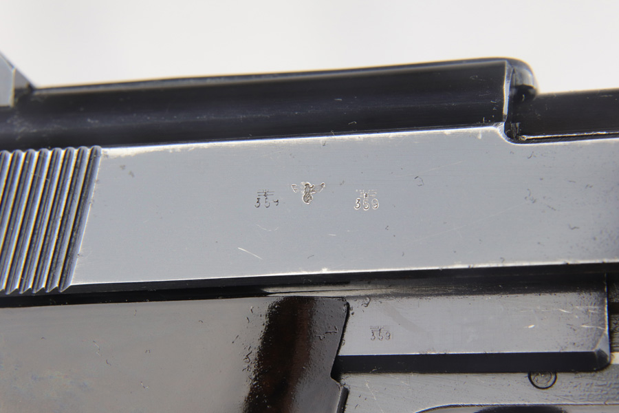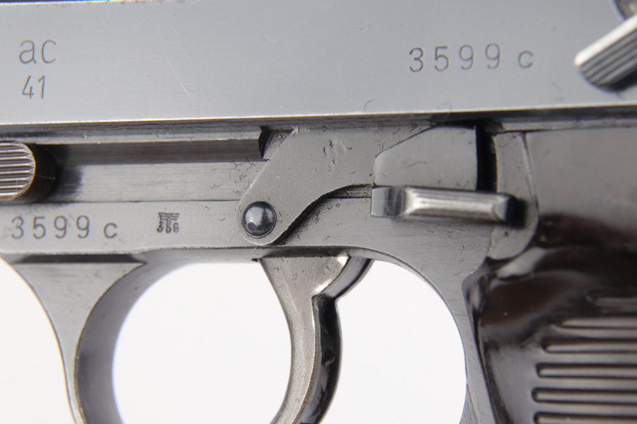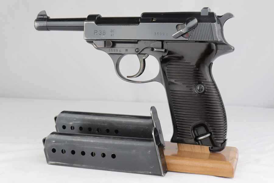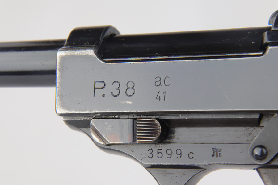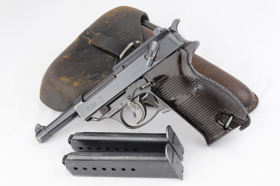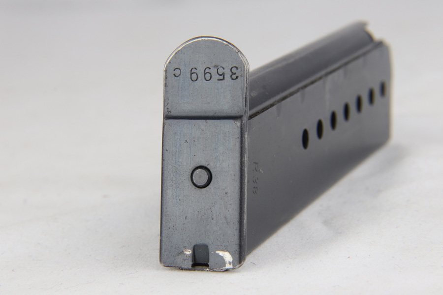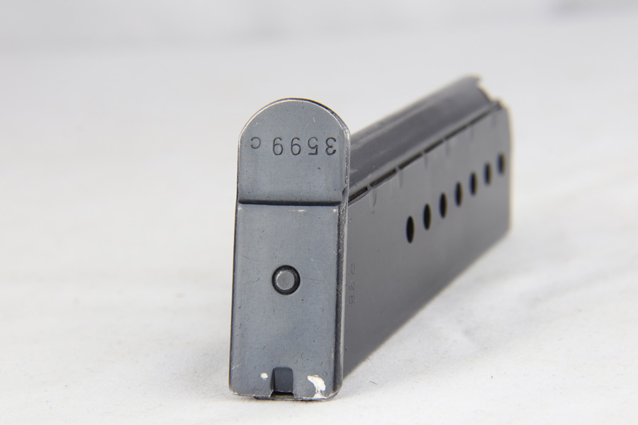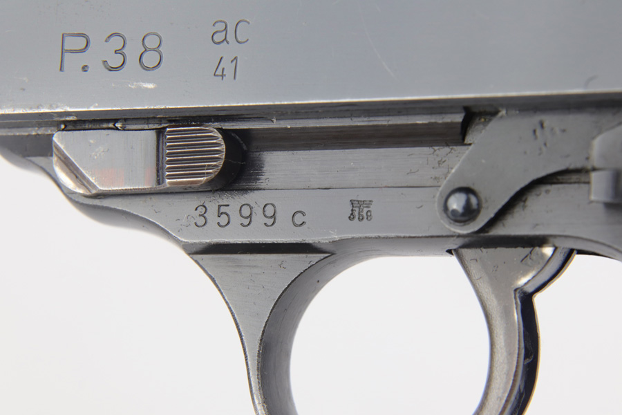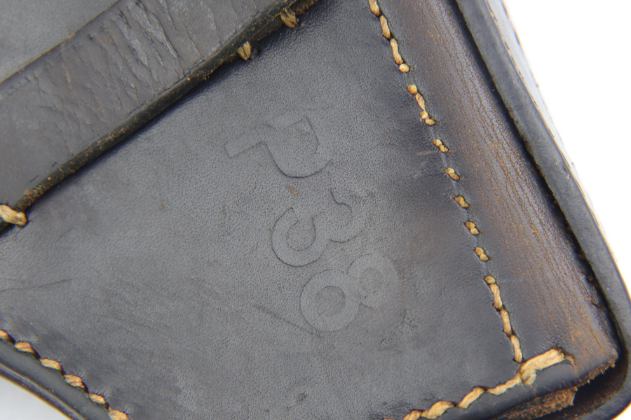 2/4/19 – This is an all matching and original Walther P.38 rig from 1941 with both matching magazines! This is a second variation pistol with high-polish finish but no ‘ac’ proof on trigger guard. The finish rates at about 93-95% with minor finish loss near the muzzle and front edges of the slide, and some rub wear on the front strap/trigger guard. All small parts are waffen marked, including the grips. The early magazines correctly have two waffen marks on the spine. Bore is minty, and looks like it’s barely been used. Holster shows some age and scuffs but no major flaws, and it is 1941 dated and waffen marked.