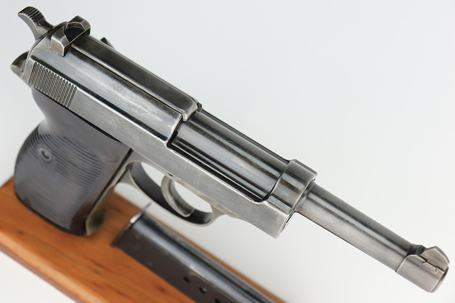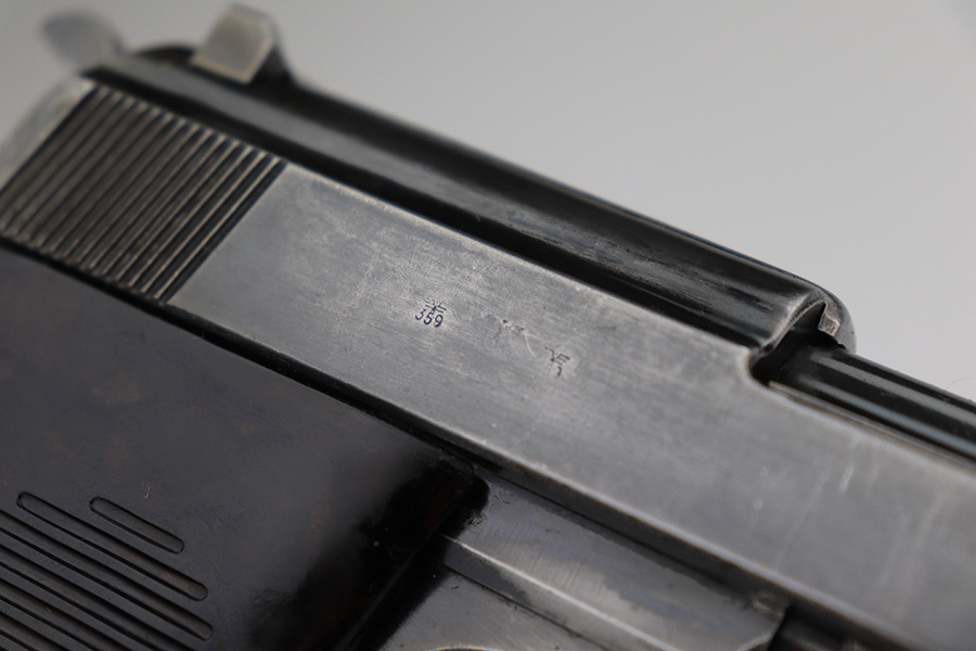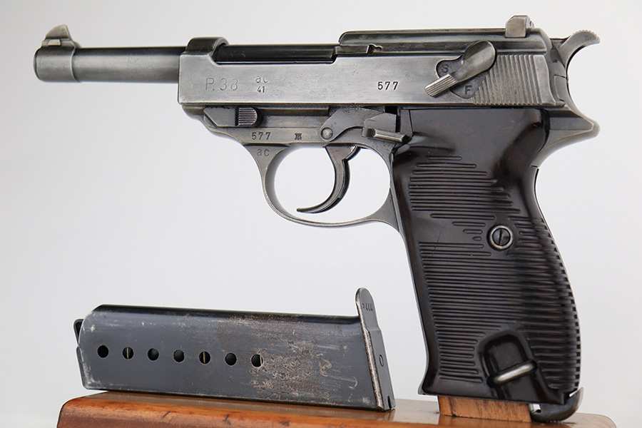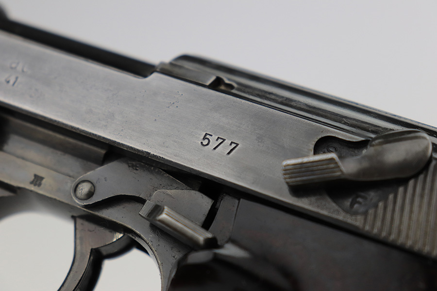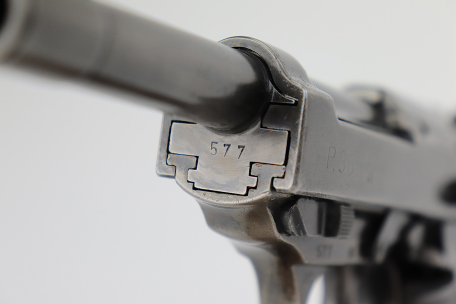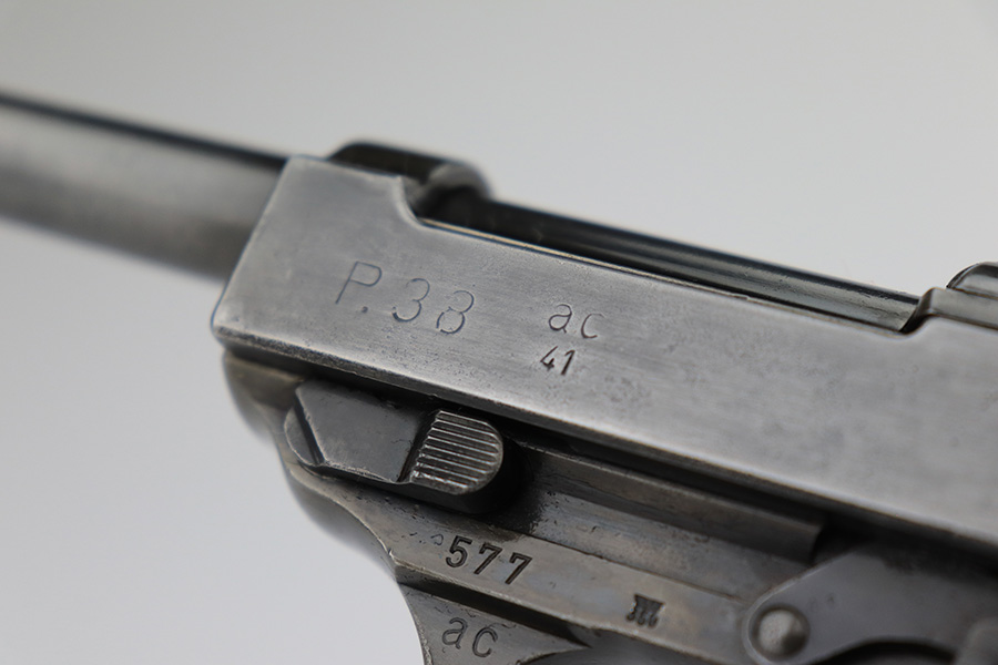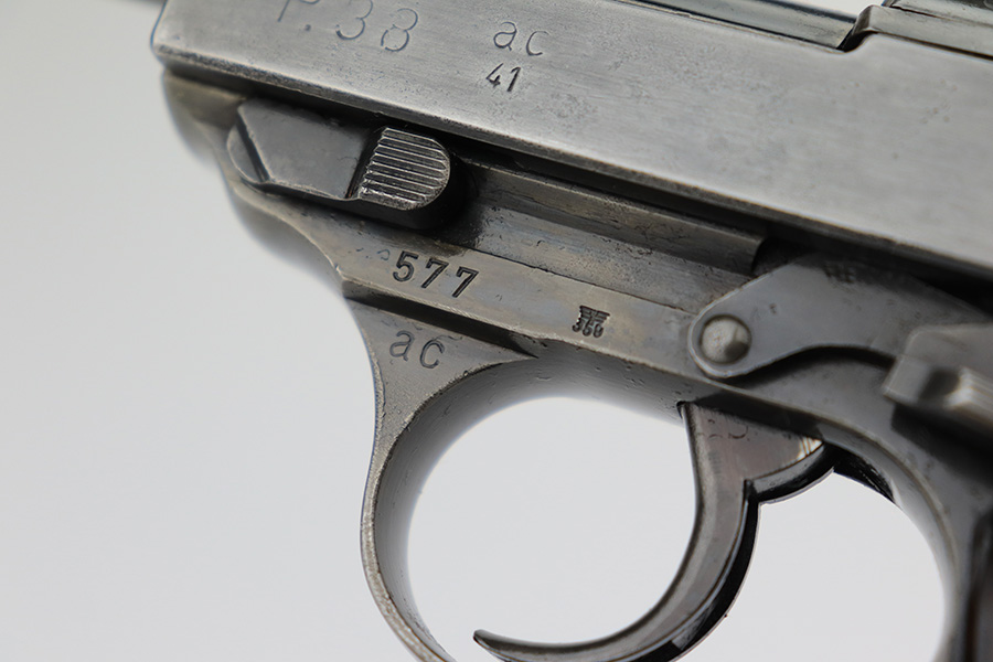 3/6/2023 – This is an scarce example of a very early “AC 41” Walther P.38 issued to the Nazi military in 1941. It is a first-variation pistol with “ac” on the trigger guard and has a particularly early “577” serial number. This indicates that this was the 577th out of the 24,800 made of this variation. It is all matching and has the proper “Eagle 359” military acceptance proofs throughout, even on the small parts. The high-polish finish on this one is mostly gone, and the markings are slightly faded from use/wear. Comes with excellent Walther grips that are “Eagle 359” proofed but not numbered. Also comes with a numbered Walther magazine but it is mismatched to this pistol. It is a correct, early Walther mag with two E/359 spine proofs though. The bore is in significantly better condition than the pistol – bright with strong rifling and just a bit of frost in the grooves. Functional safety/de-cocker.