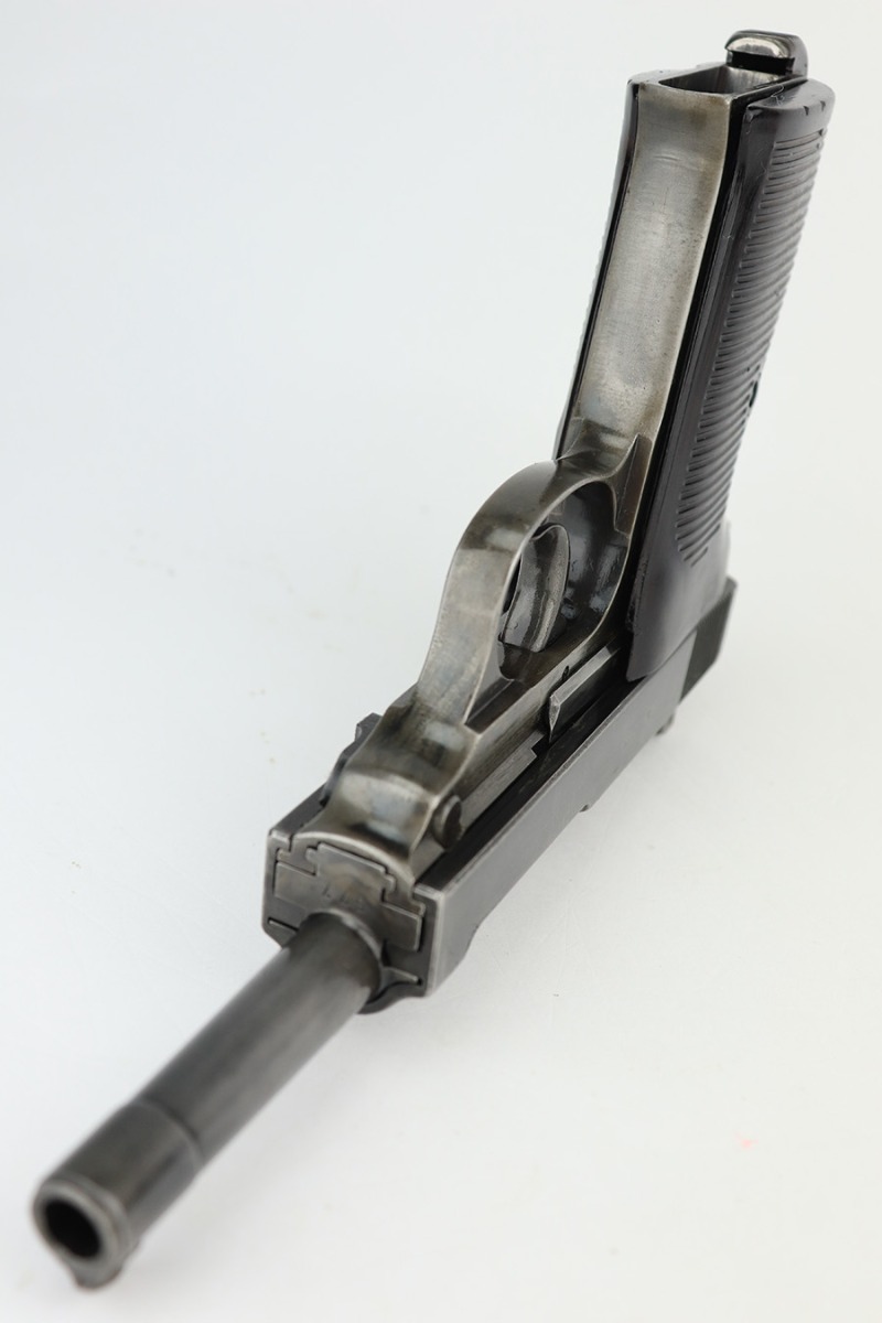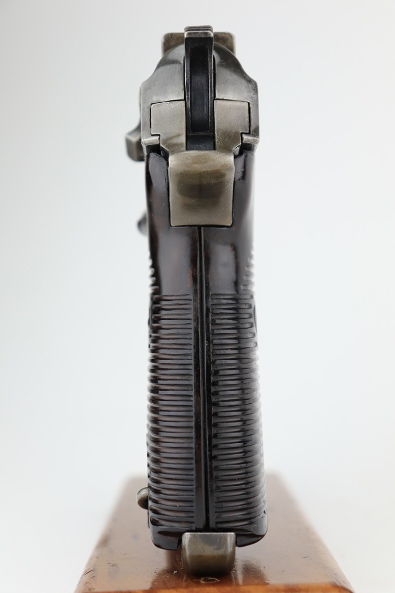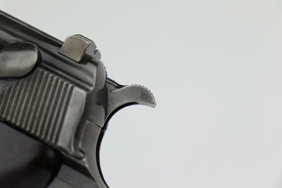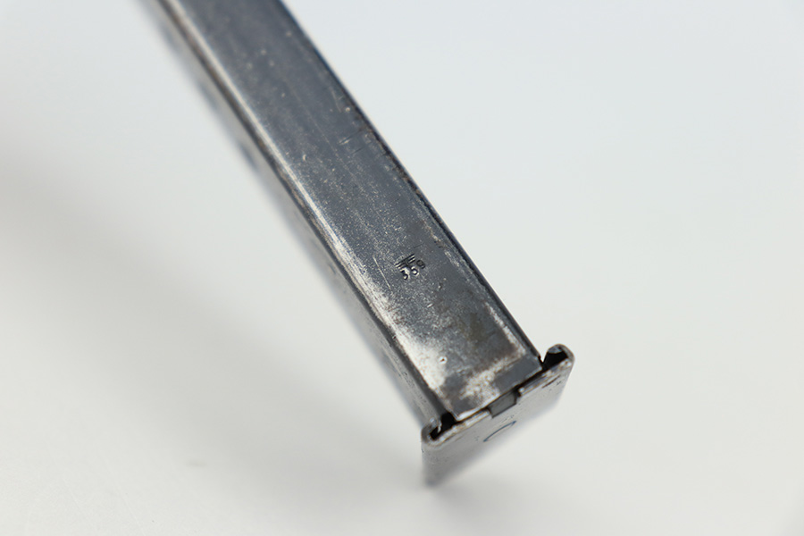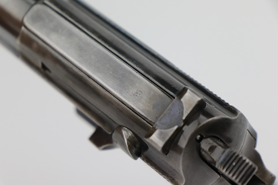 3/6/2023 – This is an scarce example of a very early “AC 41” Walther P.38 issued to the Nazi military in 1941. It is a first-variation pistol with “ac” on the trigger guard and has a particularly early “577” serial number. This indicates that this was the 577th out of the 24,800 made of this variation. It is all matching and has the proper “Eagle 359” military acceptance proofs throughout, even on the small parts. The high-polish finish on this one is mostly gone, and the markings are slightly faded from use/wear. Comes with excellent Walther grips that are “Eagle 359” proofed but not numbered. Also comes with a numbered Walther magazine but it is mismatched to this pistol. It is a correct, early Walther mag with two E/359 spine proofs though. The bore is in significantly better condition than the pistol – bright with strong rifling and just a bit of frost in the grooves. Functional safety/de-cocker.