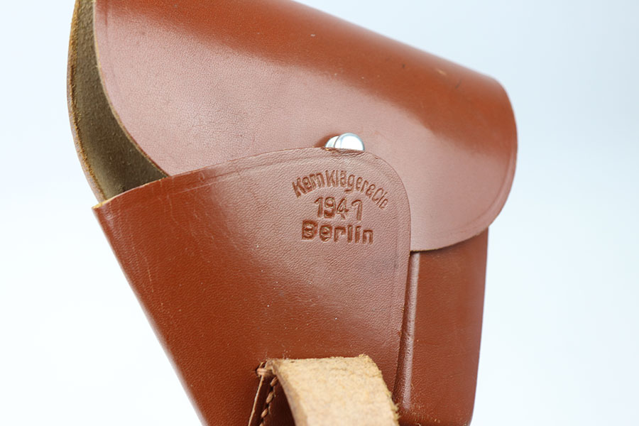 6/4/21 – This is an excellent, near mint example of a 1941 Walther PPK holster by Kern Klager & Cle. Beautiful light brown leather and excellent stitching. Very clean interior leather. Maker stamped under the closure strap and dated 1941.
