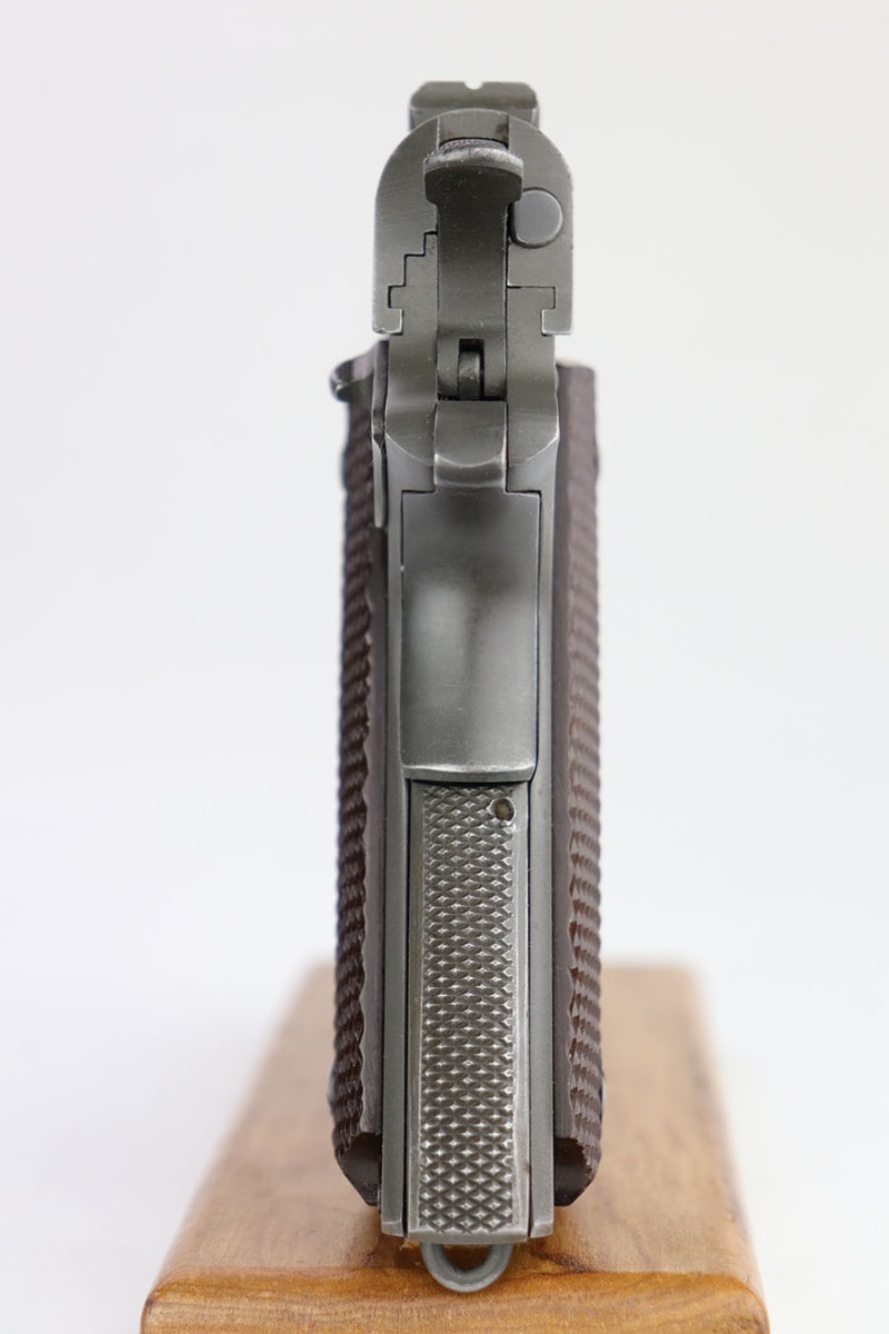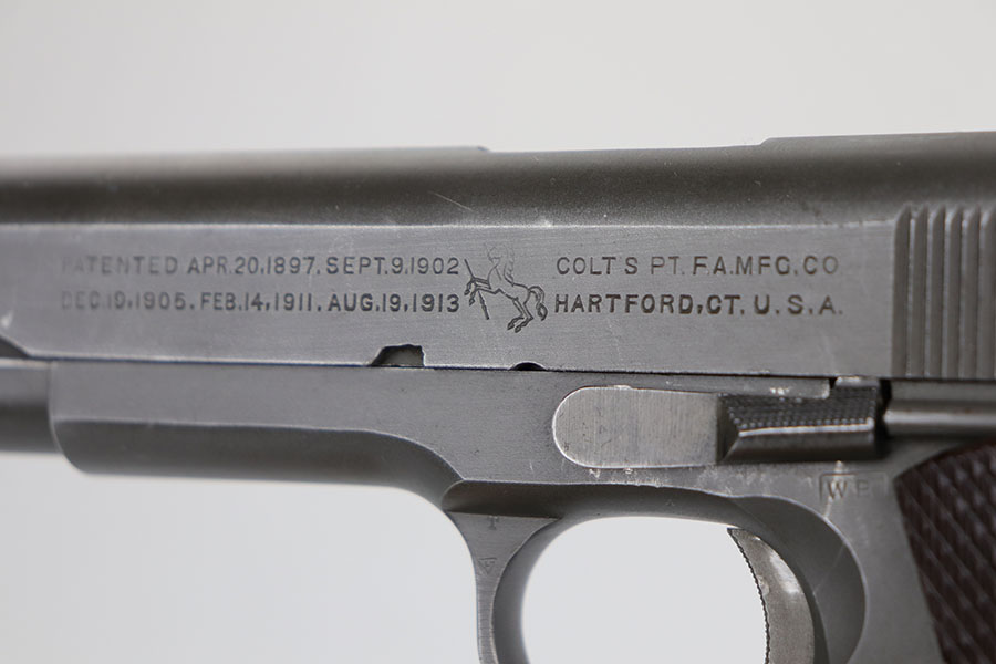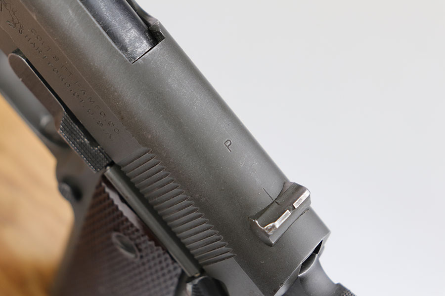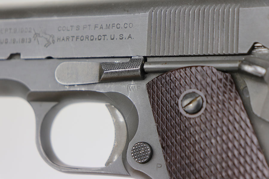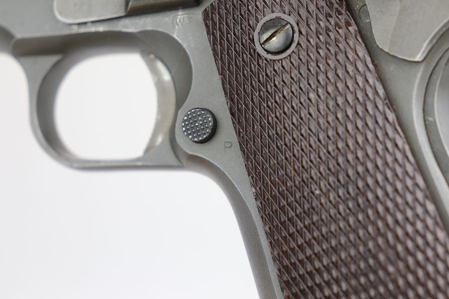 4/1/20 – This is an all original Army Colt 1911A1 from 1942. The pistol has matching slide and frame, with proper Colt barrel with ‘G’ under lug. Correct inspector proofs include P on slide and frame, and WB inspector mark on frame. The pistol has a bit of thinning on the front strap, left side edges and right side slide near ejection port. There’s also a minor spot of discoloration on rear left of slide. Bore is shiny and strong. Excellent grips. ‘S’ marked magazine and C-R marked on the bottom of the magazine. Overall a very nice example of a desirable WB marked 1911A1.