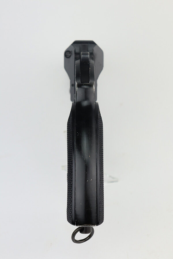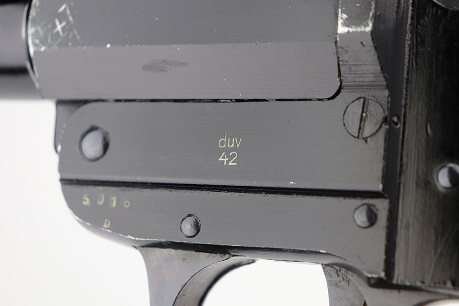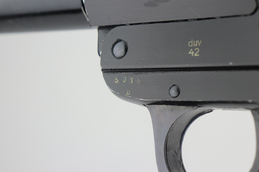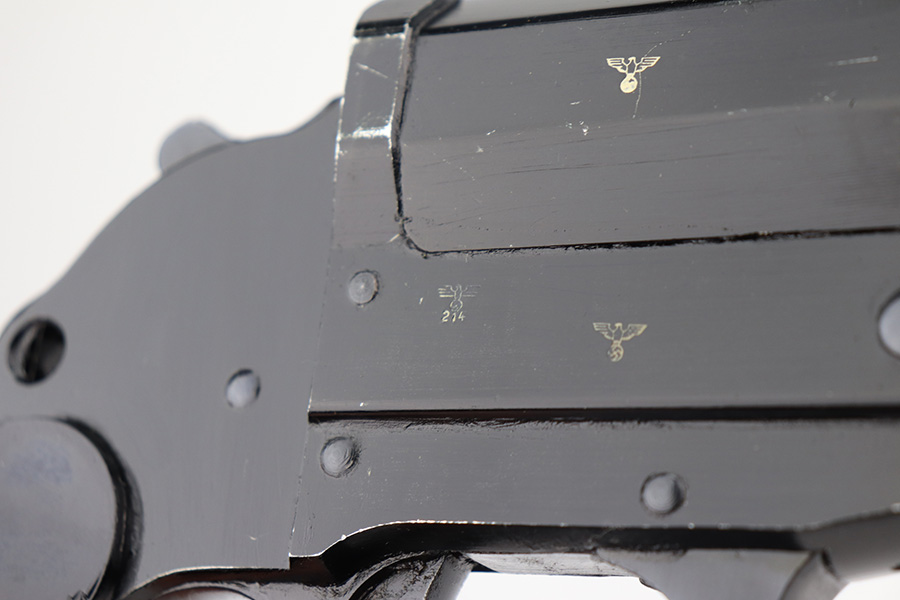 6/8/21 – This is a very nice example of a Nazi Flare Gun made by Berlin-Lubecker in 1942. It has a “duv 42” factory code and has the proper waffen proofs. Fully functional. It has retained most of its finish with scratchy wear on the high edges of the top half of the gun and on the barrel near the muzzle. Excellent bakelite grips. Lanyard loop intact. The bore is excellent and shiny. There is some thick grease inside the action and in the bore – could benefit from a good cleaning.