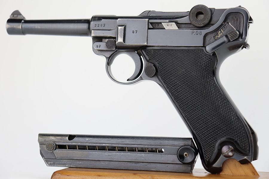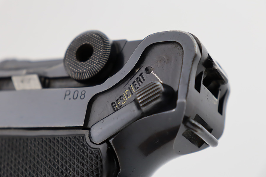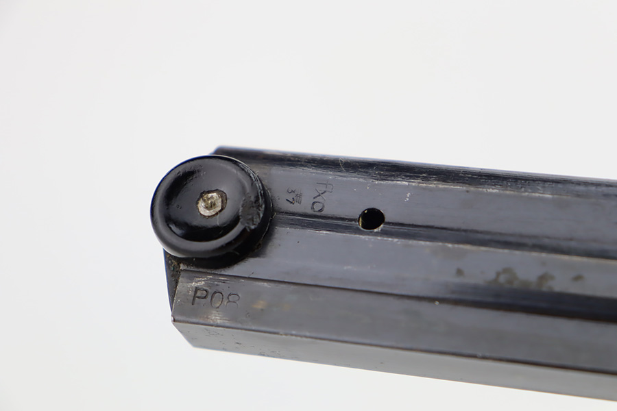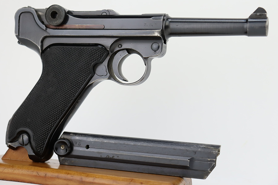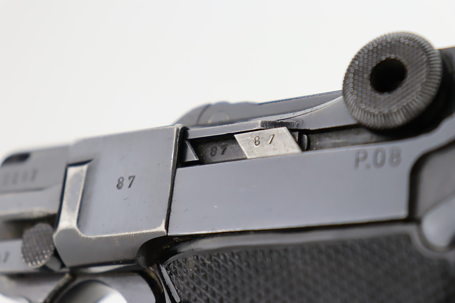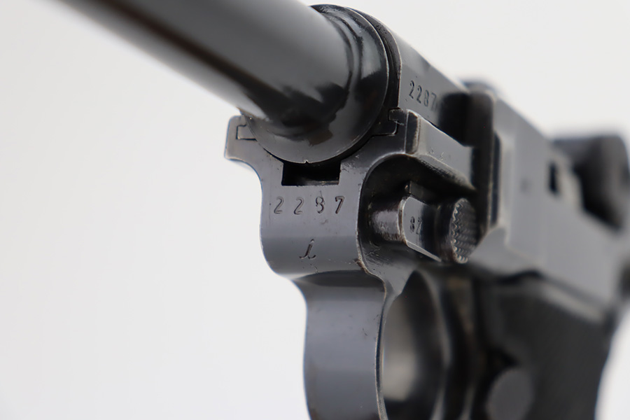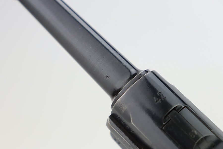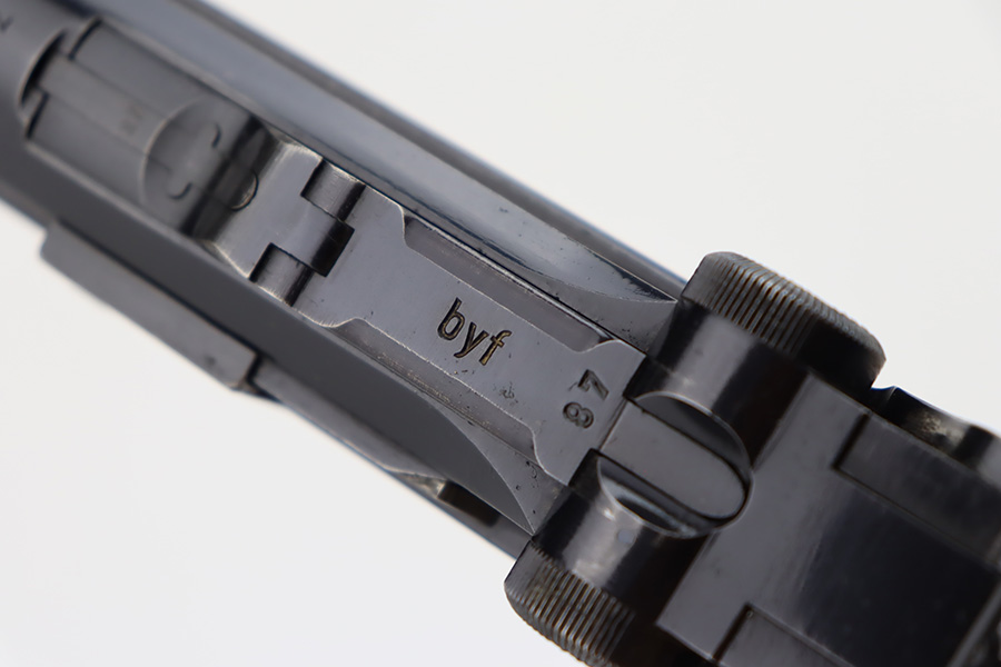 10/11/23 – This is a BYF 42 “Black Widow” Mauser Luger issued to the Nazi military in 1942. It is all matching and has the proper “Eagle 135” military acceptance proofs. It comes with a set of original black bakelite “Black Widow” grips and an original “Black Widow” magazine. It has retained somewhere between 85-90% of its original finish. There is spotty wear on the grip straps and areas of minor wear around the muzzle, on the side plate, and on the side rails. The bore has great rifling, but there is light spotty surface oxidation throughout.