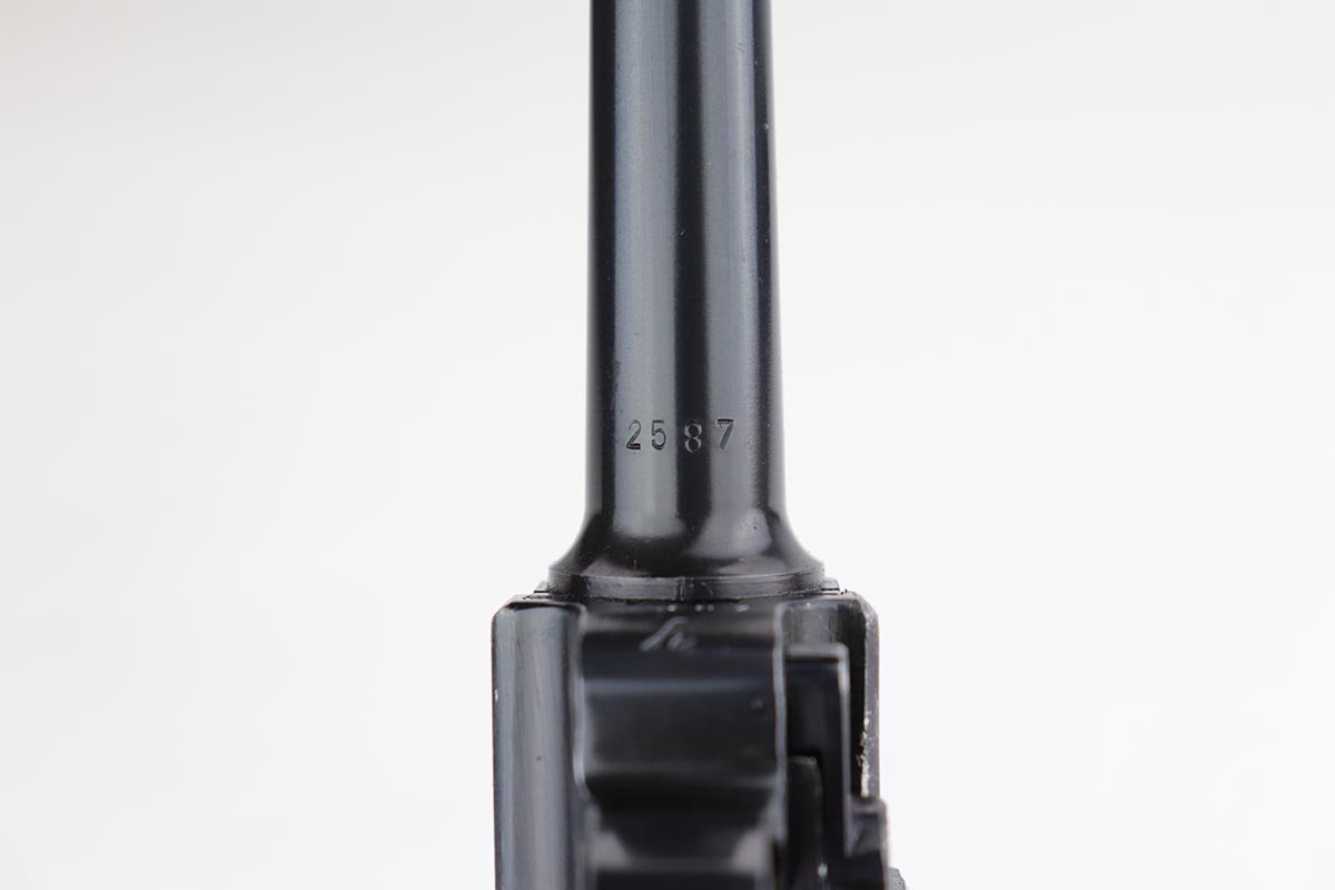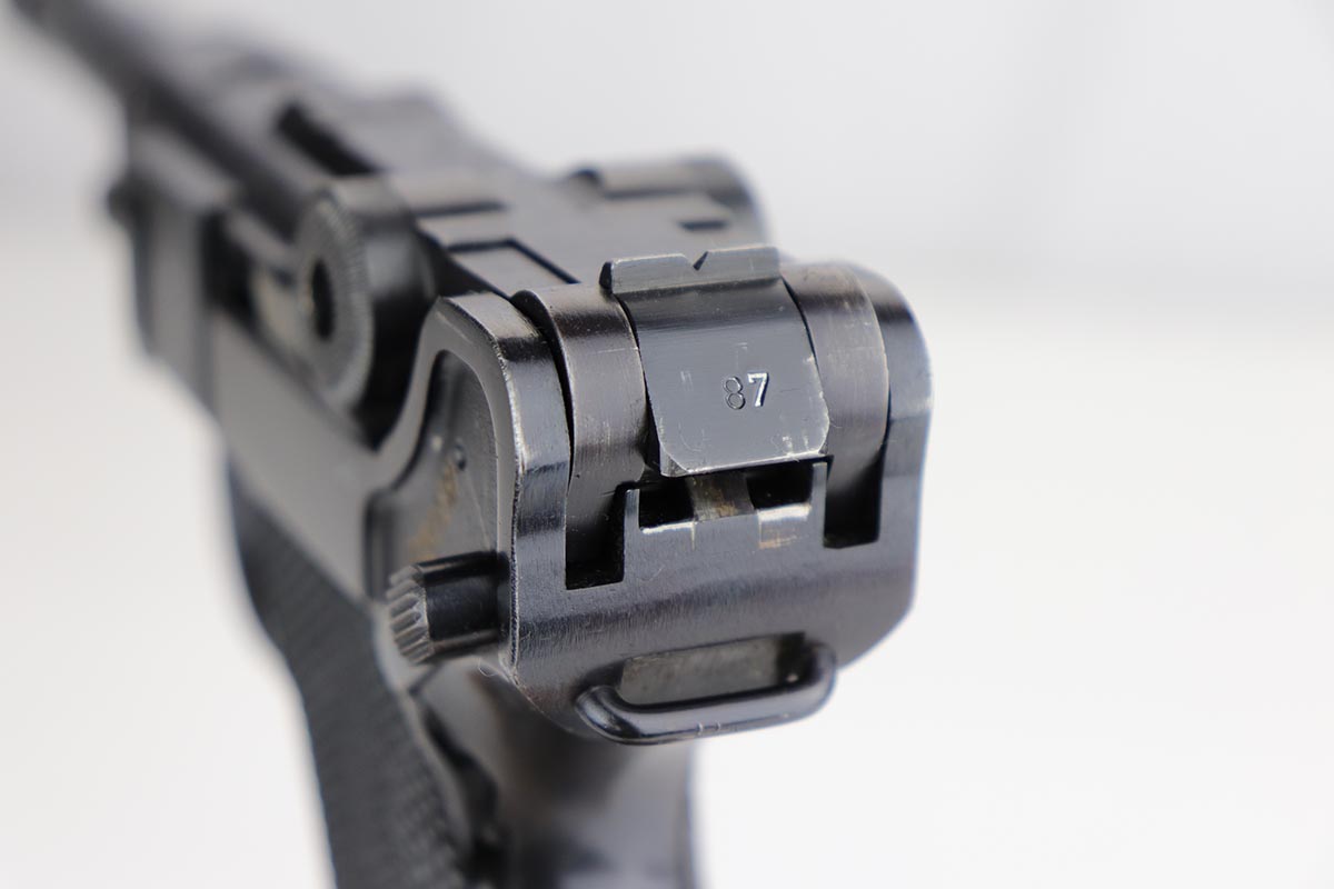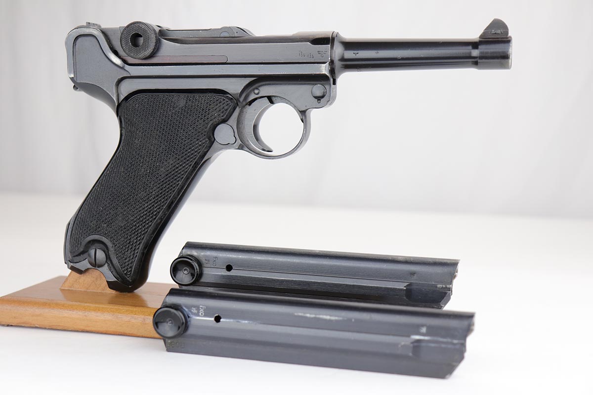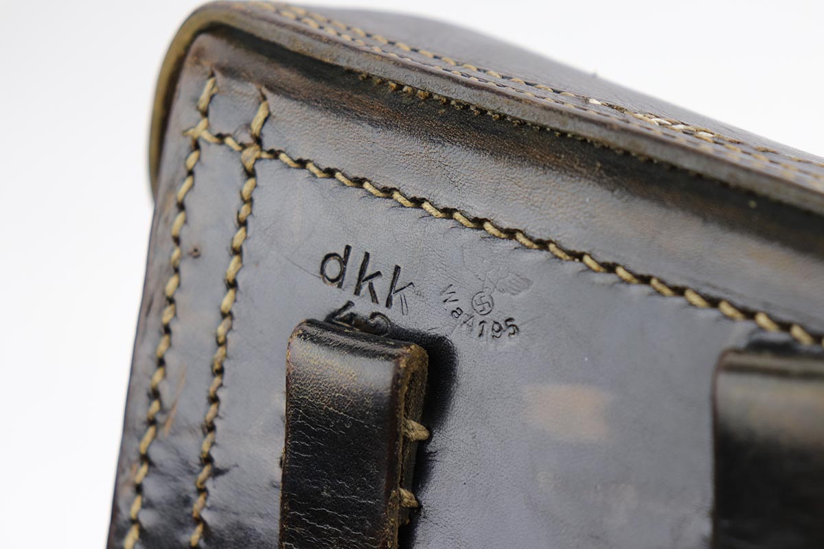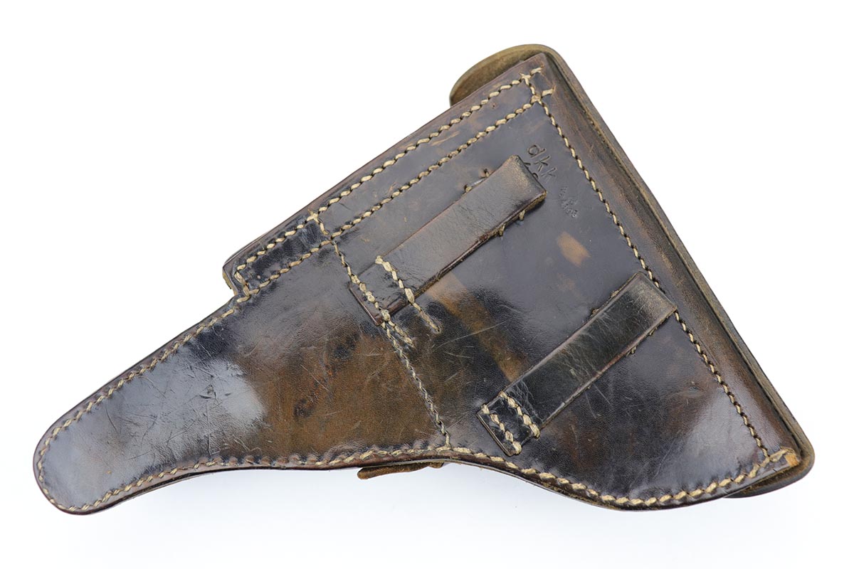 12/4/19 – This is a very nice and all original Black Widow Mauser Luger rig from 1942, with spare magazine and 1942 dated holster. The gun has about 95% of the original blue remaining, with minor rub wear on muzzle and sideplate, a little bit of finish loss and patina on the straps, and one spot of finish loss on the right ear of the frame. Original Black Widow style grips are in good shape, though the right panel does have some dings and handling wear. Rig has a total of two correct Black Widow style magazines, both in excellent condition. The holster has a ‘dkk’ maker mark and sharp waffenamt. It’s in very good shape with some obvious signs of age but leather is firm. The tool pouch does have a small tear in it.