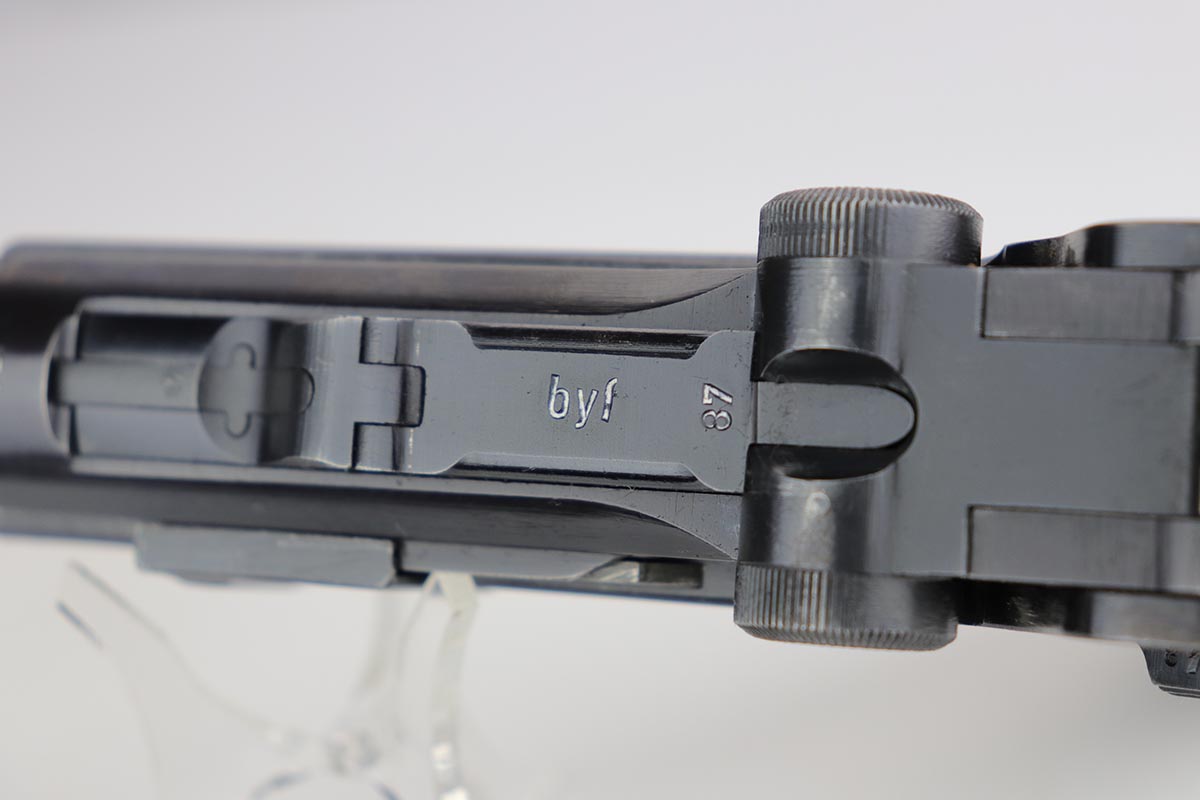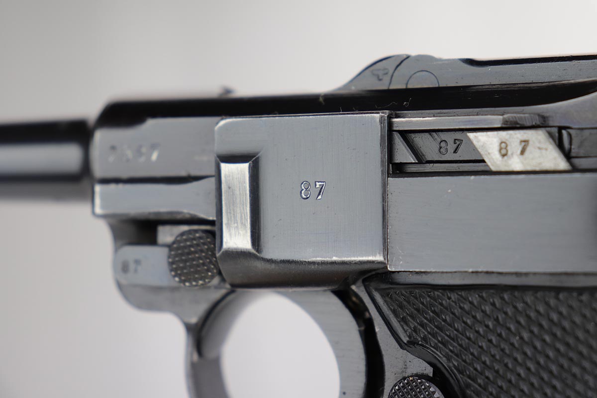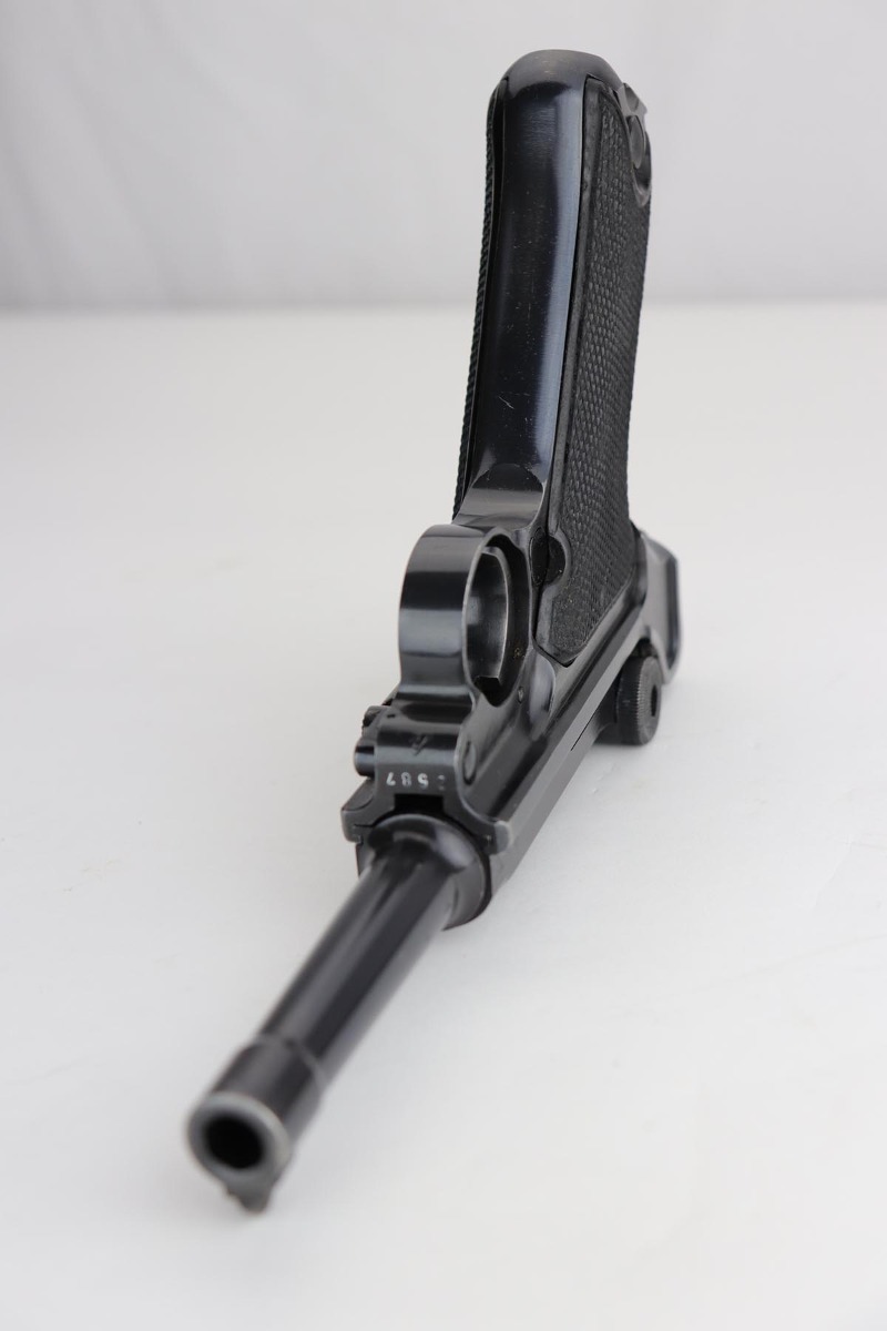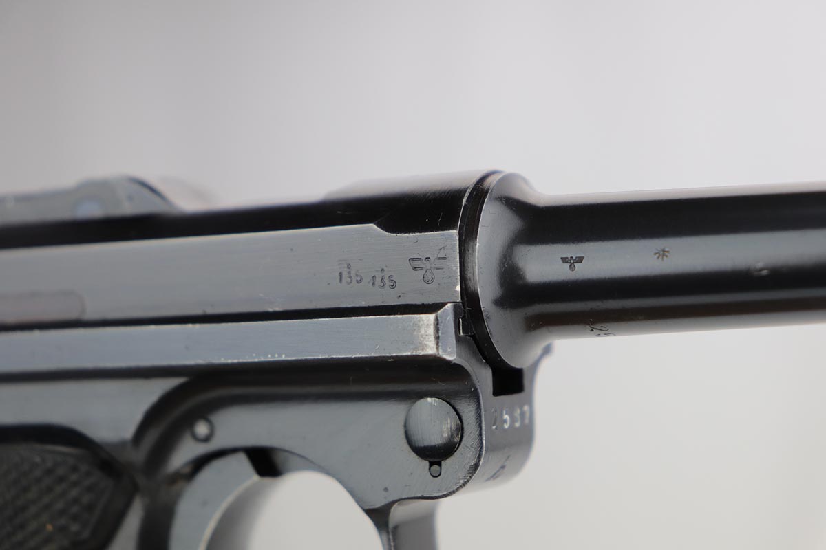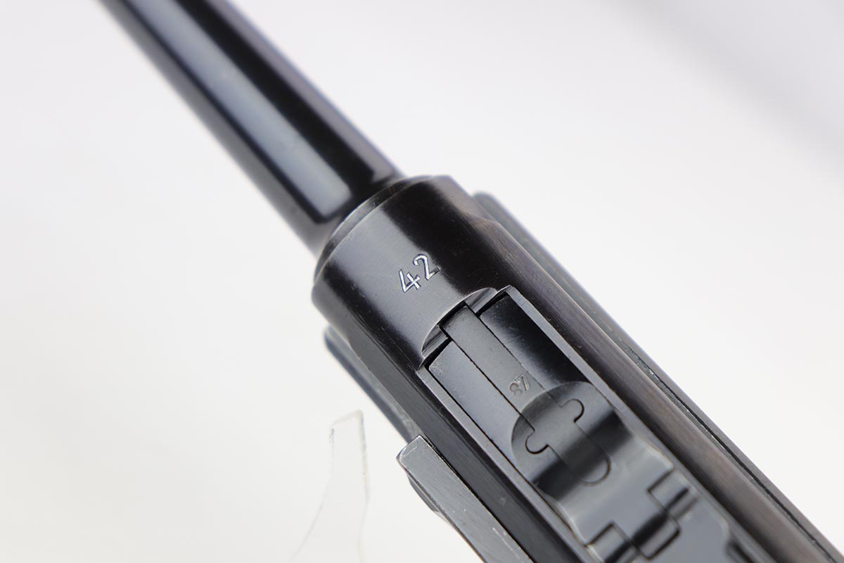12/4/19 – This is a very nice and all original Black Widow Mauser Luger rig from 1942, with spare magazine and 1942 dated holster. The gun has about 95% of the original blue remaining, with minor rub wear on muzzle and sideplate, a little bit of finish loss and patina on the straps, and one spot of finish loss on the right ear of the frame. Original Black Widow style grips are in good shape, though the right panel does have some dings and handling wear. Rig has a total of two correct Black Widow style magazines, both in excellent condition. The holster has a ‘dkk’ maker mark and sharp waffenamt. It’s in very good shape with some obvious signs of age but leather is firm. The tool pouch does have a small tear in it.