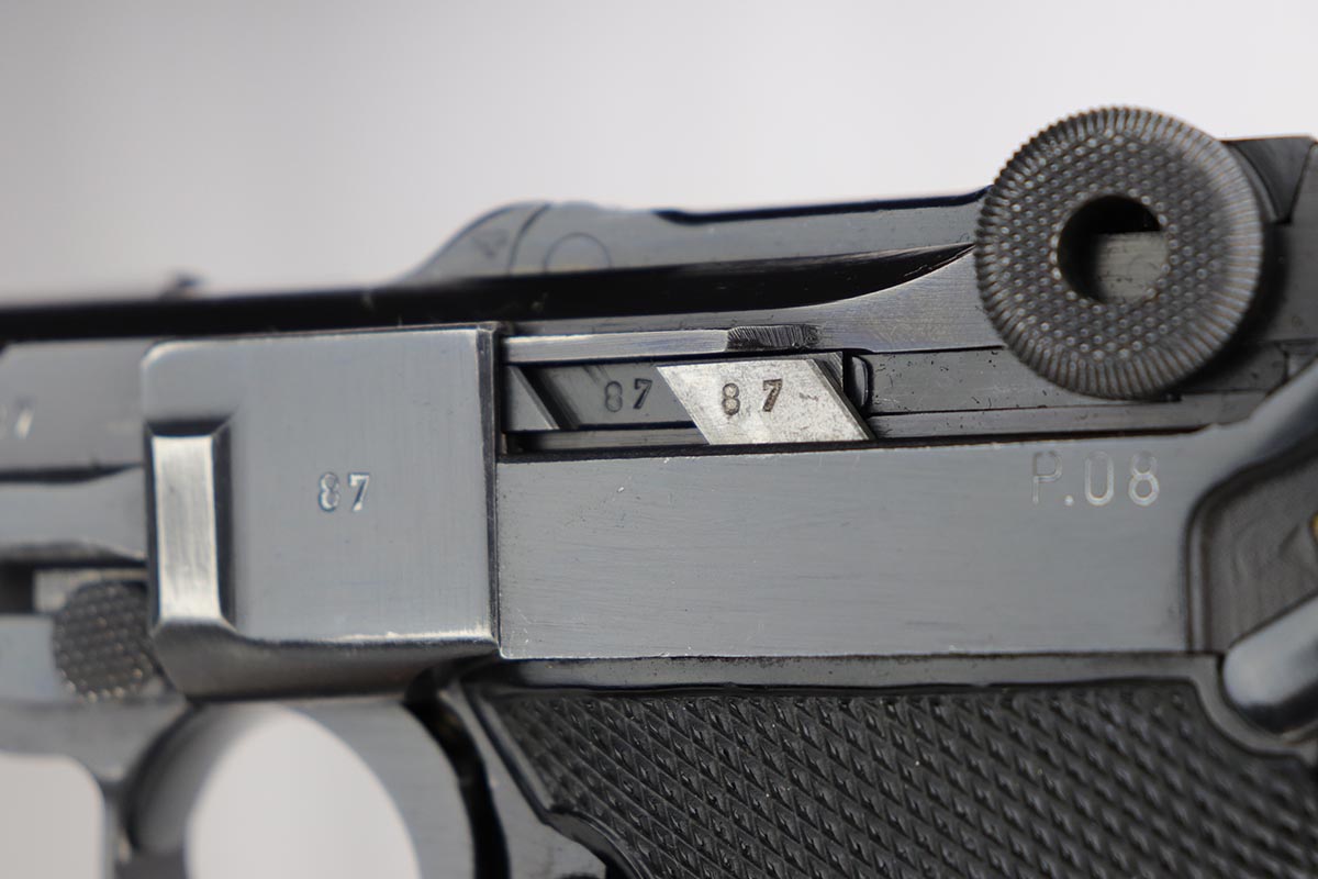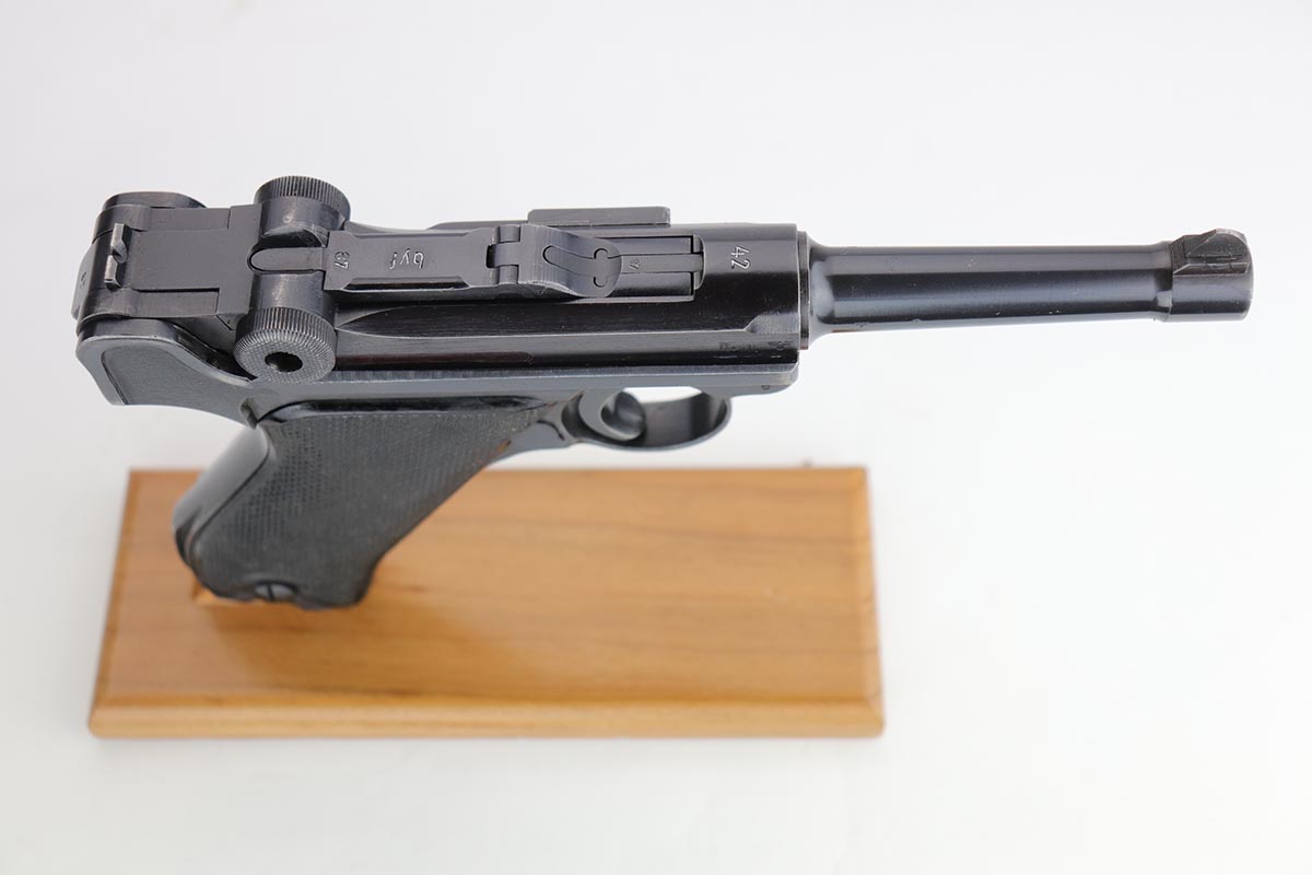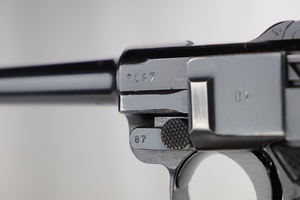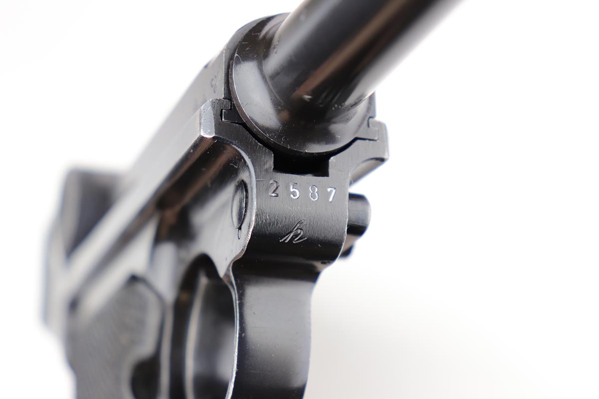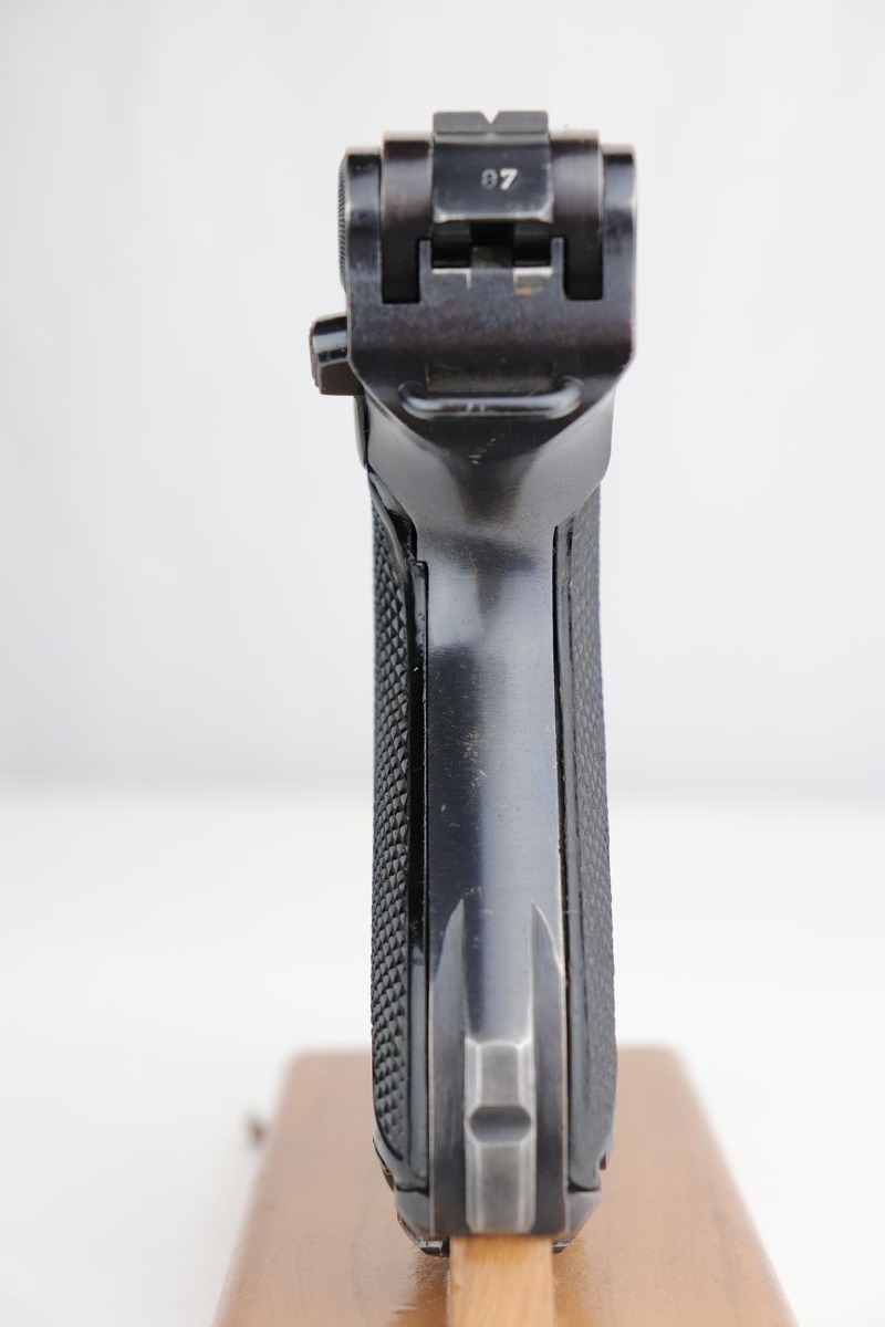 12/4/19 – This is a very nice and all original Black Widow Mauser Luger rig from 1942, with spare magazine and 1942 dated holster. The gun has about 95% of the original blue remaining, with minor rub wear on muzzle and sideplate, a little bit of finish loss and patina on the straps, and one spot of finish loss on the right ear of the frame. Original Black Widow style grips are in good shape, though the right panel does have some dings and handling wear. Rig has a total of two correct Black Widow style magazines, both in excellent condition. The holster has a ‘dkk’ maker mark and sharp waffenamt. It’s in very good shape with some obvious signs of age but leather is firm. The tool pouch does have a small tear in it.